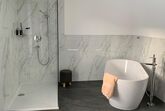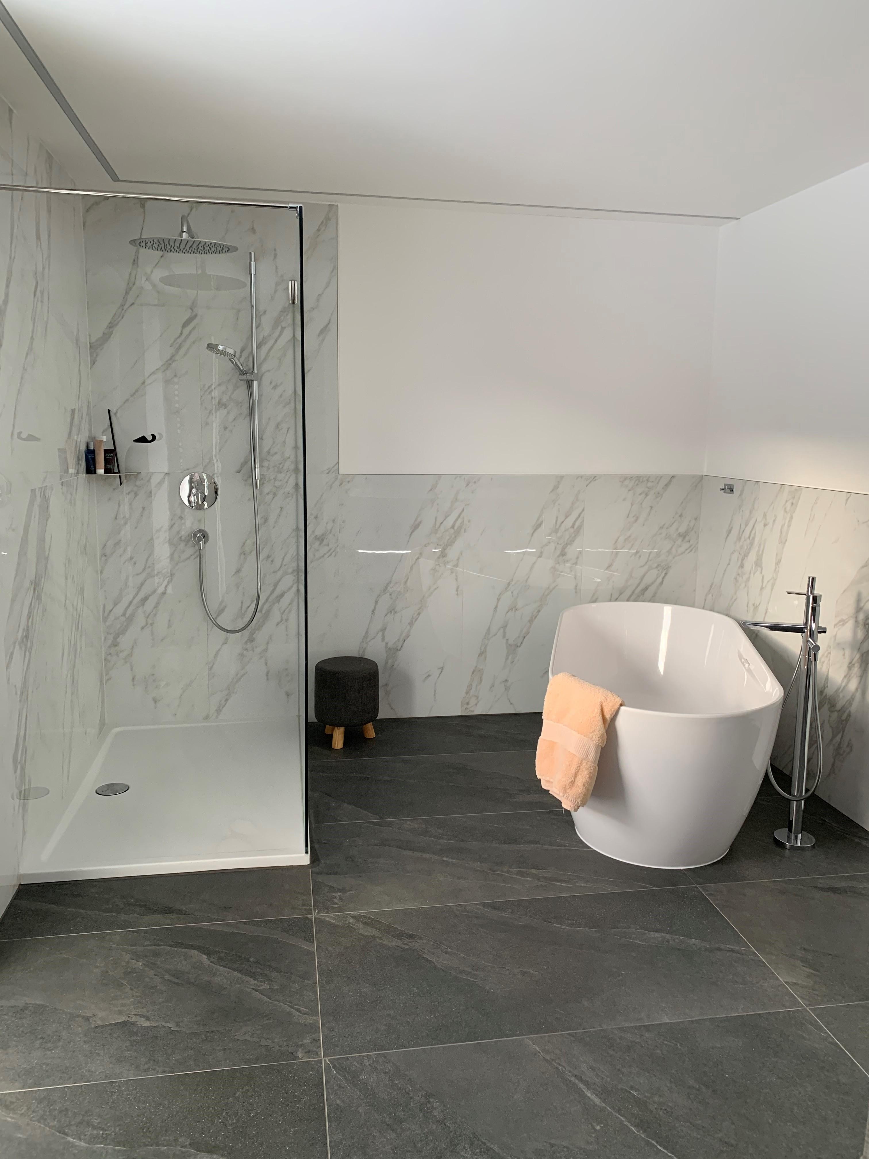Badzimmer mit freistehender Badewanne, Regendusche, Doppelwaschbecken, 2 Toiletten