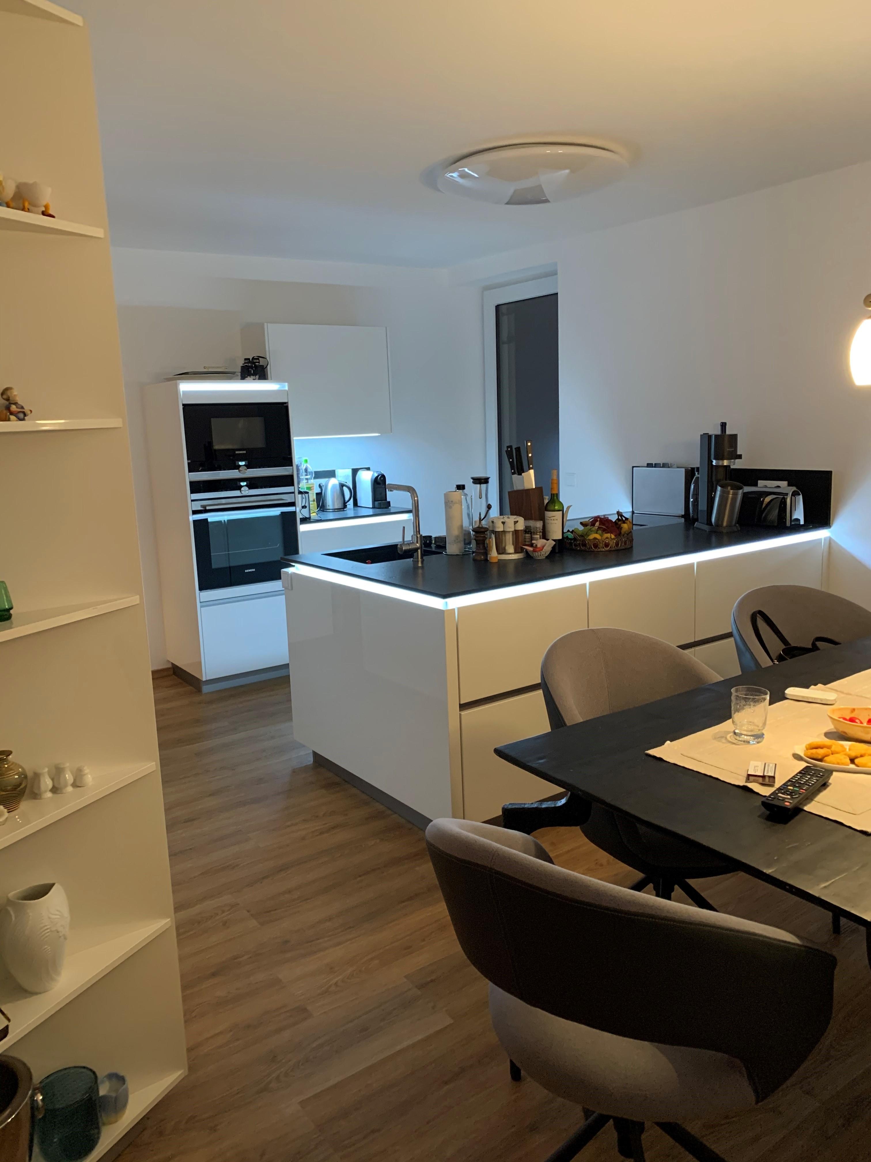 Die Wohnung hat eine Wohnküche mit freistehender Küche (Steinplatte, Induktionsherd, Mikrowell, Bakofen, Geschirrspüler, Kühl- und Gefrierschrank. Sowie 6 Sitzmöglichkeiten an einem großen Esstisch.