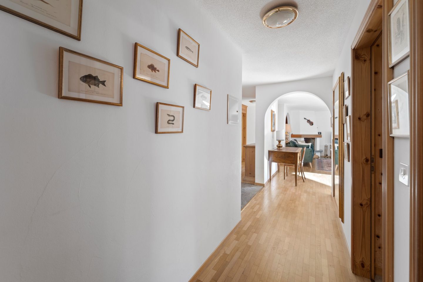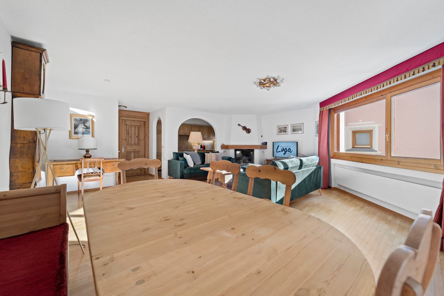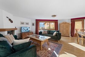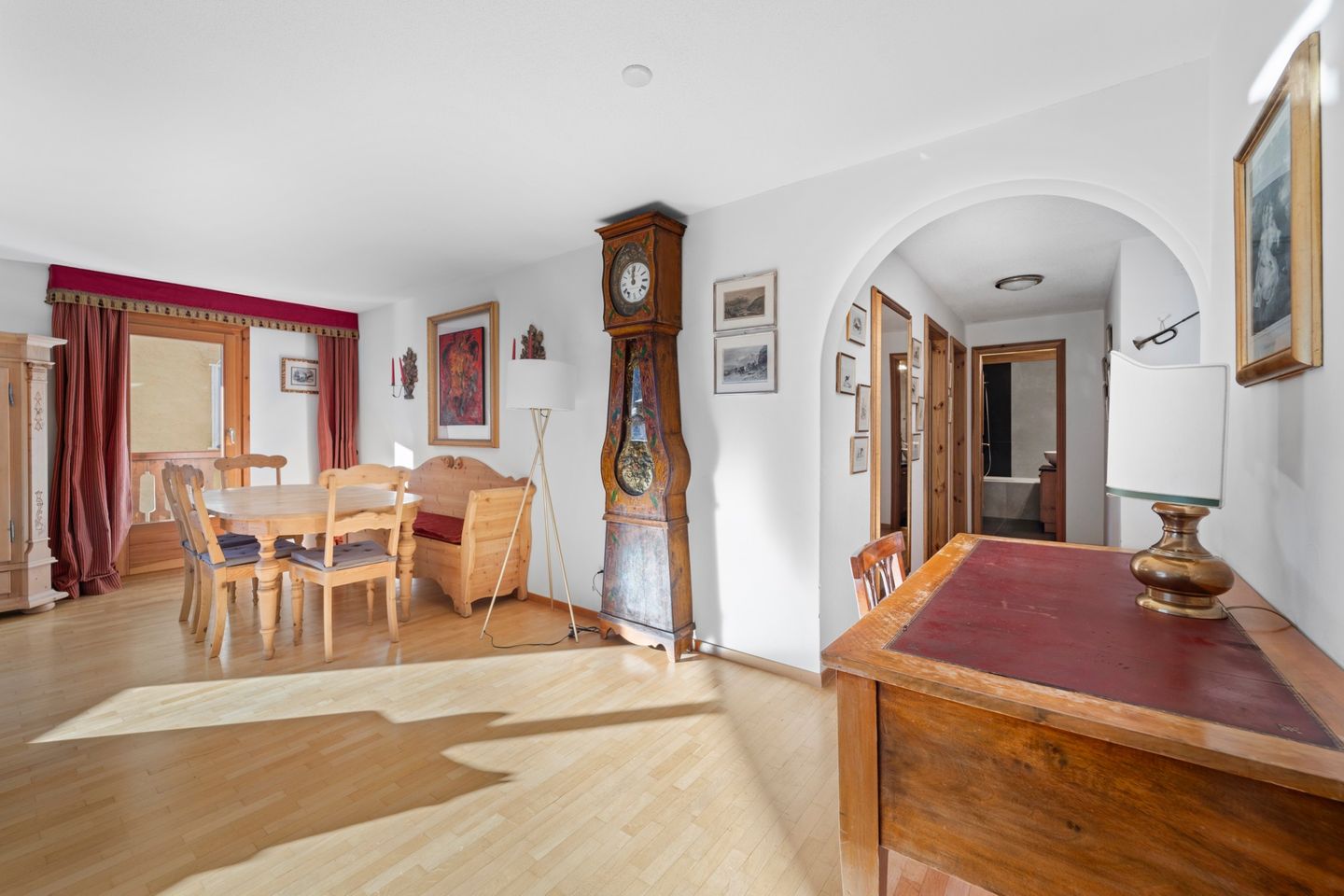 Grosszügige 3½ - ZWG, 1. Stock, ca. 110 m2, an Südlage mit Bergsicht. Wohn-/ Esszimmer mit Kamin, Balkon und TV. Küche halb offen gegen das Wohnzimmer, mit Geschirrspüler und Backofen. 1 Zimmer mit Doppelbett (zwei separate Matratzen). 1 Zimmer mit 2 Einzelbetten. Bad/WC/Bidet/Lavabo. Dusche/WC/Lavabo. Komfortable neue Einrichtung. Garagenplatz. Waschküche und Skiraum zur Mitbenützung. Nichtraucherwohnung. Haustiere sind nicht erlaubt.