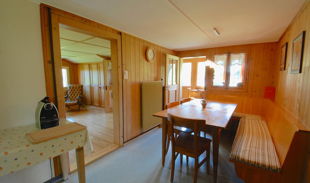 Die geräumige Wohnküche ist mit allem Nötigen ausgerüstet. Kochherd, Backofen, grosser Kühlschrank mit grossem Gefrierfach. Eine Nespresso Kapsel Kaffeemaschine, ein ital.Kaffeekocher für gemahlenen Bohnenkaffee, Fondue und Racelette Geschirr sind vorhanden.