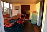 Sonstige Wohnzimmerausstattung (Wohnzimmer1): ausziehbarer Holz-Esstisch tisch für bis zu 10 PersonenCoucheckeBett, welches als zusätzliche Couch dientBüchergestell / kleine Bibilothek