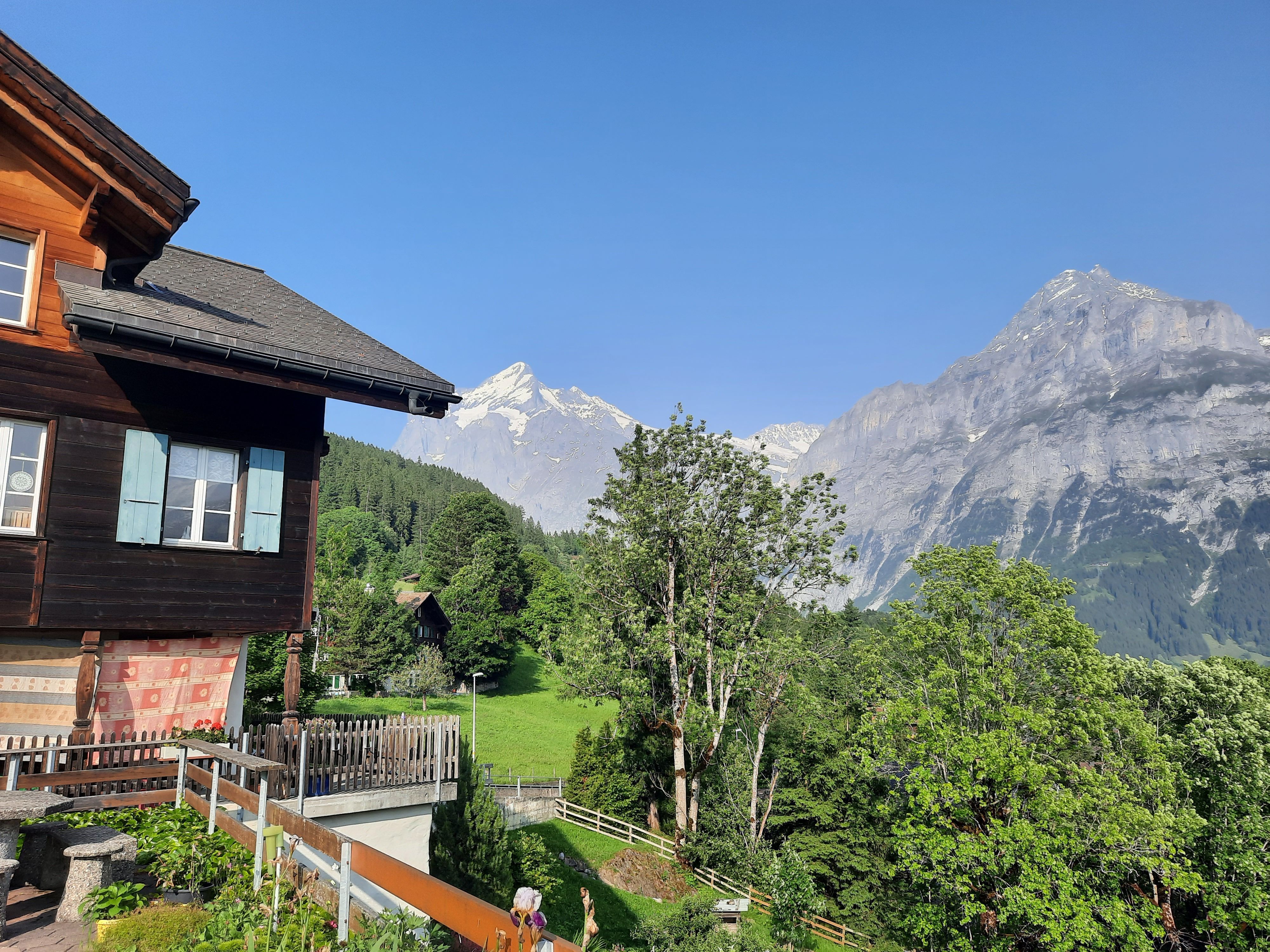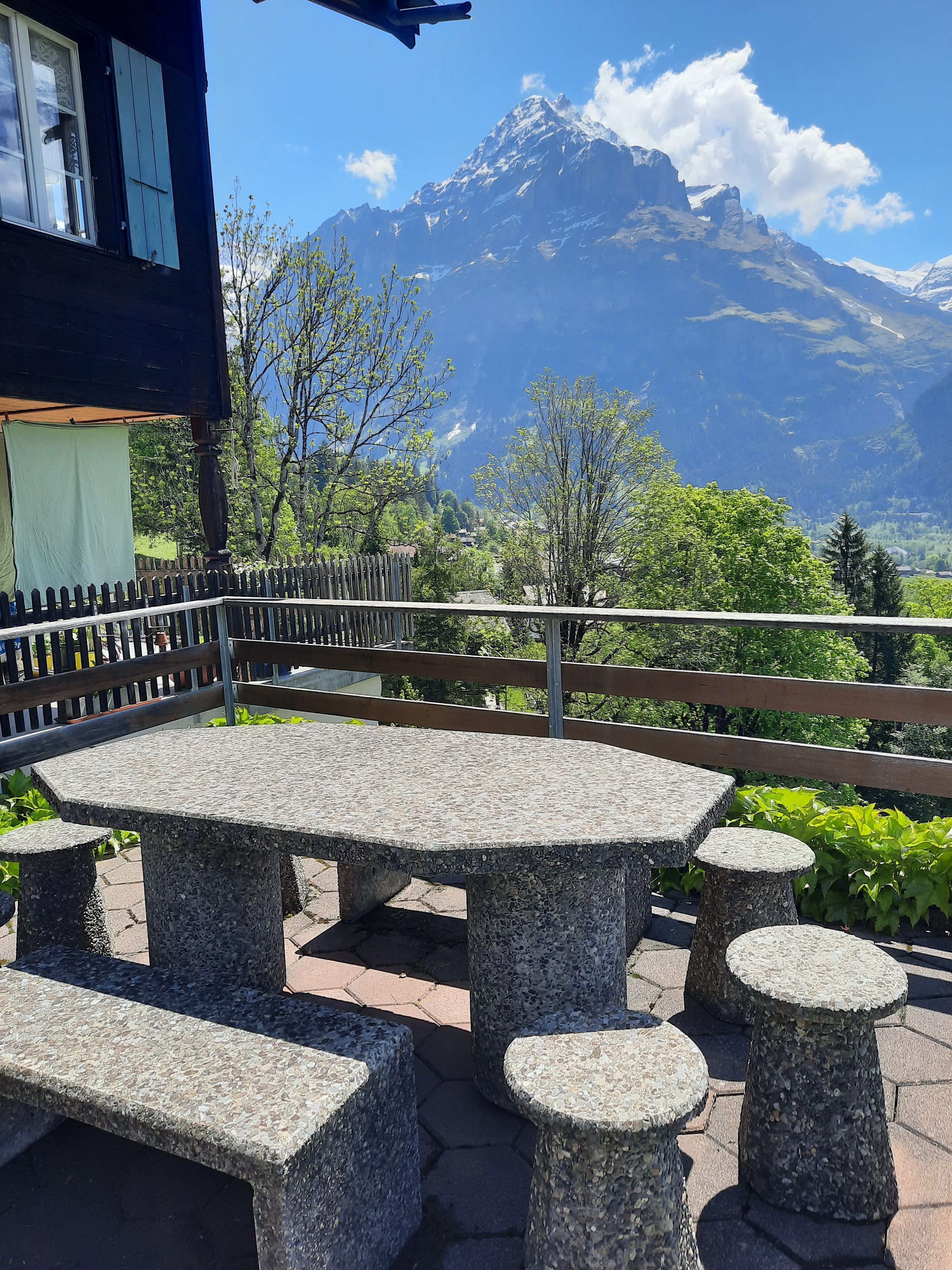 Draußen lädt eine Terrasse dazu ein, die Ruhe und die frische Bergluft zu genießen. Dieser private Außenbereich ist der ideale Ort, um die beeindruckende Aussicht auf die umliegenden Berge wie den Eiger und das Wetterhorn in vollen Zügen zu genießen. Hier können Sie entspannen und den Zauber der Natur unmittelbar erleben.