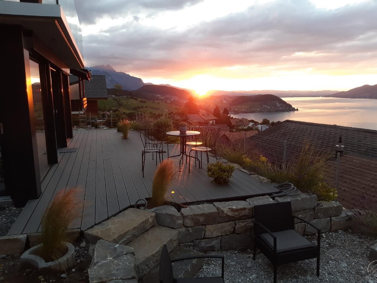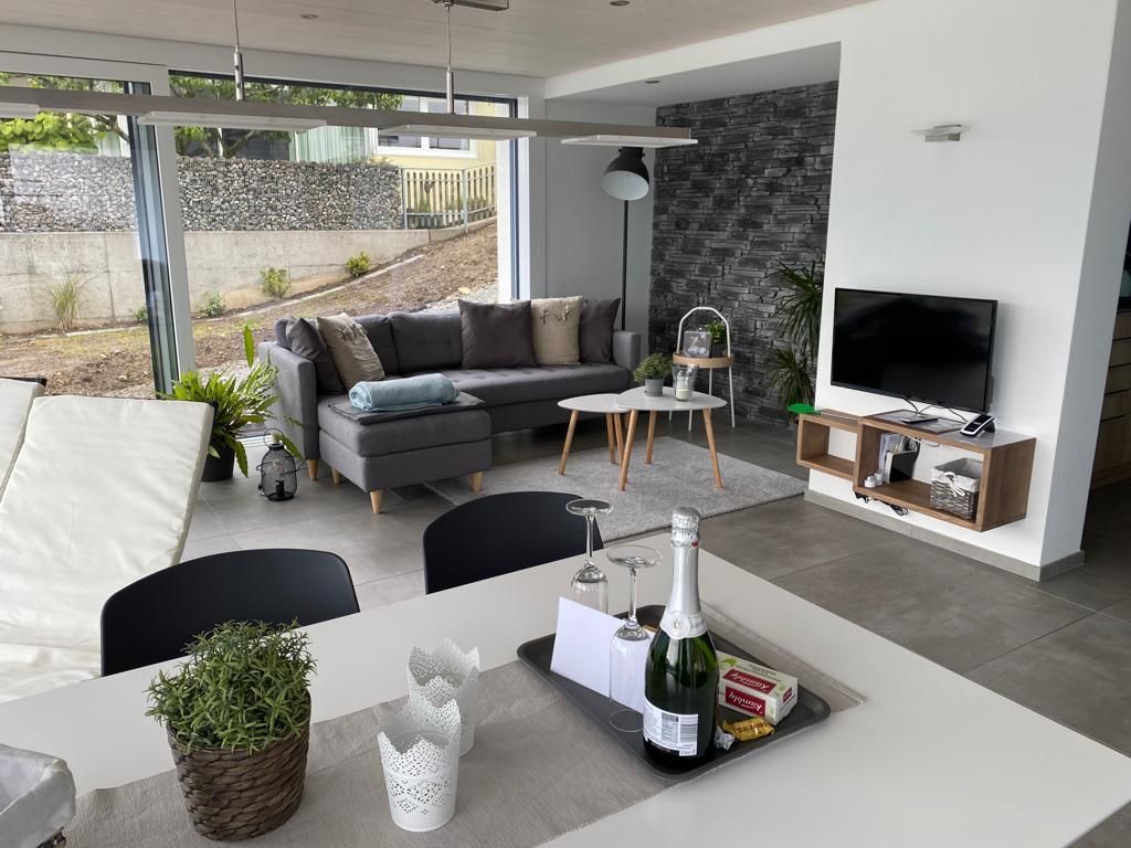 Die Unterkunft ist liebevoll eingerichtet und hält Bettwäsche, Handtücher, Badetücher und Küchentücher bereit. Hometrainer, TV und Wi-Fi Internet stehen Ihnen gratis zur Verfügung. Als kleines Geschenk finden Sie beim Antritt der Ferienwohnung von uns offerierten Sekt und eine Köstlichkeit aus der Schweiz vor. Alle Fenster, wie auch Fensterfronten, besitzen elektrische Storen auf der Aussenseite des Hauses, welche man mit einer Fernbedienung bei Bedarf herunterlassen kann. Die moderne Kücheninsel mit Induktionskochherd ist voll ausgestattet mit Geschirr, Pfannen und weiteren Kochutensilien.