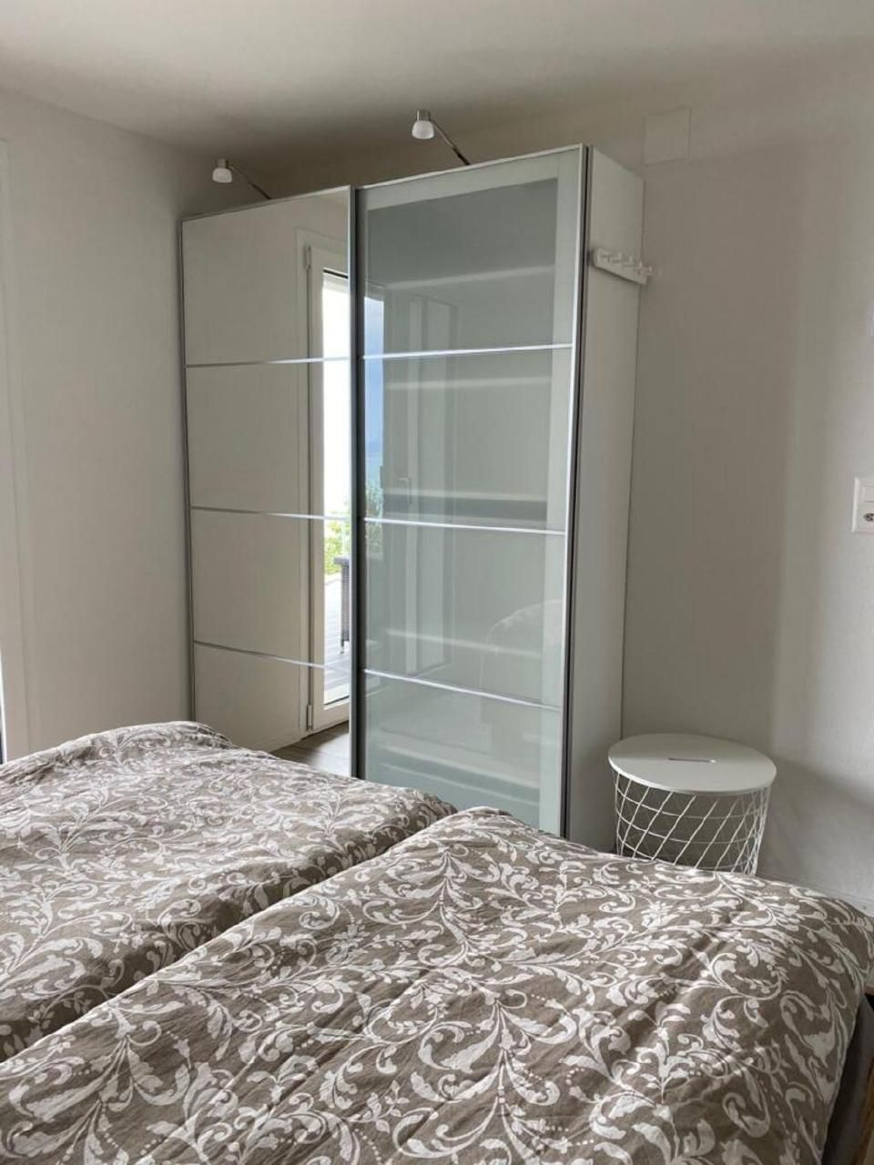 Das romantische Schlafzimmer besitzt ein Doppelbett (160x200cm), Etagenbett (90x200cm), zwei Kleiderschränken und einen grossen Spiegel. Zudem hat das Schlafzimmer eine Balkontüre, durch welche man direkt auf die Terrasse gelangt. Auf einem zusätzlichen Klappbett könnte eine weitere Person oder ein weiteres Kind schlafen. Zudem haben Gäste die Möglichkeit bis zu zwei Kinderbetten (115x57x64cm) für Kleinkinder zu mieten, was einen kleinen Aufpreis pro Aufenthalt zur Folge hat. Dieser Betrag wird bei Gebrauch des Angebots direkt beim Aufenthalt in der Wohnung auf der Kücheninsel hinterlassen. Gastgeber muss aber darüber informiert werden, dass Gäste von diesem Angebot Gebrauch machen möchten.