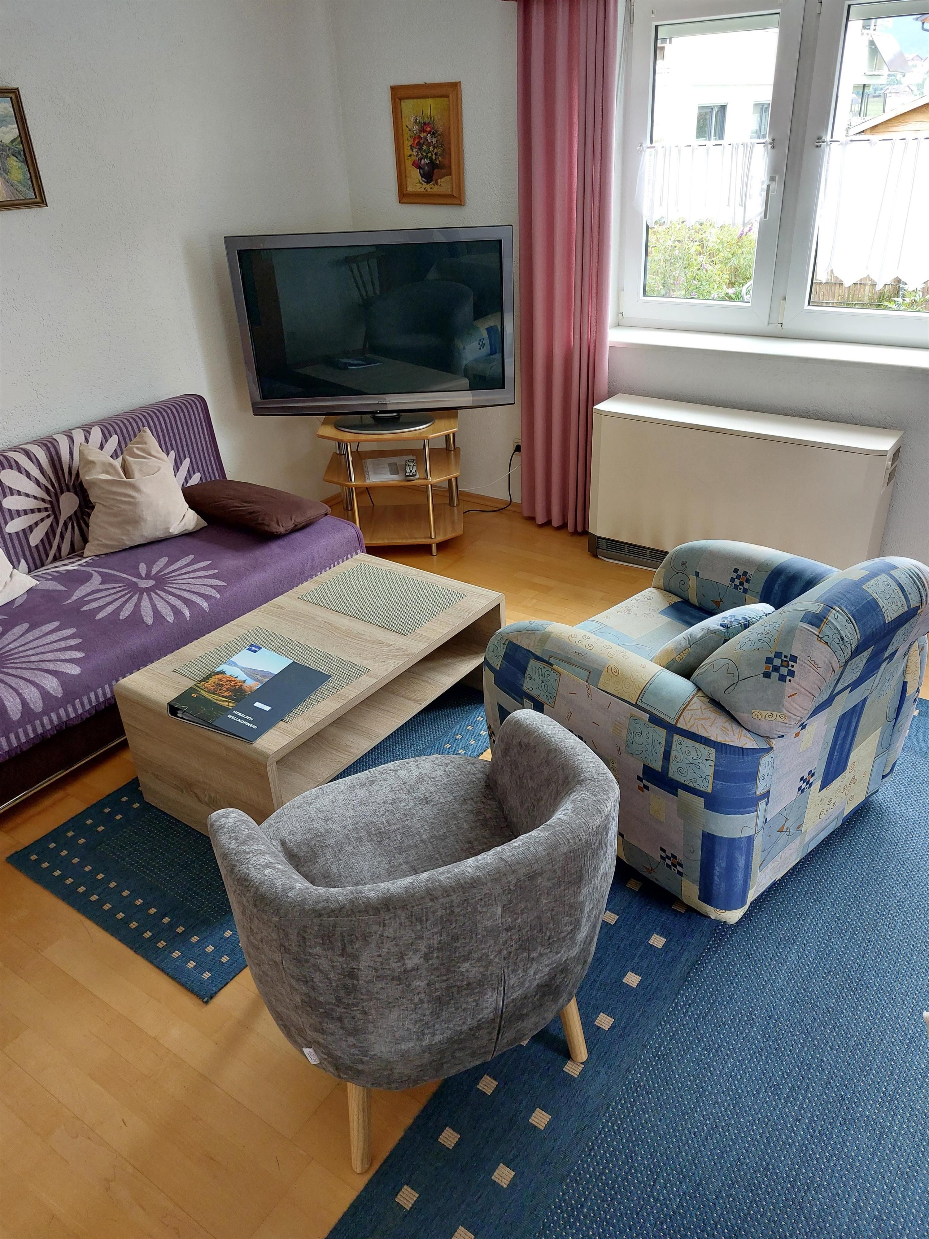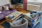 - Wohnzimmer mit Schlafcouch, Fernseher (Kabel TV), Radio, Eckbank, Tisch und Stühlen,