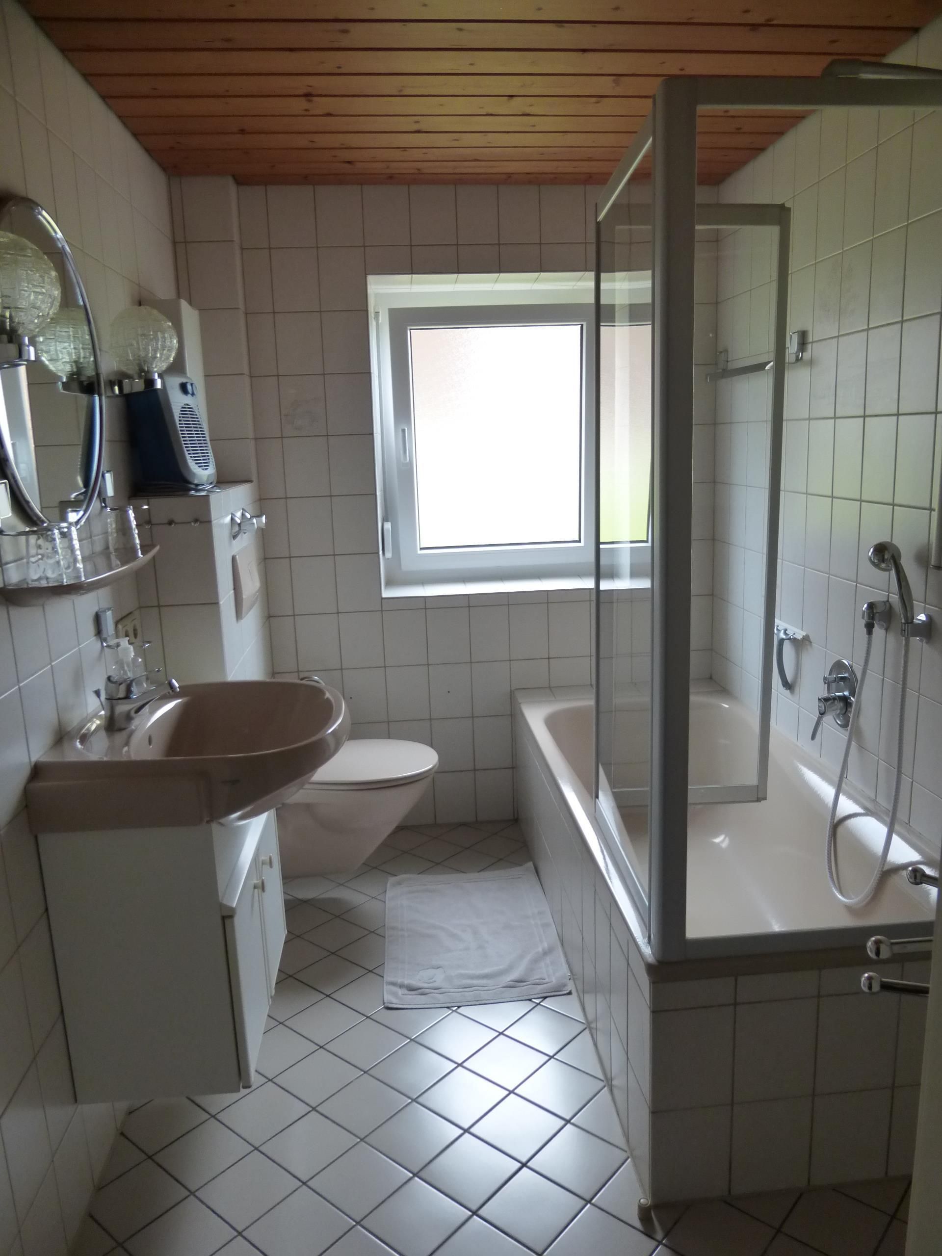 - Badezimmer mit Fenster, Dusche, WC, Waschbecken mit Spiegel,Föhn