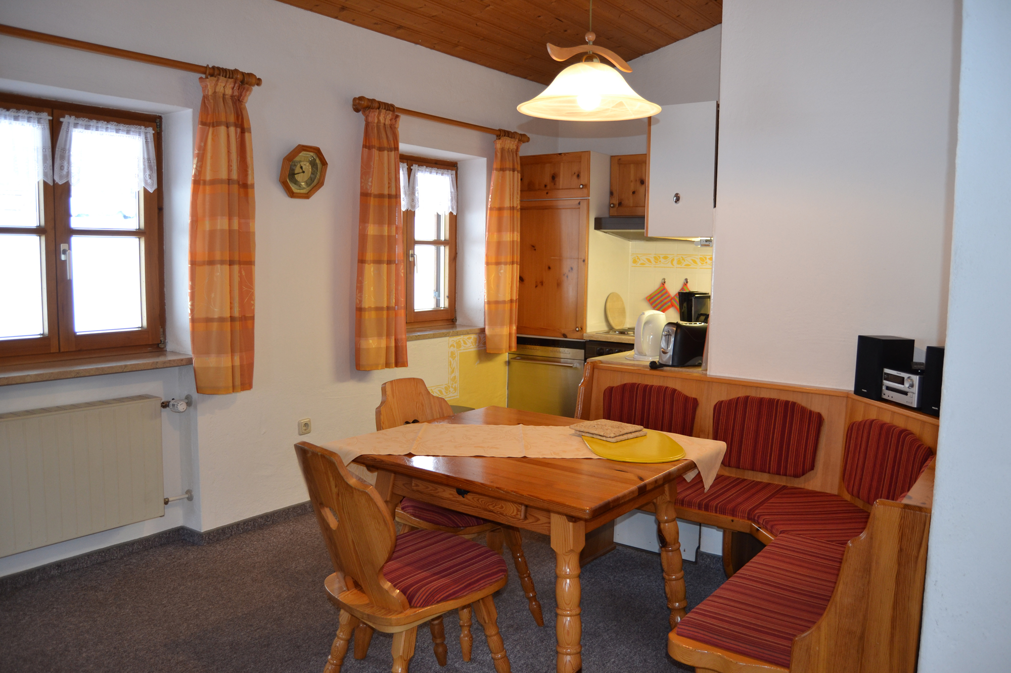 • Wohnzimmer (Schlafcouch 200 x 180cm) mit voll ausgestatteter Küche mit gemütlicher Sitzgruppe, Eßecke, Sat-TV und Radio