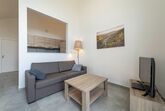 Das stimmungsvolle, multifunktionale Wohn- und Esszimmer, ist mit einem komfortablen Sitz-/ Schlafsofa, einem Flat-TV sowie einem Esstisch mit Bestuhlung und einer offenen Küche mit Herd/ Ceranfeld (inkl. Backfunktion), Kaffeemaschine, Wasserkocher, Toaster, Geschirrspülmaschine komplett ausgestattet.