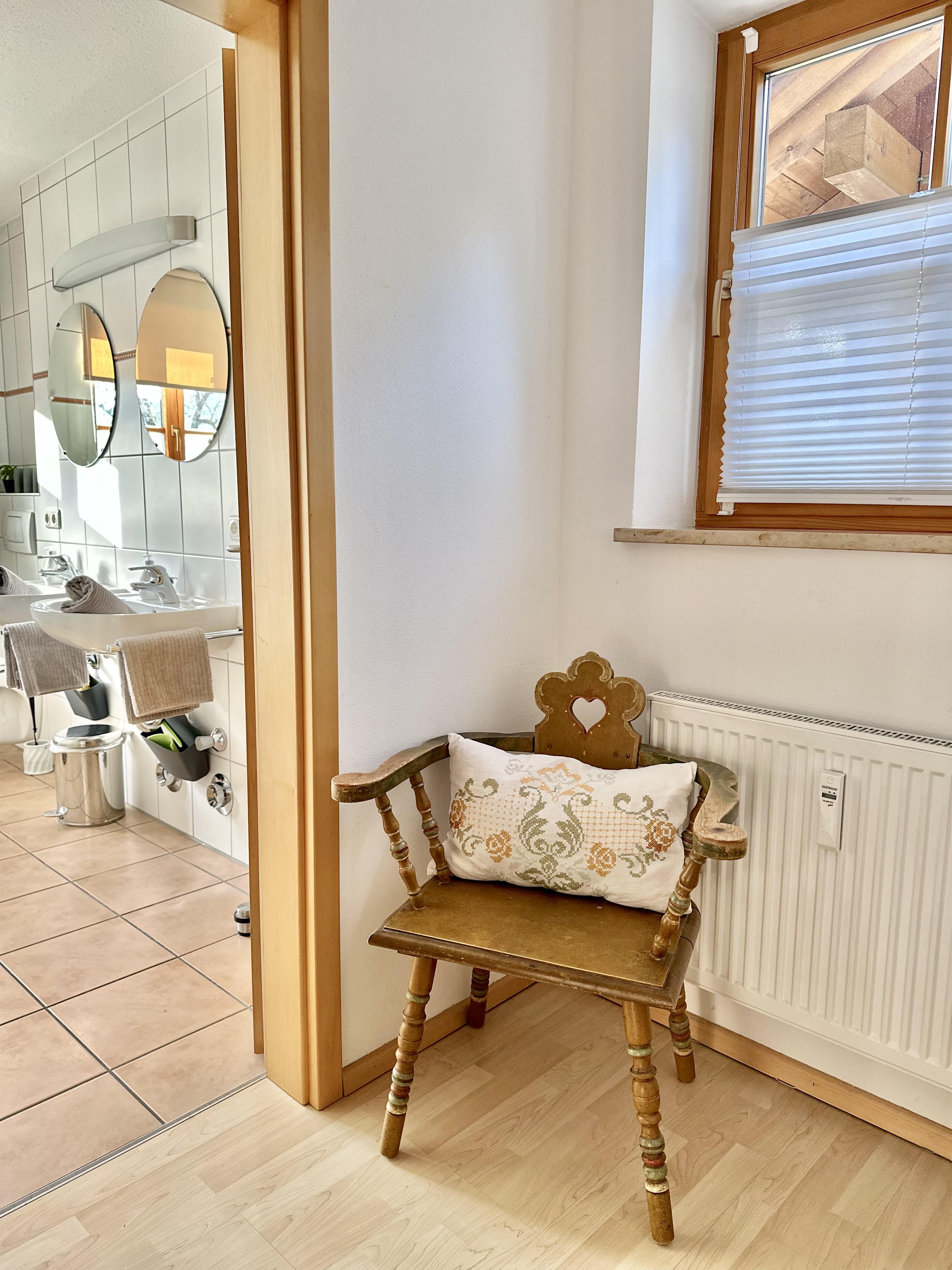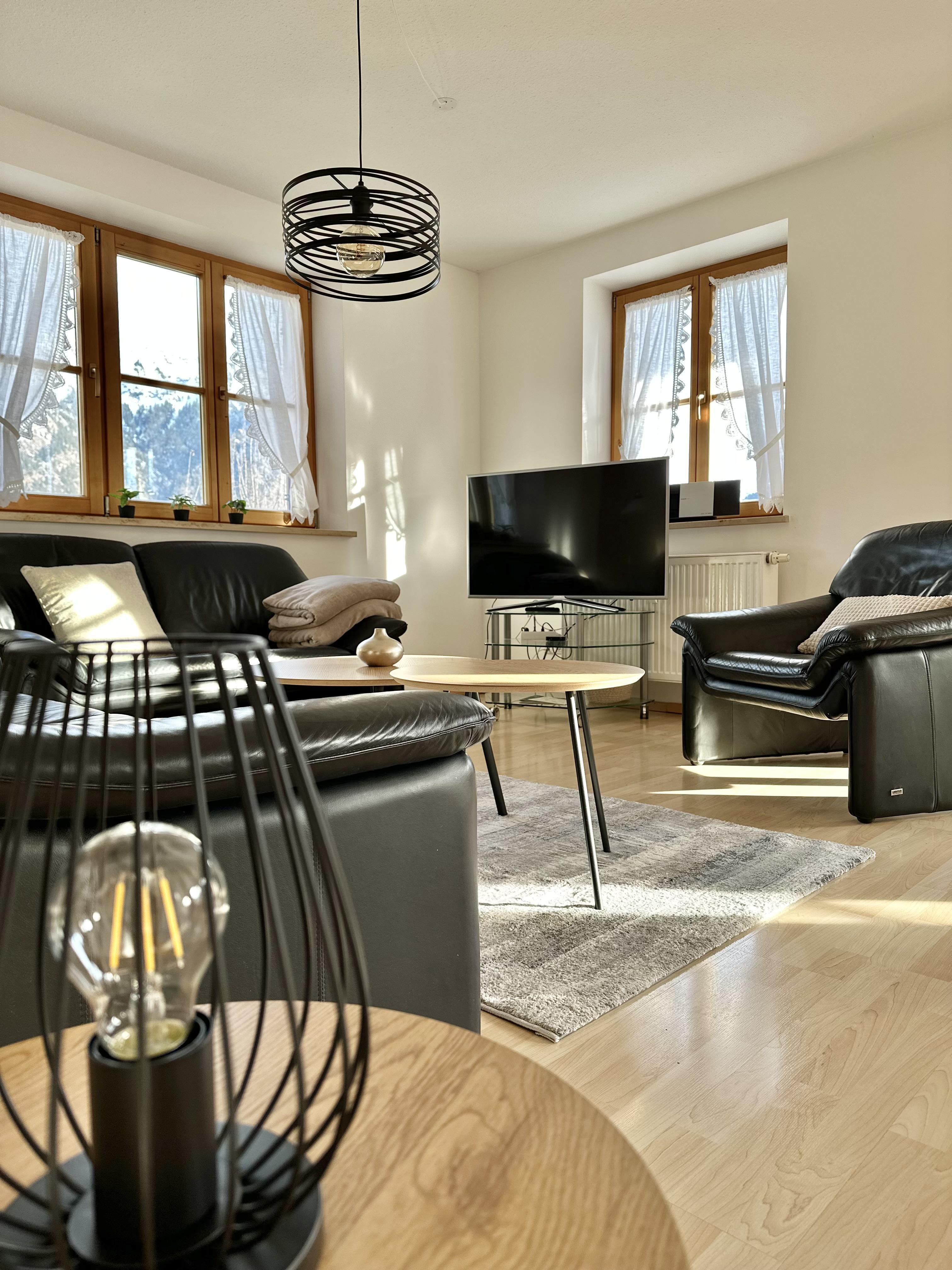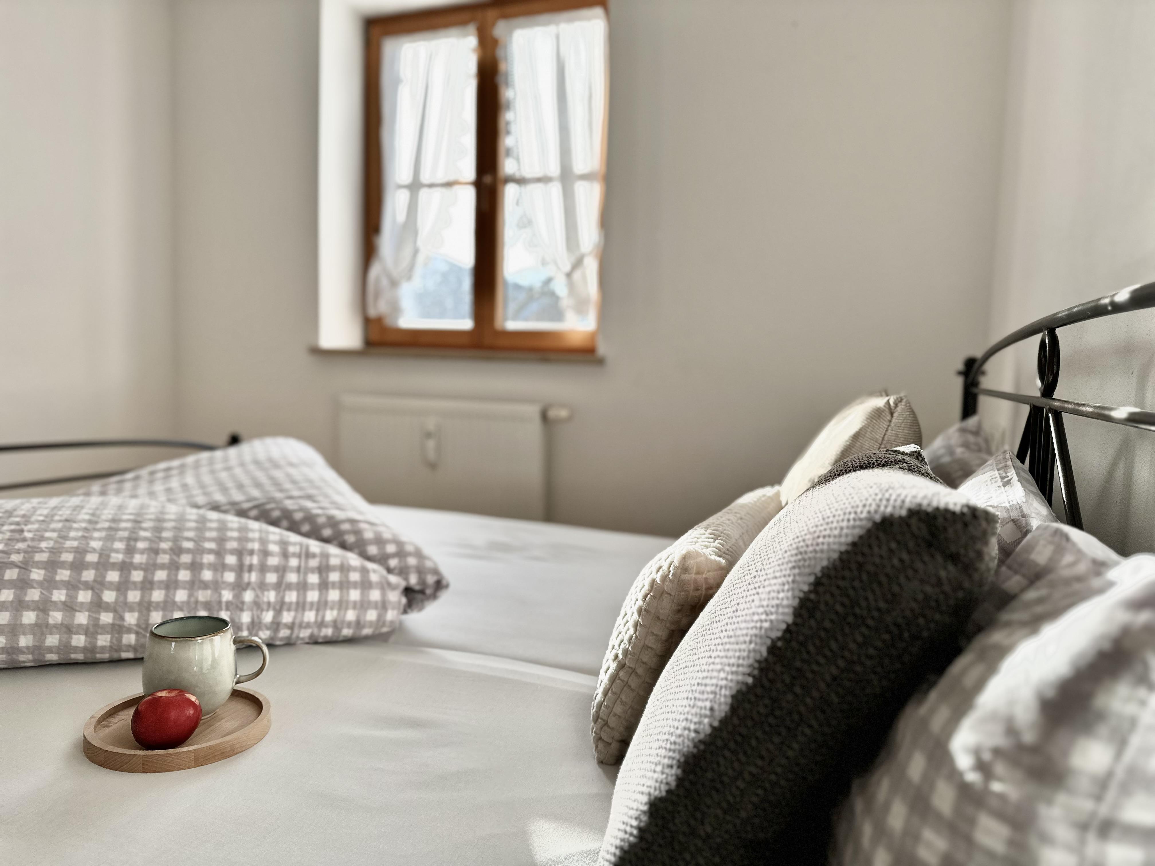 Hochwertige, sehr helle und sonnige, großzügige Ferienwohnung, ausgestattet mit einem stilvollem Wohnzimmer, 3 getrennten Schlafräumen, Küchezeile, Bad mit Wanne / sep. Dusche, WC, SAT-TV. Südbalkon mit freiem, umfassenden Bergblick; Bauerngarten und Liegewiese unter alten Apfelbäumen.