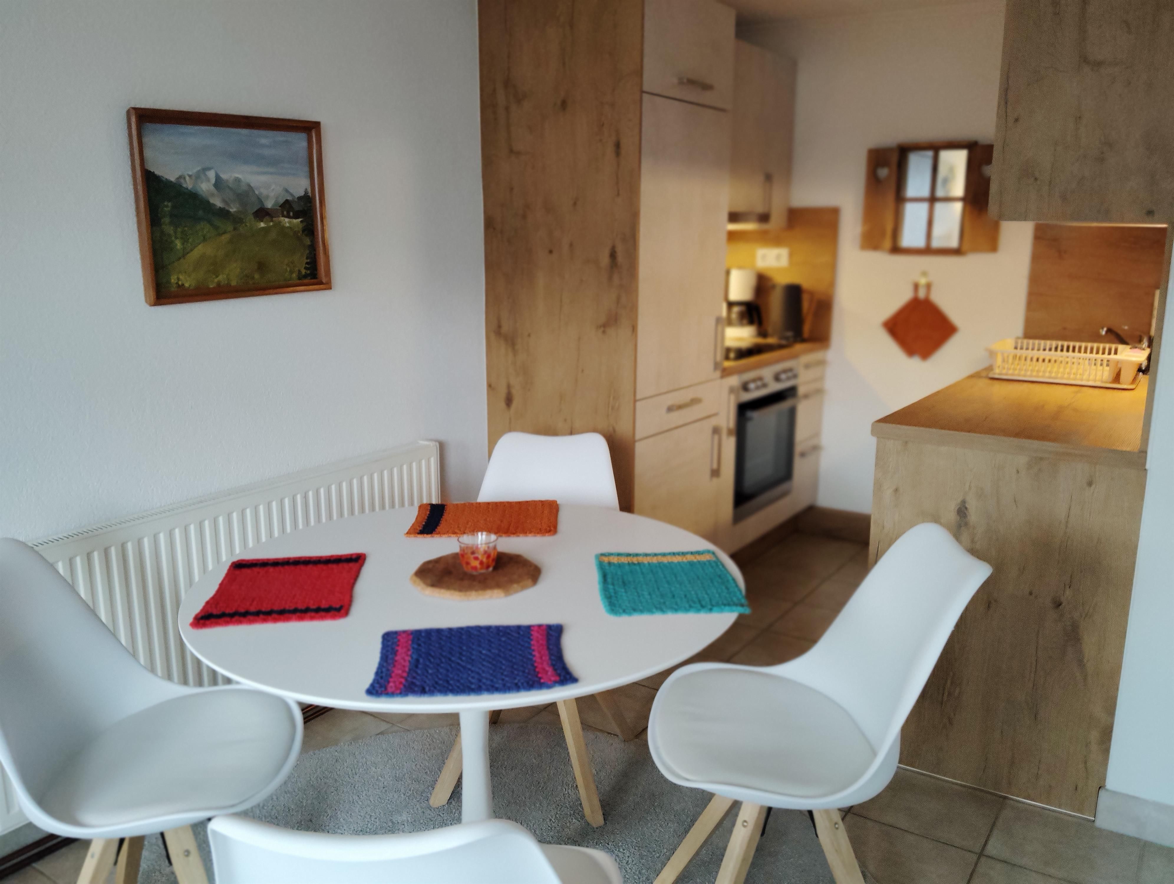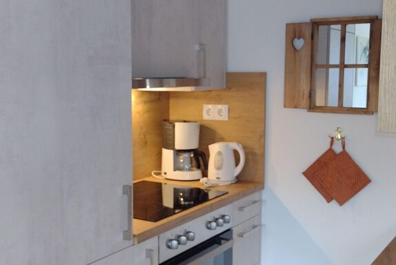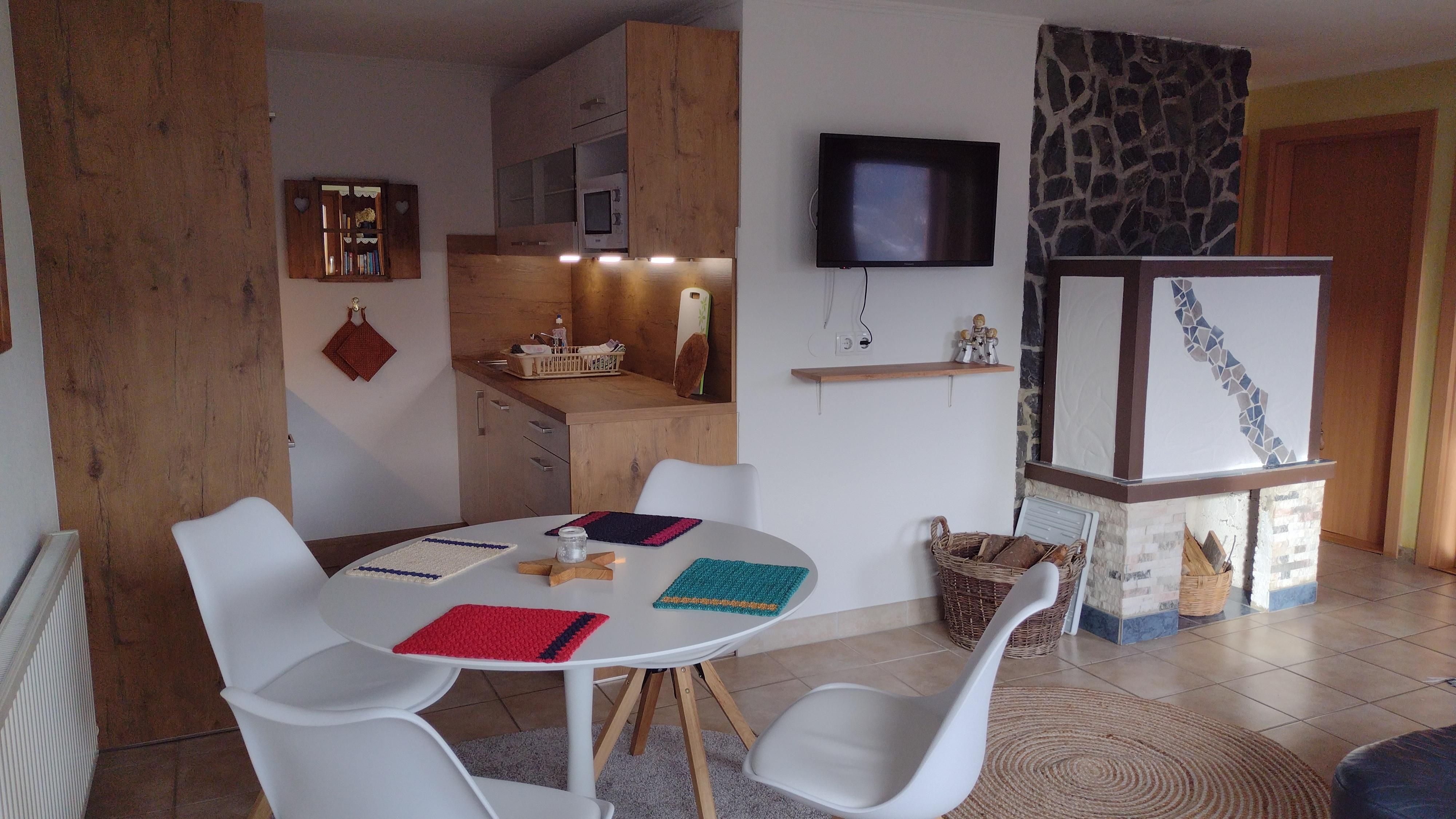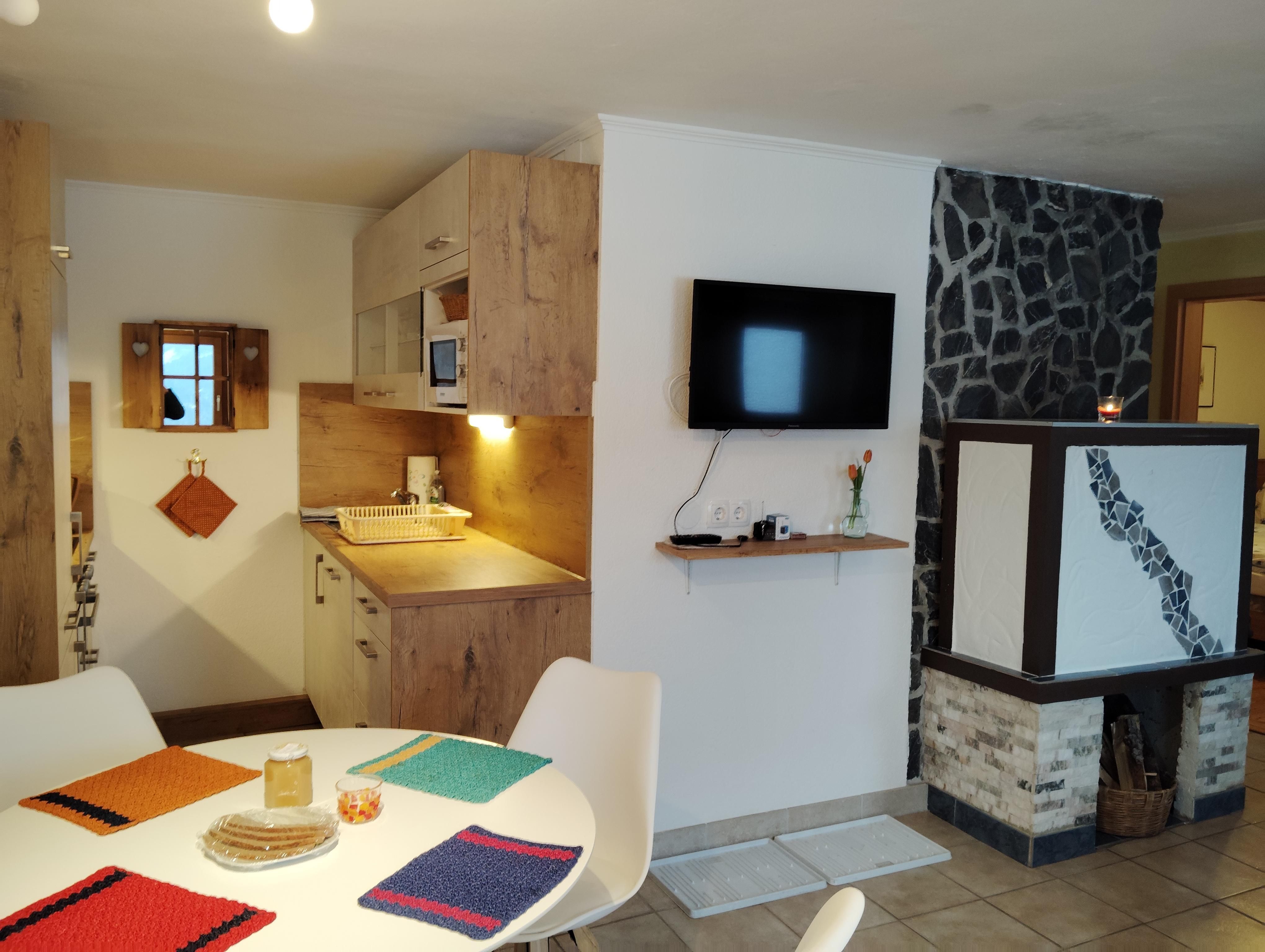 • Wohnküche mit E-Herd, Backofen, Mikrowelle, Kühlschrank, Toaster, Kaffeemaschine, Wasserkocher, reichlich Koch- und Essgeschirr, Esstisch mit 4 Stühlen, gemütlicher Kachelofen (sonst Zentralheizung), ausziehbarer Couch, Sat-TV, einige Spiele und Lesematerial mit aktuellen Prospekten aus der Region.