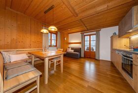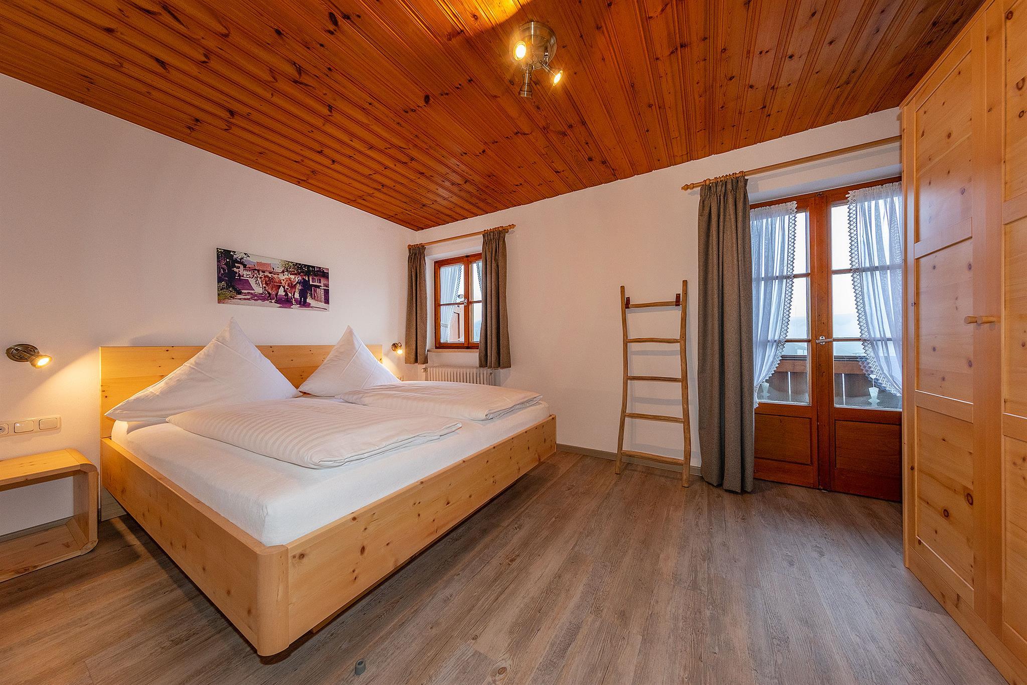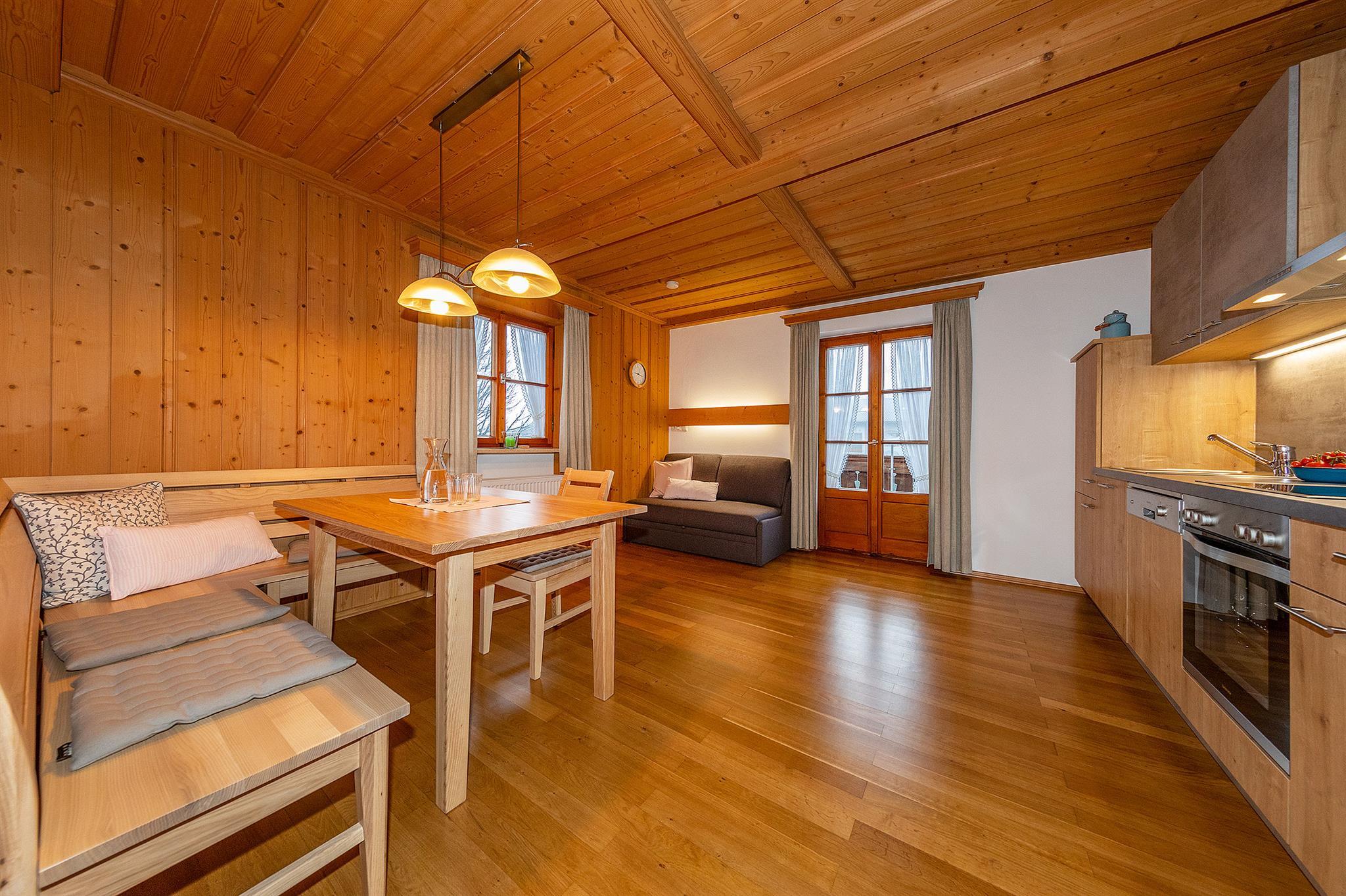 Die Ferienwohnung für 2 Personen, mit 37qm im ersten Stock, bietet eine ganz besondere Wohn-Atmosphäre. Das Zirbenholz-Schlafzimmer sorgt für Entspannung, da die Zirbe eine beruhigende und schlaffördernde Wirkung verspricht. Es befindet sich ein Zirbenholzbett (180x200) und ein Zirbenholzkleiderschrank darin, außerdem der Zugang zum Balkon. In der Wohnküche können Sie an sonnigen Tagen bereits auf dem Balkon frühstücken. Ein Kühlschrank mit Gefrierfach, Spülmaschine, Kaffeemaschine, Wasser- und Eierkocher, sowie Herd und Backofen helfen Ihnen dabei. Auch das Bad ist komfortabel mit Duschkabine und Handtuchtrockner ausgestattet. Der Süd- und Ostbalkon ermöglicht einen Rundumblick auf das Soiern-, Karwendel- und Wettersteinmassiv.