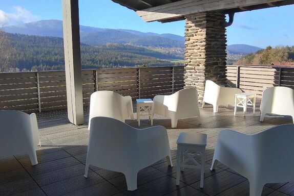 Die öffentliche Aussichts-Terrasse mit ihrem grandiosem Blick in die Berge grenzt direkt an die Buch- und Spielbar an, und misst weitere 60 qm. Entspannen könnt ihr Euch jederzeit in unseren Lounge Möbeln, grillen und chillen dürft ihr im Garten und im Außenbereich vor dem Haus.