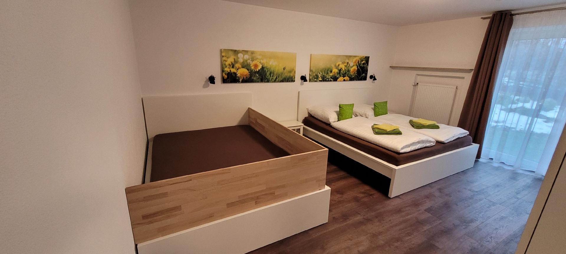 Die 2-Zimmer-Familienwohnung ist mit einem gemütlichen Sofa mit Récamiere und einem Couchtisch ausgestattet. Das Sofa ist ausziehbar und kann mit einer Liegefläche von 140x200 als weiterer Schlafplatz genutzt werden. Der große Esstisch für 4-5 Personen steht gegenüber der Winkelküche und lädt zum gemeinsamen Schlemmen ein. Im Schlafzimmer steht ein großes Doppelbett (180x200) ohne Besucherritze und ein französisches Bett (140x200), so dass im Schlafzimmer bequem 4 Personen übernachten können. Das großzügige Duschbad ist sowohl vom Schlafzimmer als auch vom Wohnzimmer direkt zu erreichen.