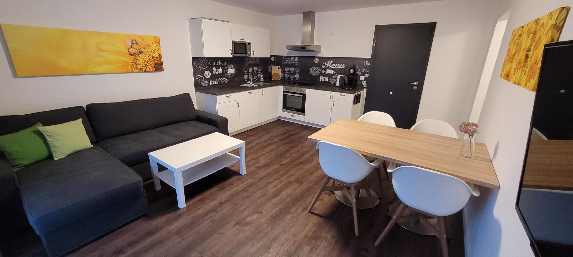 Die 2-Zimmer-Apartments sind mit einem gemütlichen Sofa mit Récamiere und einem Couchtisch ausgestattet. Das Sofa ist ausziehbar und kann mit einer Liegefläche von 140x200 als weiterer Schlafplatz genutzt werden. Der große Esstisch für 4 Personen steht gegenüber der Winkelküche und lädt zum gemeinsamen Schlemmen ein. Im Schlafzimmer steht ein großes Doppelbett (180x200) ohne Besucherritze. Das Duschbad ist direkt vom Schlafzimmer zu erreichen.