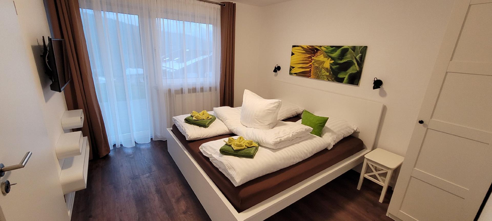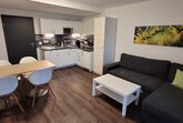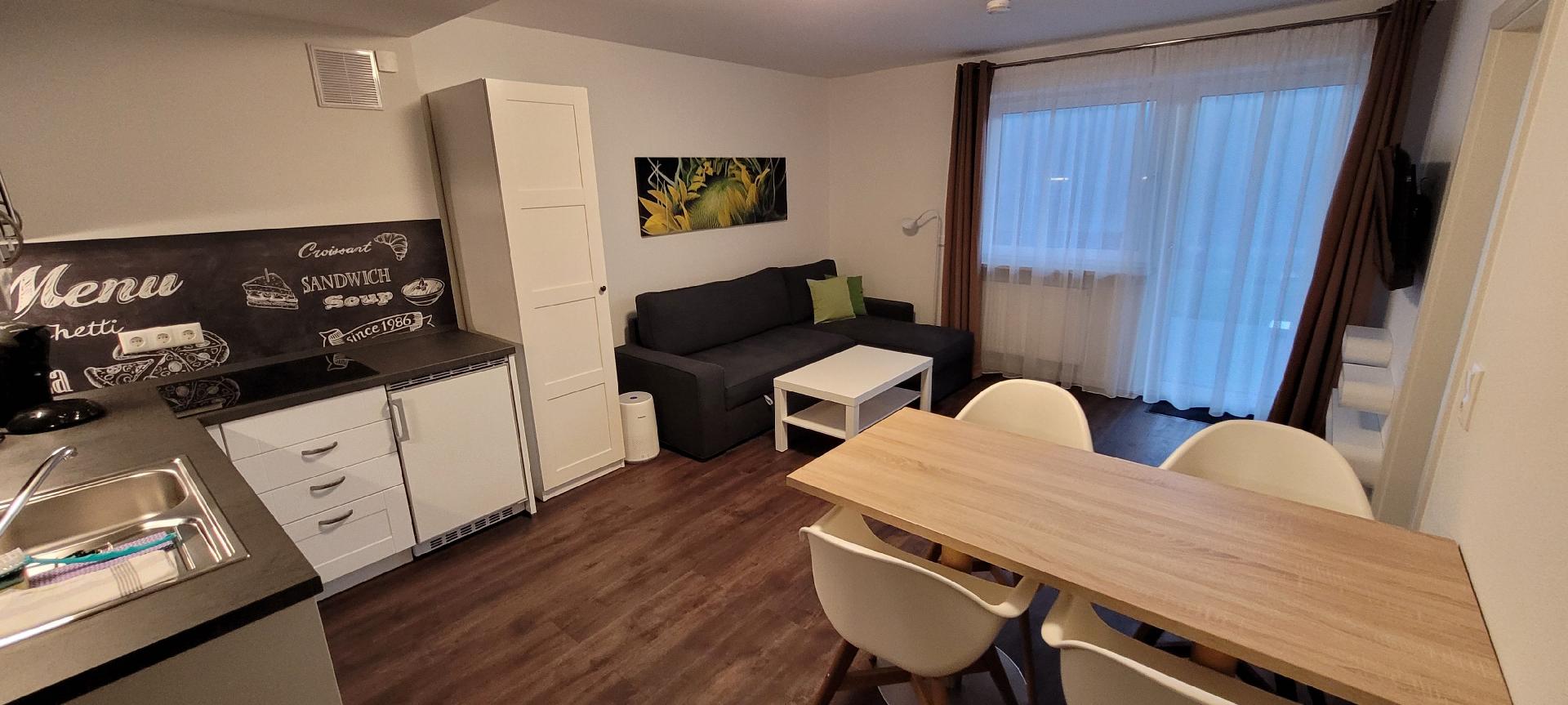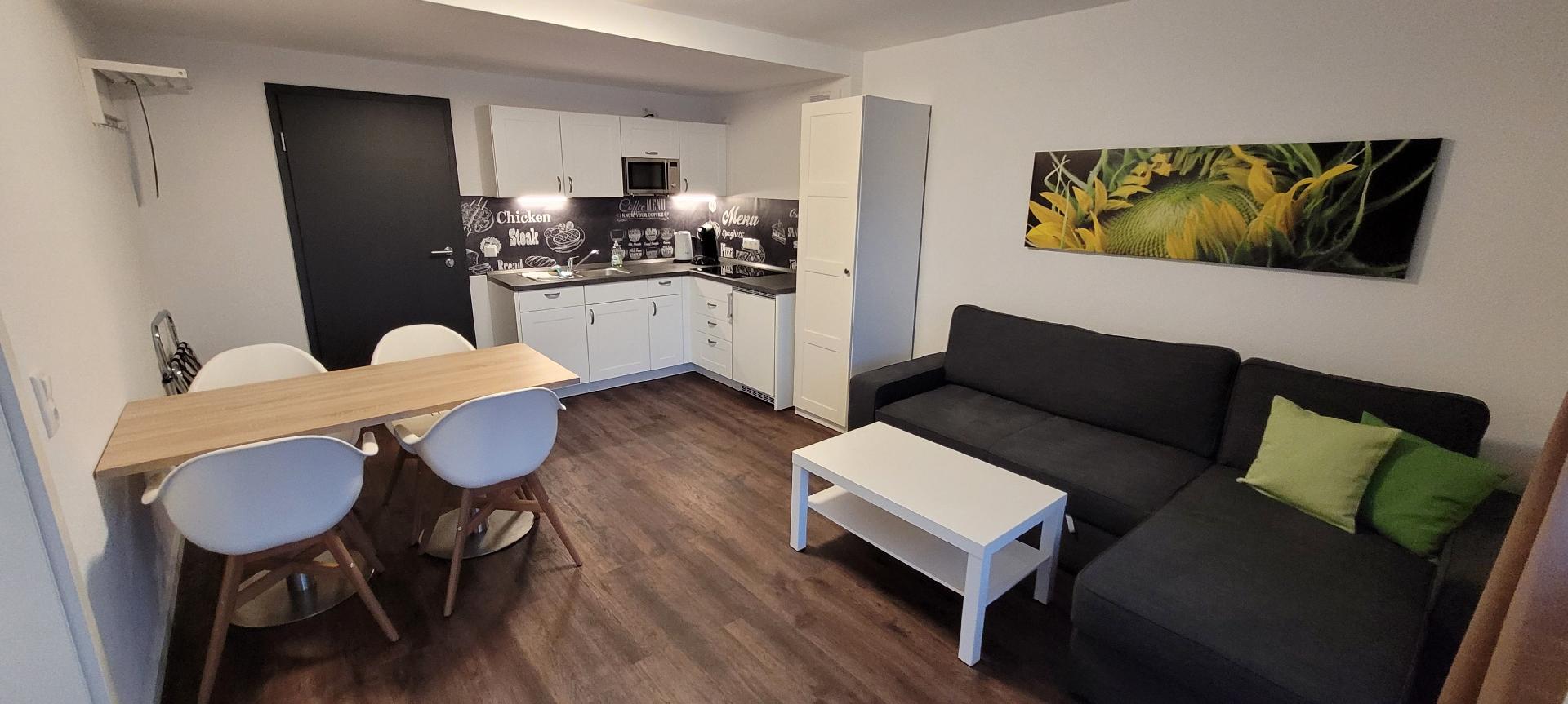 Die 2-Zimmer-Apartments sind mit einem gemütlichen Sofa mit Récamiere und einem Couchtisch ausgestattet. Das Sofa ist ausziehbar und kann mit einer Liegefläche von 140x200 als weiterer Schlafplatz genutzt werden. Der große Esstisch für 4 Personen steht gegenüber der Winkelküche und lädt zum gemeinsamen Schlemmen ein. Im Schlafzimmer steht ein großes Doppelbett (180x200) ohne Besucherritze. Das Duschbad ist direkt vom Schlafzimmer zu erreichen.