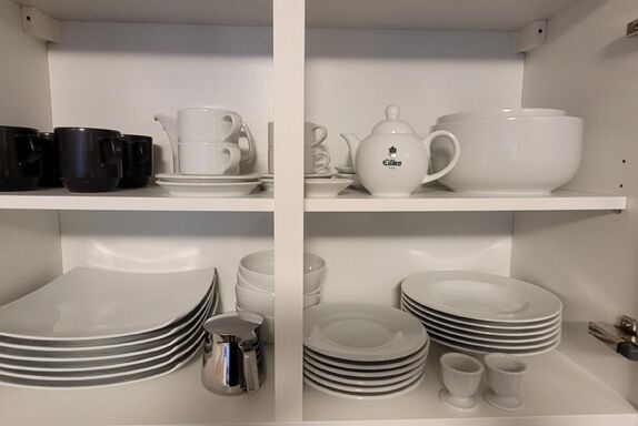 Die Küchenzeilen sind mit allem, was man braucht ausgestattet, inklusive Kühl-/Gefrierschrank und Microwelle mit Grill, in den 1-Zimmer-Studios ein 2-Platten-Kochfeld und in allen 2-Zimmer Apartments ein 4-Platten-Kochfeld und zusätzlich eine Spülmaschine. In der Familienwohnung auch einen Backofen. In allen Wohnungen finden Sie Toaster, Wasserkocher, Senseo-Pad-Kaffeemaschine, Microwelle mit Grillfunktion, Geschirr, Besteck, Töpfe, Pfanne, Nudelsieb, scharfes Kochmesser, Brotmesser, Schneidebrett, Topflappen, Dosenöffner, Korkenzieher, Wasser,- Rotwein- und Biergläser, Spüli, Spültabs, Geschirrtücher, -Bürste und -Lappen, Kehrbesen und Schaufel ...