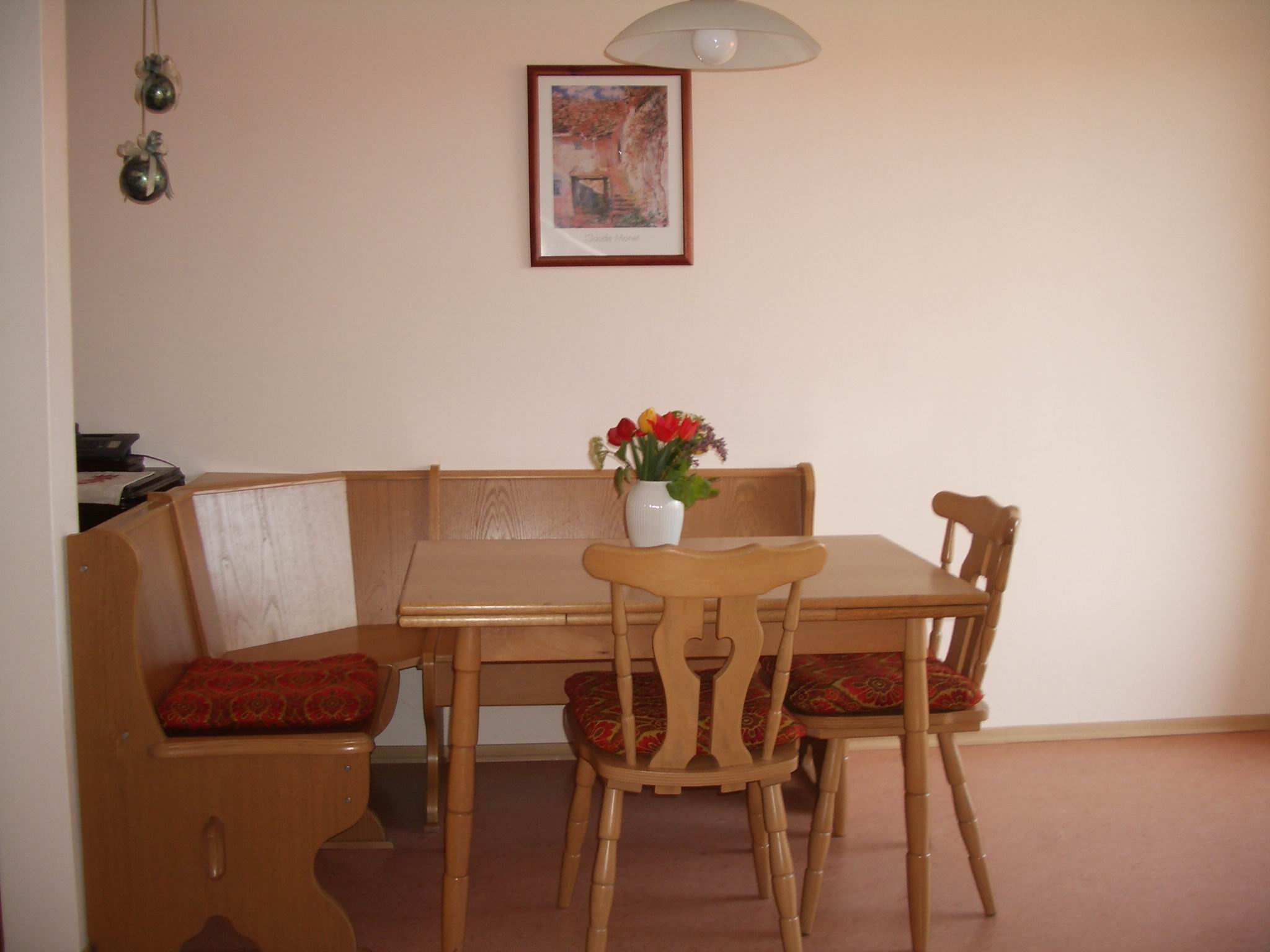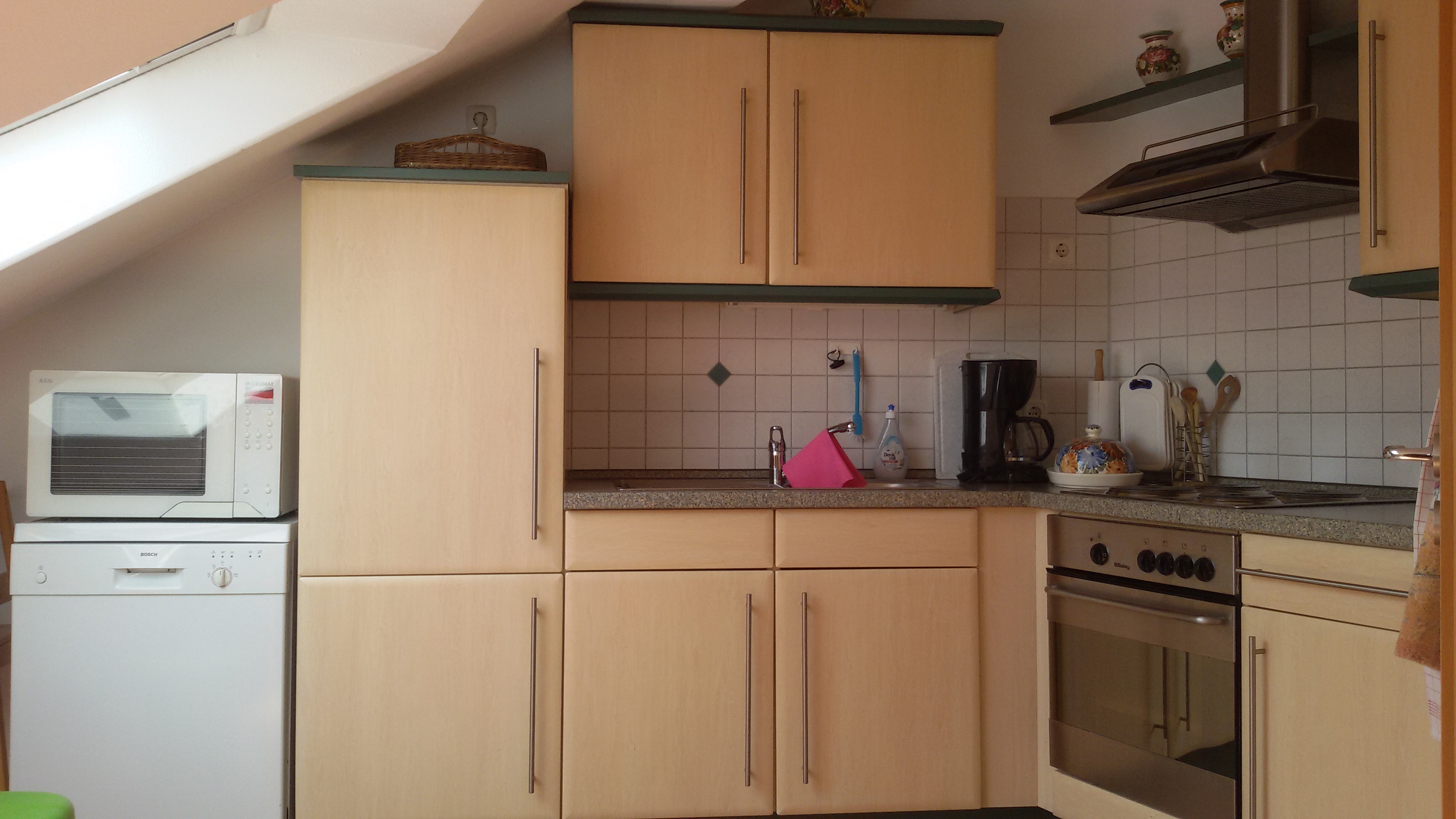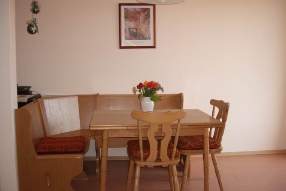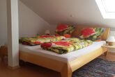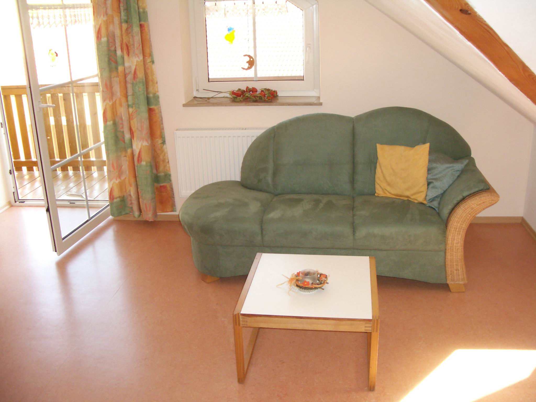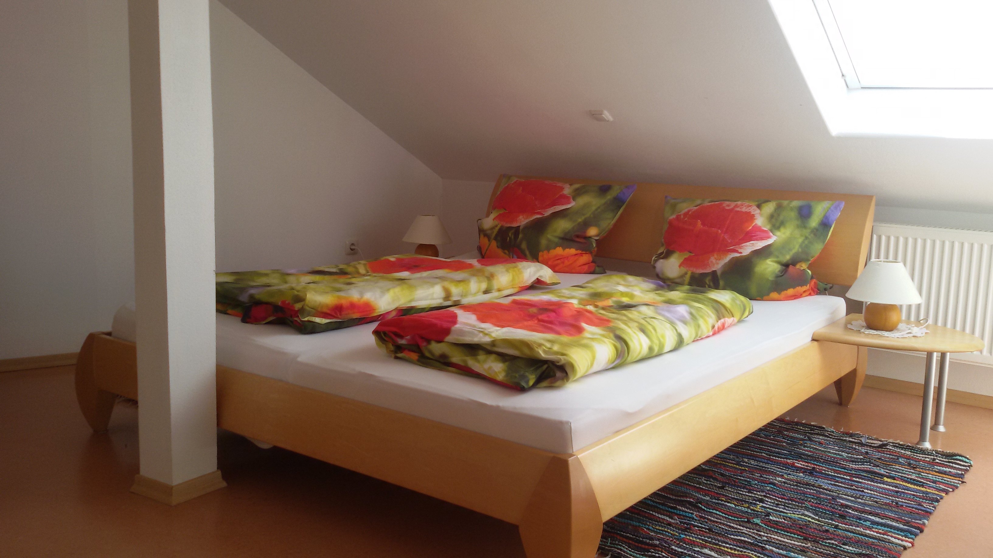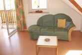 Unsere Ferienwohnung Klatschmohn im DG (ca. 59 qm) mit 2 Schlafräumen, 1 Wohnzimmer mit gut ausgestatteter Küchenzeile und Südbalkon, DU/WC, ist für bis zu 4 Personen geeignet.
