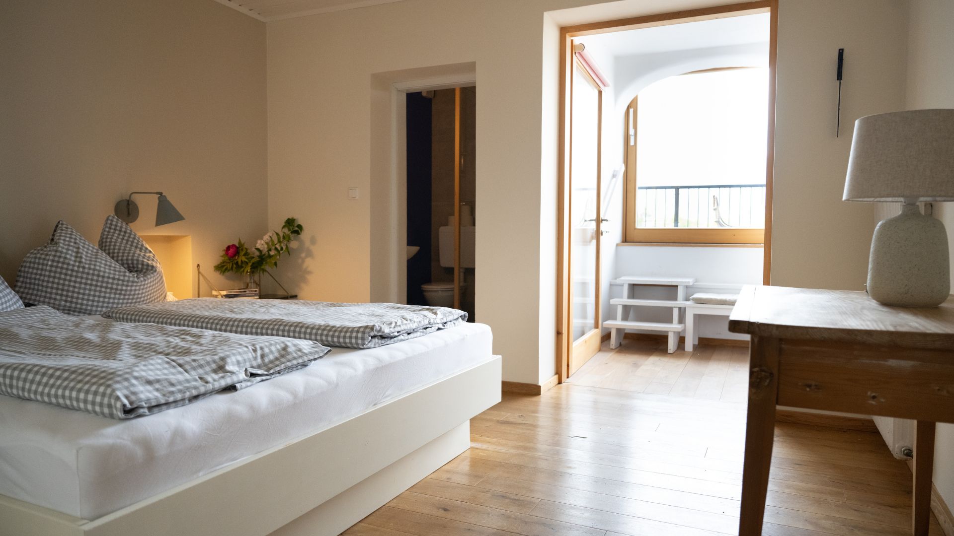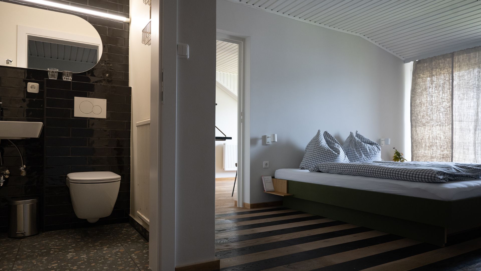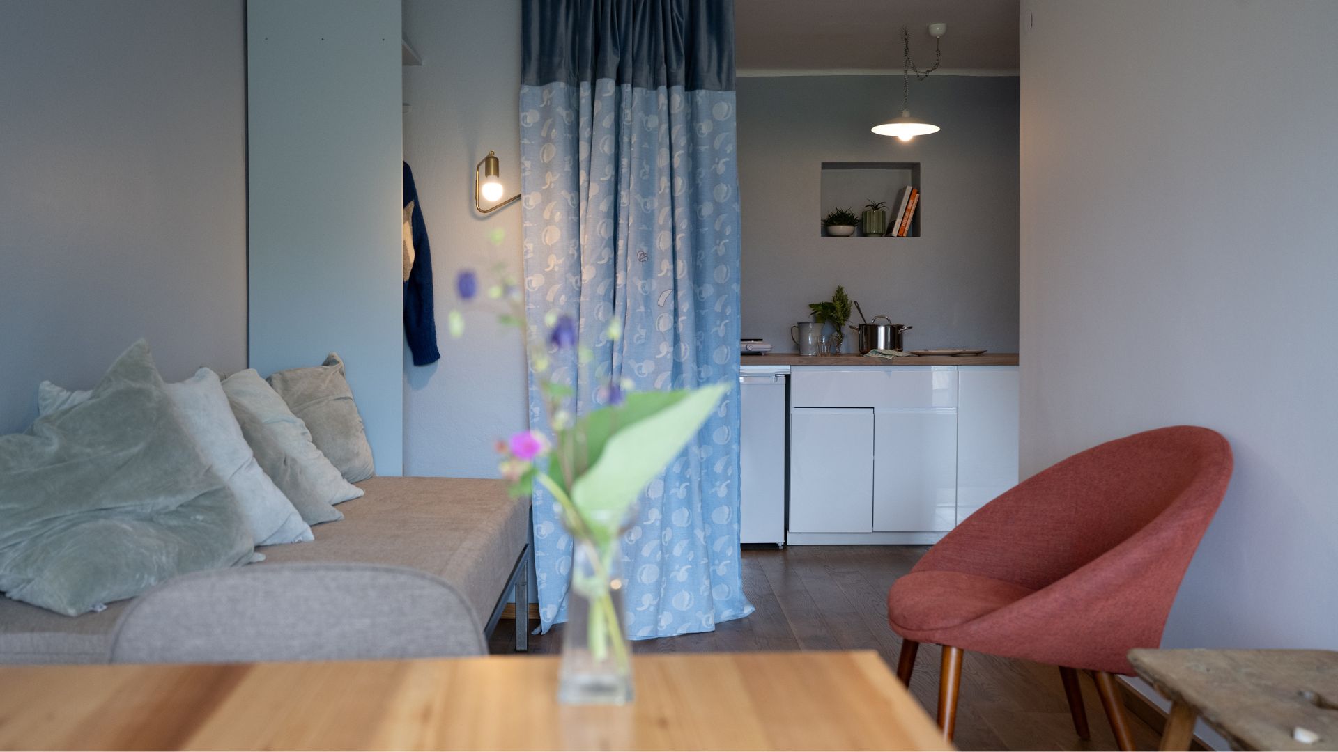 Elf neue, modern ausgestattete Ferienwohnungen, große Wiese für die Gäste direkt vor dem Haus, Frühstücksraum mit Produkten der Bauern aus der Umgebung, ausgewählte Bibliothek.