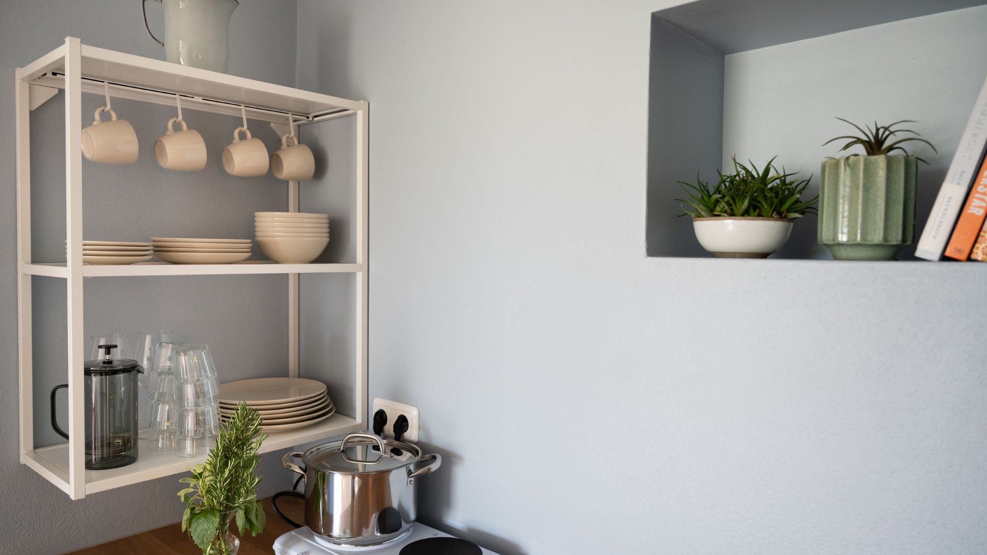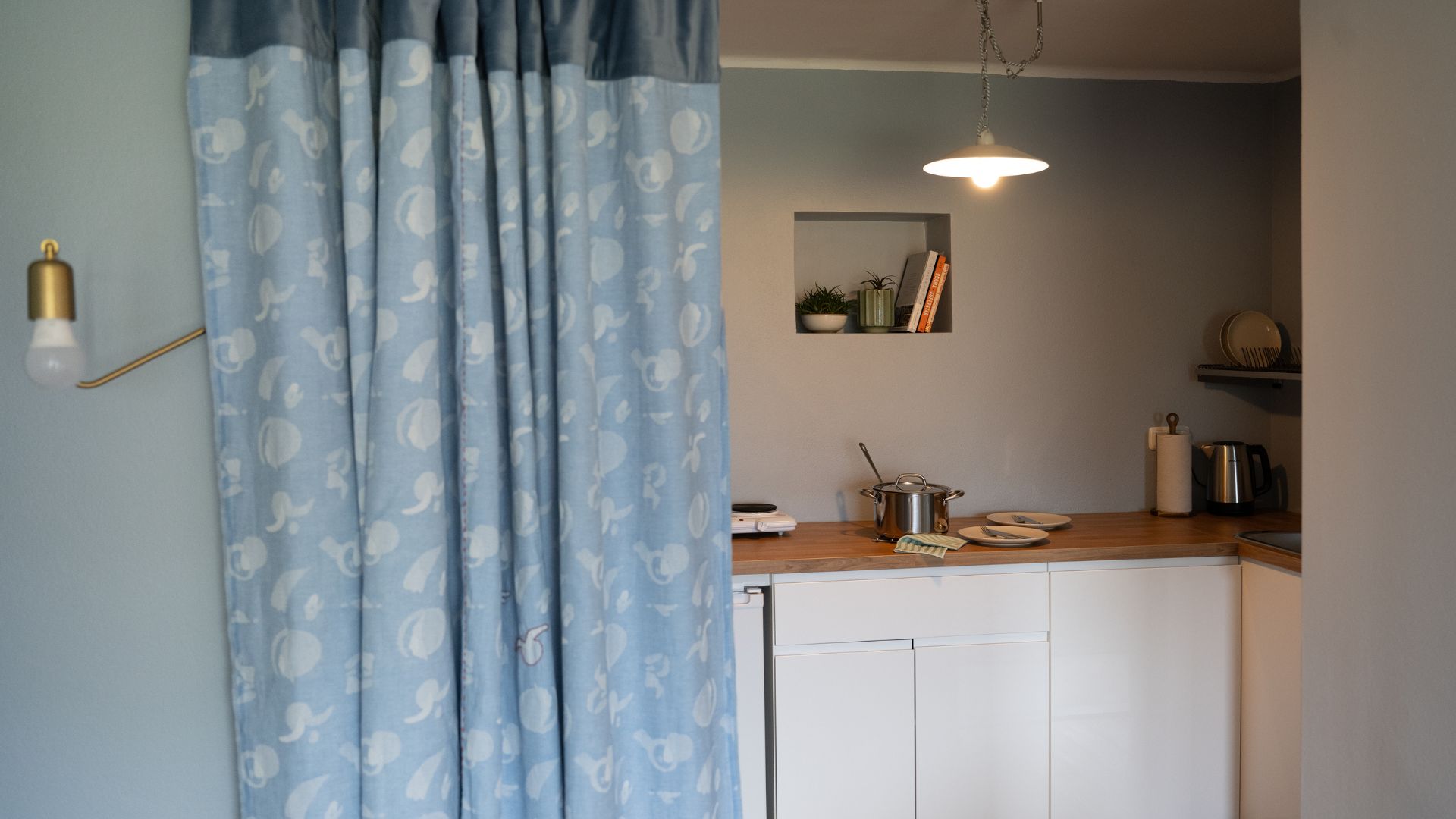 Neue, gemütliche Ferienwohnung mit großer Terrasse mit Panoramablick. Schlafzimmer mit Doppelbett und Wohn-Schlafraum mit Essbereich und einer bequemen Schlafcouch. Teeküche mit Kühlschrank und Doppelherdplatte.