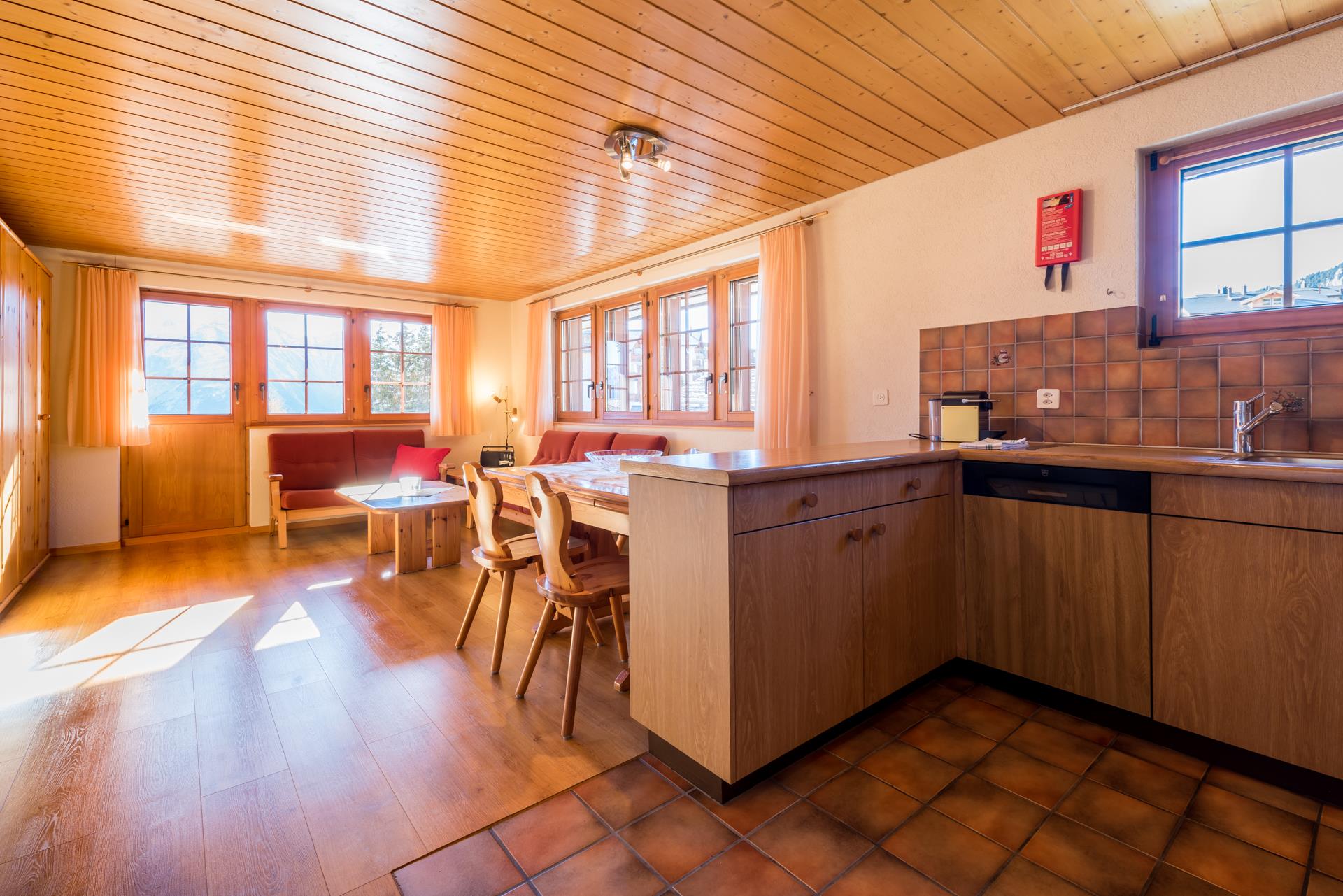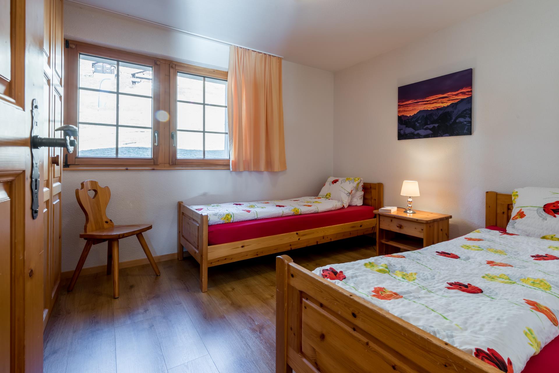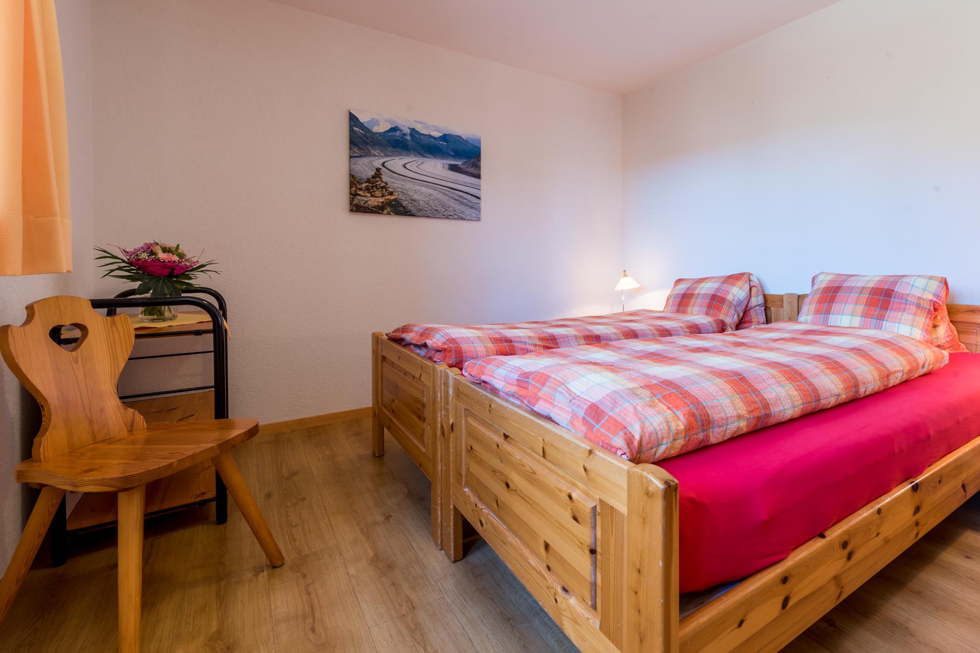 Die 3 1/2-Zimmer-Wohnung bietet Platz für 1 bis 4 Personen. Sie besteht aus zwei separaten Schlafzimmern, einem Wohnraum mit Küche und zwei Klappbetten sowie einem Badezimmer. Der Südwestbalkon eröffnet eine freie Sicht auf die Walliser Viertausender. Die Wohnung ist gepflegt, sehr sauber und komplett ausgestattet mit WLAN, SAT-TV, Geschirrspüler, Liftzugang sowie gemeinsamer Waschmaschine und Trockner. Im Winter steht ein abschliessbarer Skiraum mit moderner Schuhtrocknungs- und Desinfektionsanlage zur Verfügung. Im Sommer lädt eine Liegewiese mit Grillplatz zum Verweilen ein. Alle Wohnungen sind Nichtraucher-Wohnungen.