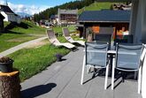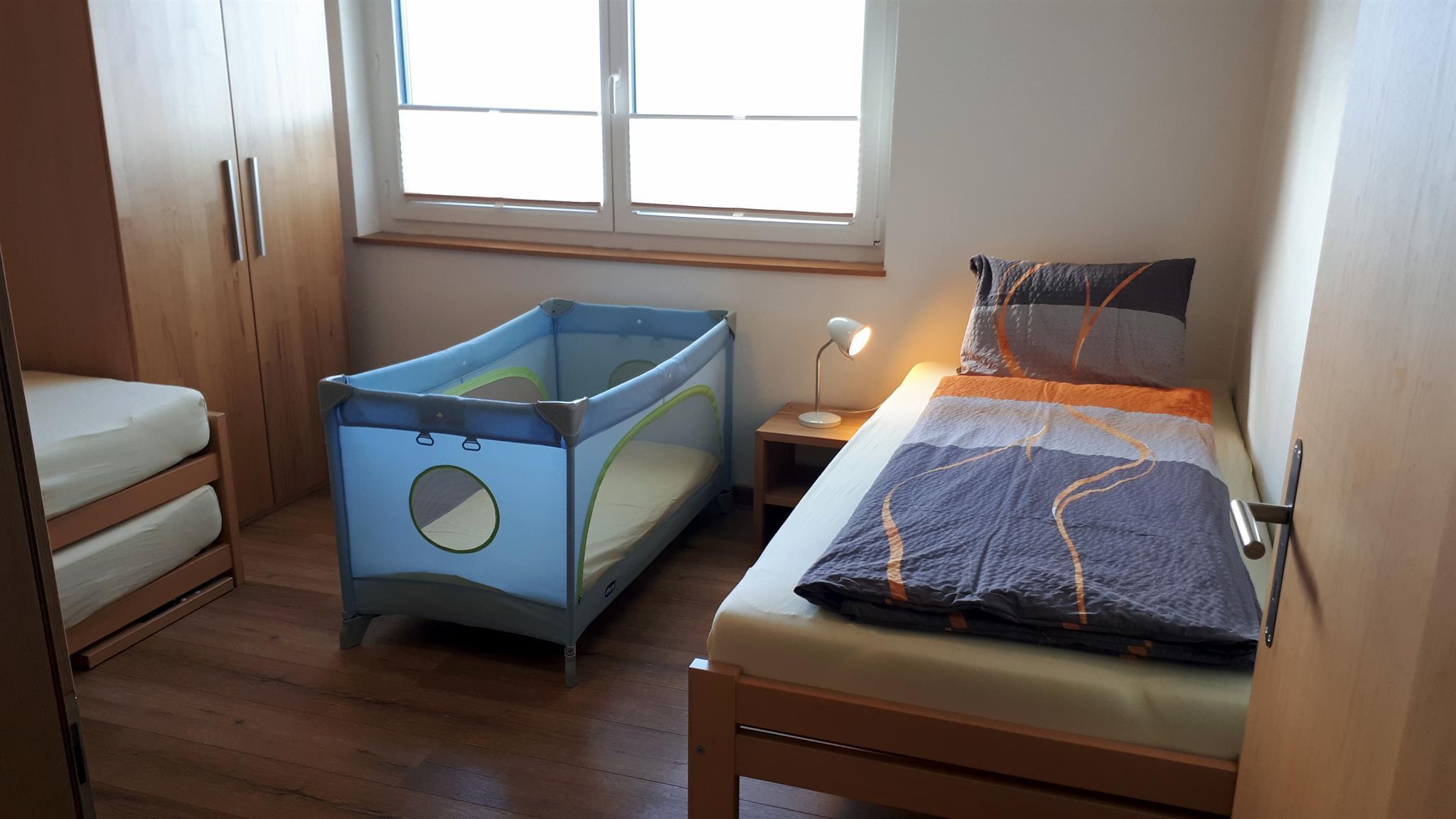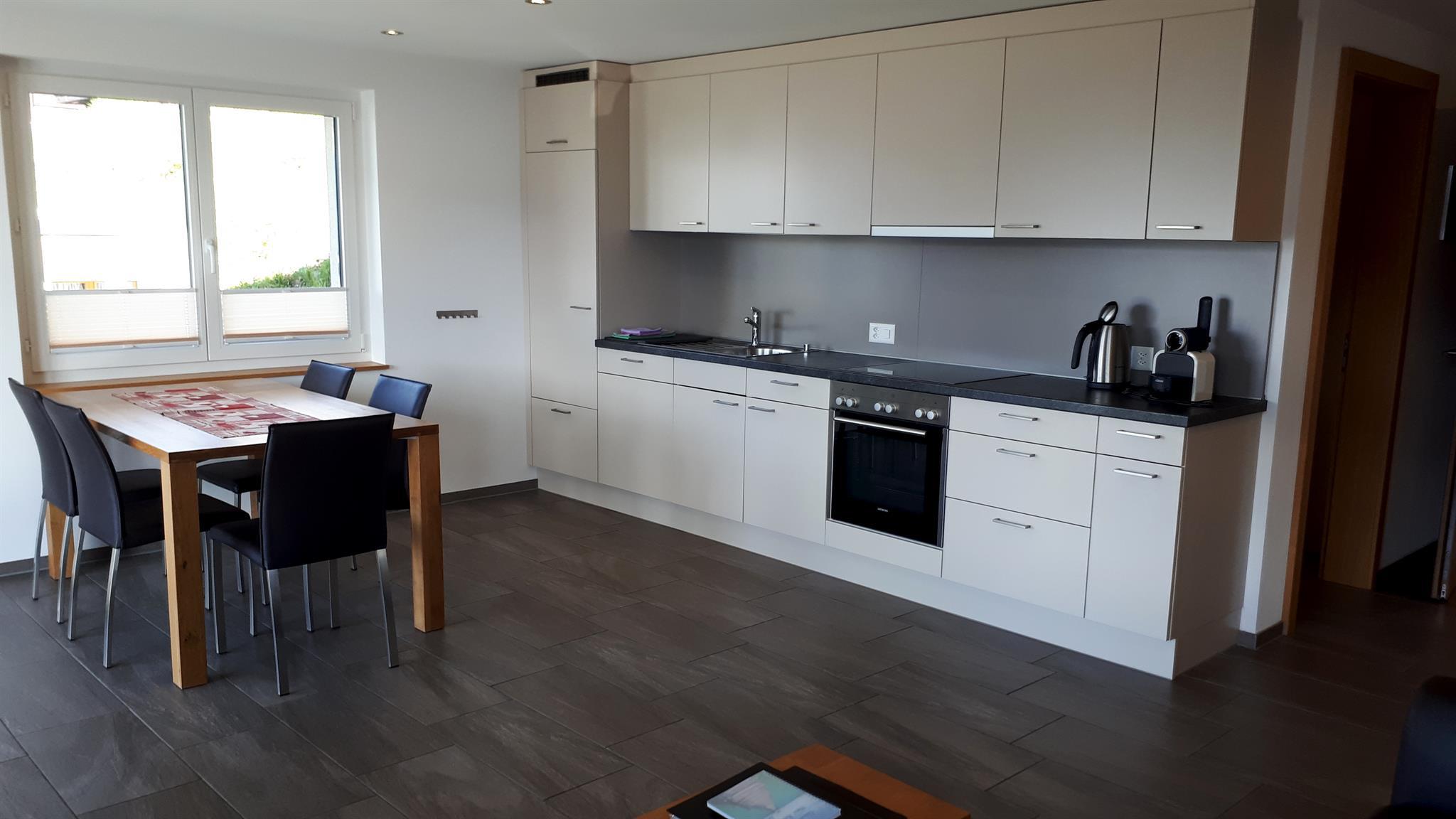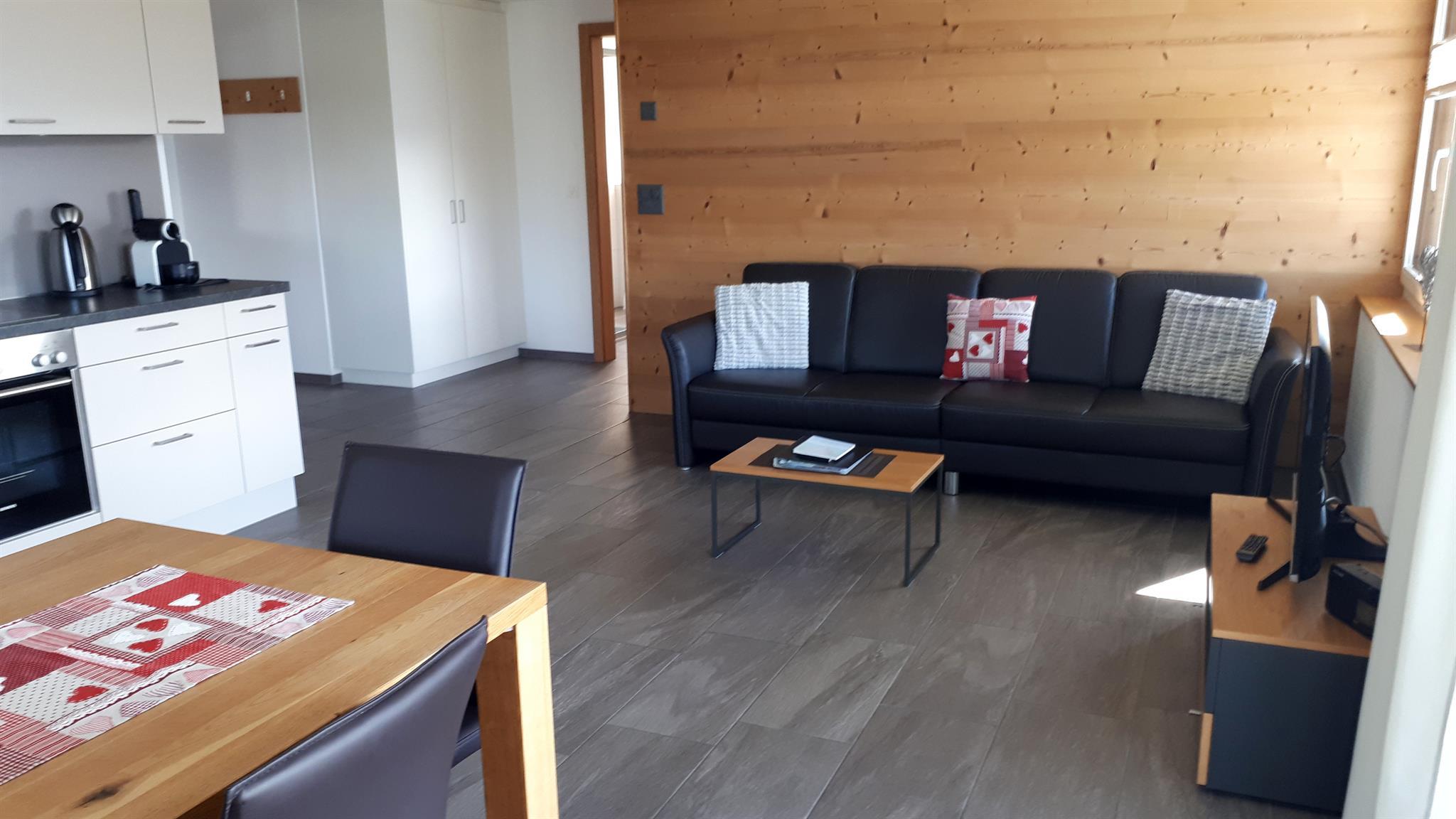 Die 3 1/2 Zimmerwohnung im Erdgeschoss bietet Platz für bis zu fünf Personen. Das Hauptschlafzimmer ist mit einem Doppelbett ausgestattet, während das zweite Schlafzimmer über zwei Einzelbetten sowie ein praktisches Ausziehbett verfügt. Die offene Wohnküche ist hell gestaltet und beinhaltet neben dem Esstisch auch einen Geschirrspüler sowie weitere Küchengeräte für den täglichen Bedarf. Direkt an die Küche schliesst der Wohnbereich mit einem Sofa und einem Fernseher an. Die Nasszelle ist mit einer Dusche, einem Lavabo und einer Toilette ausgestattet. Ein besonderes Highlight ist der nach Süden ausgerichtete Gartensitzplatz, der mit Gartenmöbeln ausgestattet ist und sowohl Sonne als auch Ausblick auf die umliegende Bergwelt bietet.
