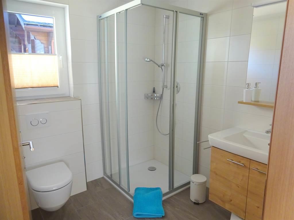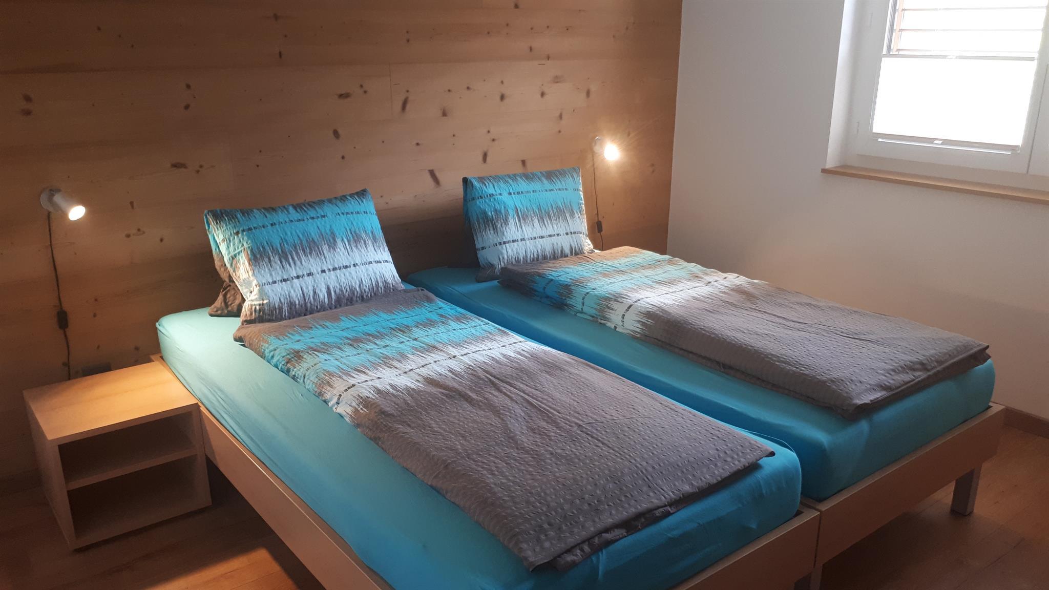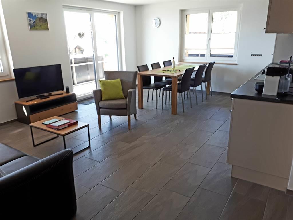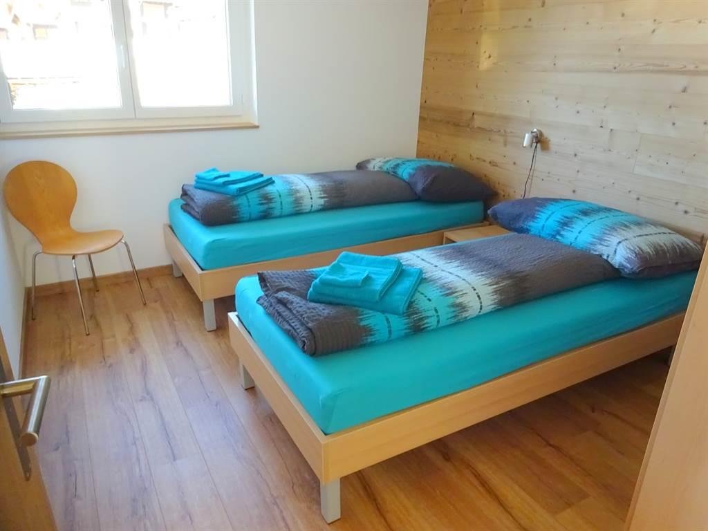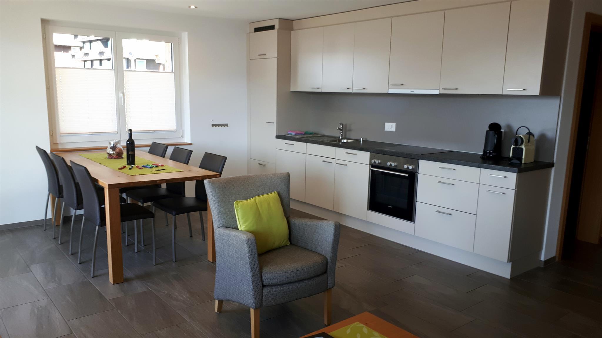 Die 4 1/2 Zimmerwohnung im ersten Stock bietet Platz für bis zu sechs Personen. Das Hauptschlafzimmer ist mit einem Doppelbett ausgestattet, die beiden weiteren jeweils mit zwei Einzelbetten. Die offene Wohnküche ist hell gestaltet und beinhaltet neben dem Esstisch auch einen Geschirrspüler sowie weitere Küchengeräte für den täglichen Bedarf. Direkt an die Küche schliesst der Wohnbereich mit einem Sofa und einem Fernseher an. In der Wohnung hat es zwei moderne Badezimmer mit je einer Dusche, einem Lavabo und einer Toilette. Ein besonderes Highlight ist der nach Süd/West ausgerichtete Balkon, der mit Gartenmöbeln ausgestattet ist und sowohl Sonne als auch Ausblick auf die umliegende Bergwelt bietet.
