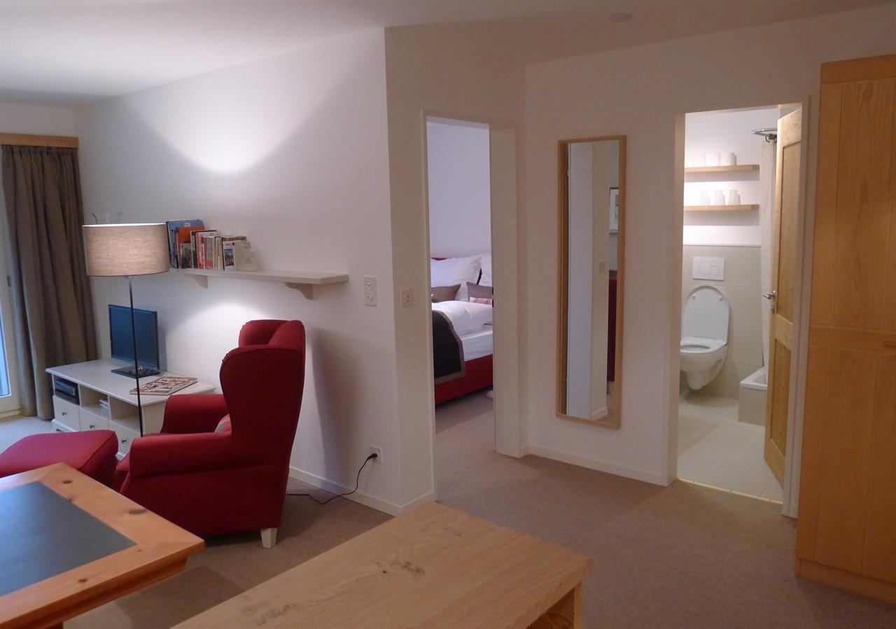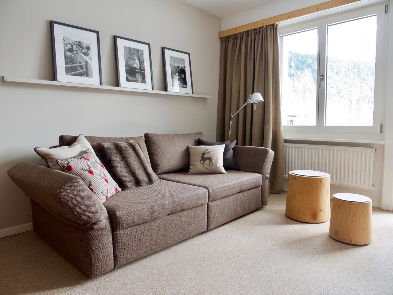 Die 2,5-Zimmer-Wohnung wurde vollständig im modernen Alpen-Stil renoviert und verfügt über eine offene, voll ausgestattete Küche mit Spülmaschine, Mikrowelle, Backofen und Nespresso-Kaffeemaschine. Das Schlafzimmer ist mit einem komfortablen Boxspring-Doppelbett eingerichtet, im Wohn- und Essbereich steht eine hochwertige Schlafcouch zur Verfügung. Für Unterhaltung sorgen ein Flachbild-TV mit DVD-Player. Das Badezimmer ist mit einer Dusche und WC ausgestattet. Im Haus stehen Waschmaschine, Trockner sowie ein Ski- und Fahrradraum zur Mitbenutzung bereit.