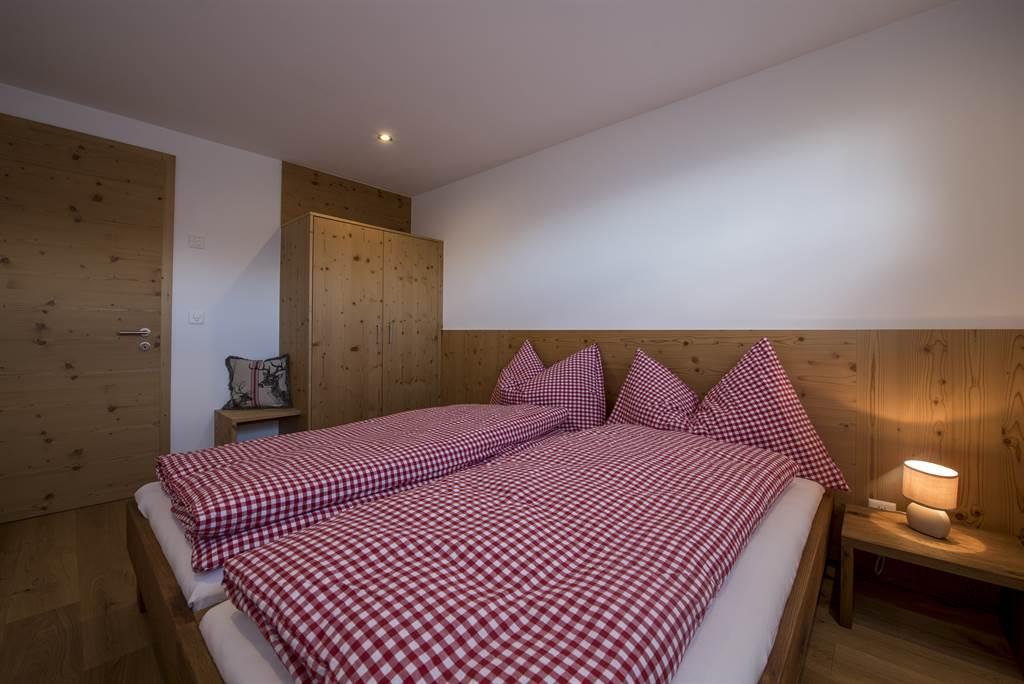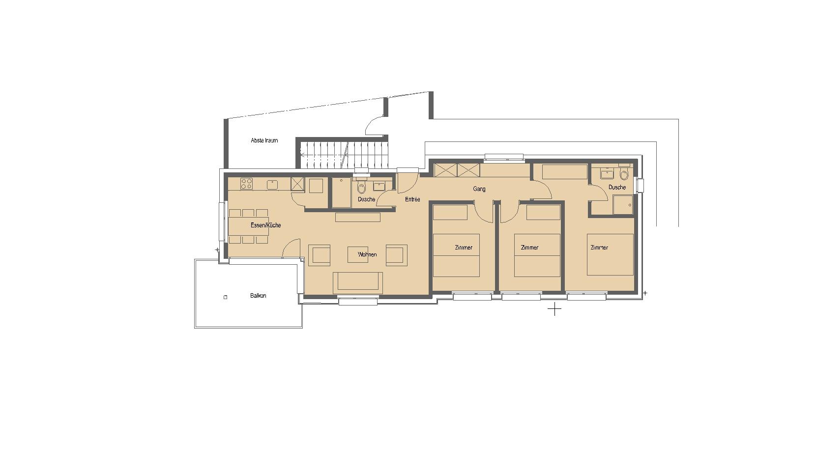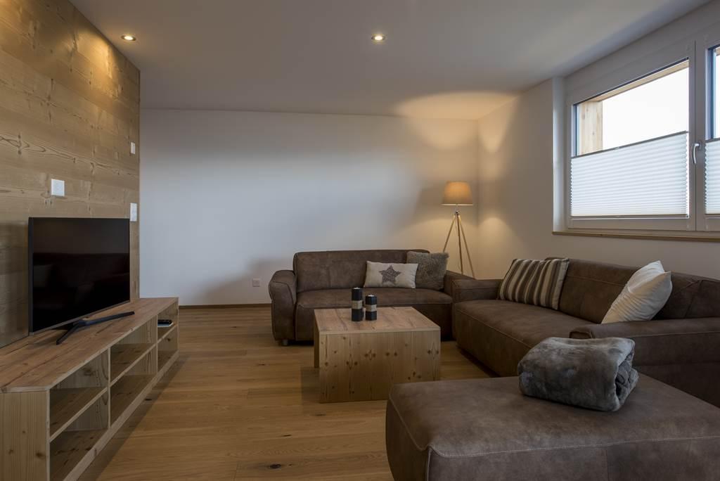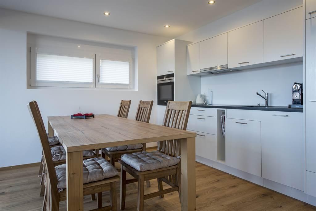 Die 4 1/2-Zimmerwohnung verfügt über drei Schlafzimmer: zwei Zimmer mit je zwei Einzelbetten sowie ein Zimmer mit einem Doppelbett. Die Wohnung ist mit zwei Nasszellen ausgestattet – eine mit Dusche und WC, die andere mit Badewanne und WC. Die offene Küche ist mit einem Geschirrspüler eingerichtet und führt in einen grosszügigen Wohnbereich mit direktem Zugang zum sonnigen Süd-Balkon.