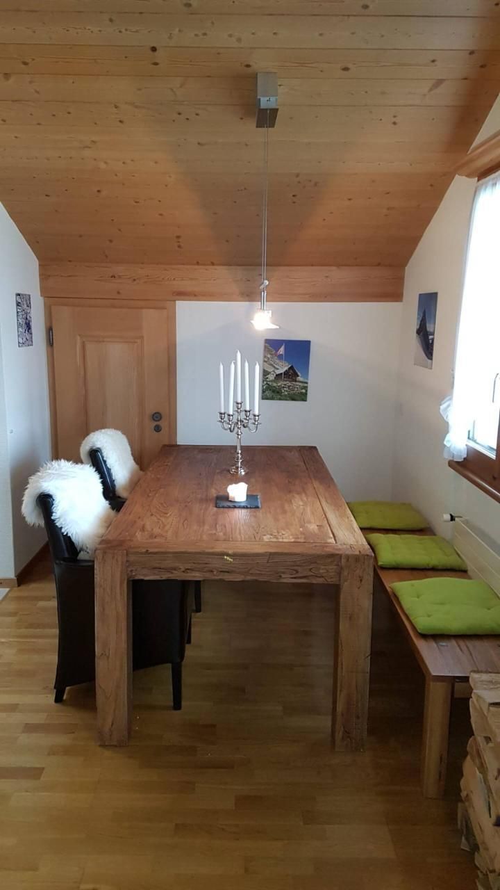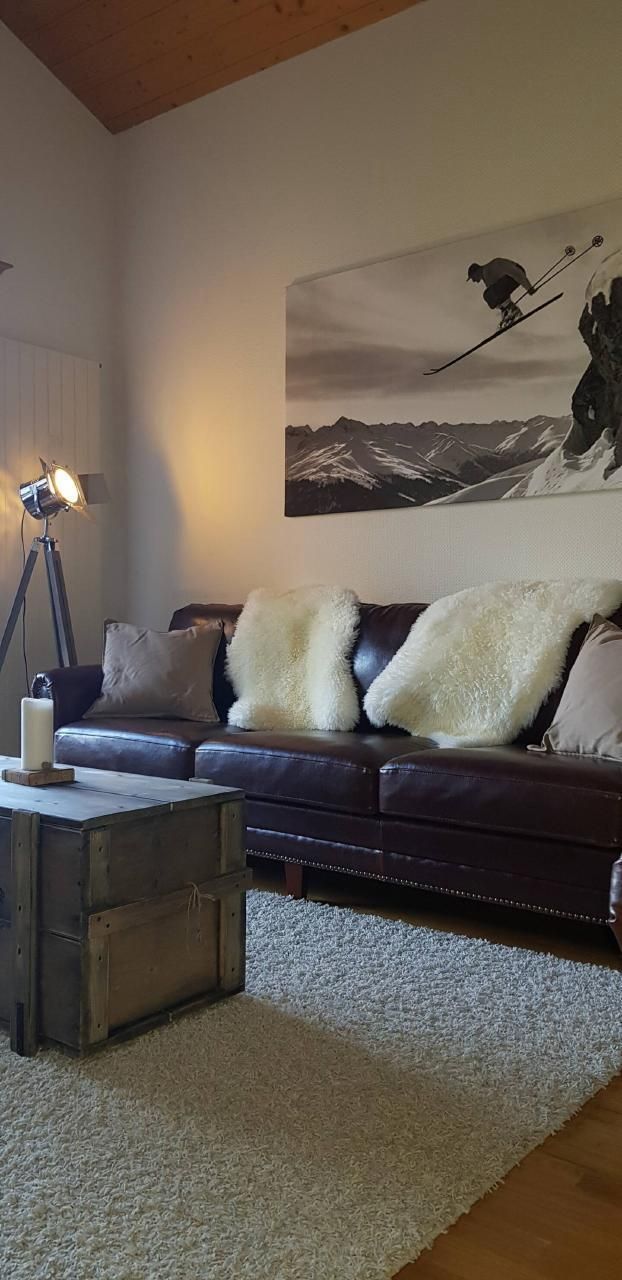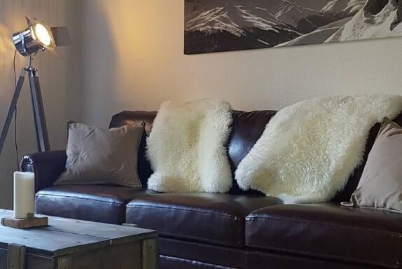 Das Innere unserer Wohnung verzaubert mit einem stilvoll im Alpen-Chic eingerichteten Wohnzimmer, welches mit diversen Lichtquellen eine einladende Atmosphäre schafft. Ein großer Esstisch mit bequemen Sesseln und Holzbank sowie eine sehr gut und praktisch eingerichtete Küche mit allen nötigen Utensilien inklusive dem typisch-schweizerischen Raclette-Ofen und Fondue-Set erwarten Sie. Und für die gemütlichen Stunden stehen diverse Spiele, ein Tischtennis-Tisch, Fernseher und DVD sowie kostenloses und schnelles WLAN zur Verfügung – für Groß und Klein ist also in jedem Fall gesorgt.