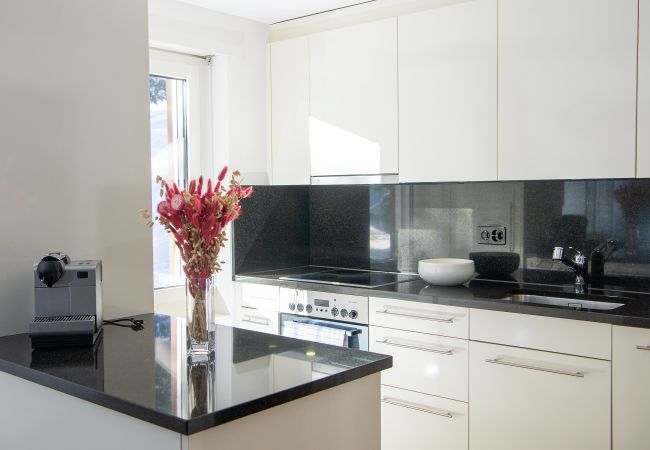 Die offene Küche ist modern und komplett ausgestattet mit einem elektrischen Kochfeld, Kühlschrank, Backofen, Geschirrspüler, sowie Geschirr, Besteck, Kochutensilien, einer Kaffeemaschine und einem Wasserkocher – alles, was Sie brauchen, um Ihre Lieblingsgerichte zuzubereiten.