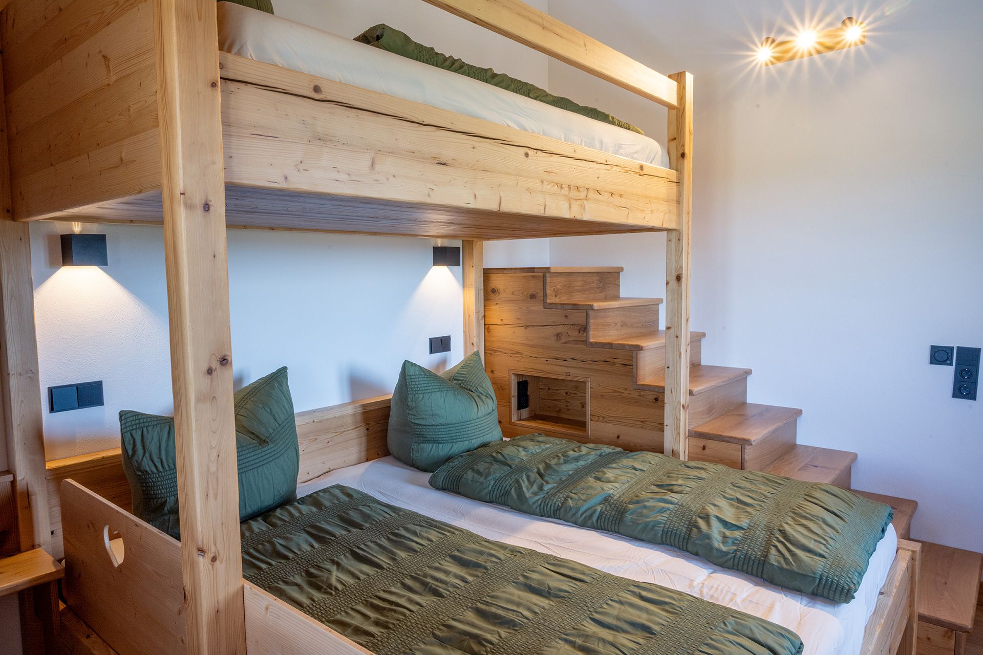 Diese liebevoll gestaltete Ferienwohnung bietet viel Platz für Paare, Familien oder Freunde, die Komfort und ein besonderes Urlaubserlebnis suchen. Es stehen 3 gemütliche Schlafzimmer zur Verfügung. Ein Schlafzimmer (16,9 m²) mit Doppelbett, das zweite Schlafzimmer (13,6 m²) mit Doppelbett und darüber quer 1 Einzelbett (über Treppe erreichbar). Besonders beliebt bei Kindern ist das dritte Schlafzimmer (6,7 m²) auf der Galerie mit Doppelbett . Der lichtdurchflutete Wohnbereich (25 m²) schafft eine gemütliche Atmosphäre, ergänzt durch eine moderne Wohnküche (20,16 m²) – perfekt für gemeinsame Kochabende.