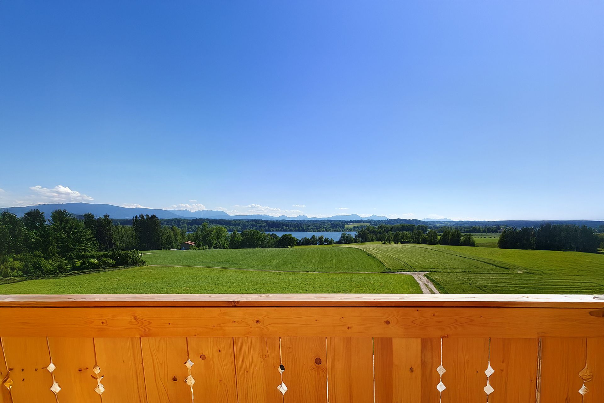Ein großer Balkon mit Blick ins Grüne und den Waginger See rundet das Wohnerlebnis ab – ideal für einen entspannten Start in den Tag oder einen ruhigen Abend bei einem Glas Wein.