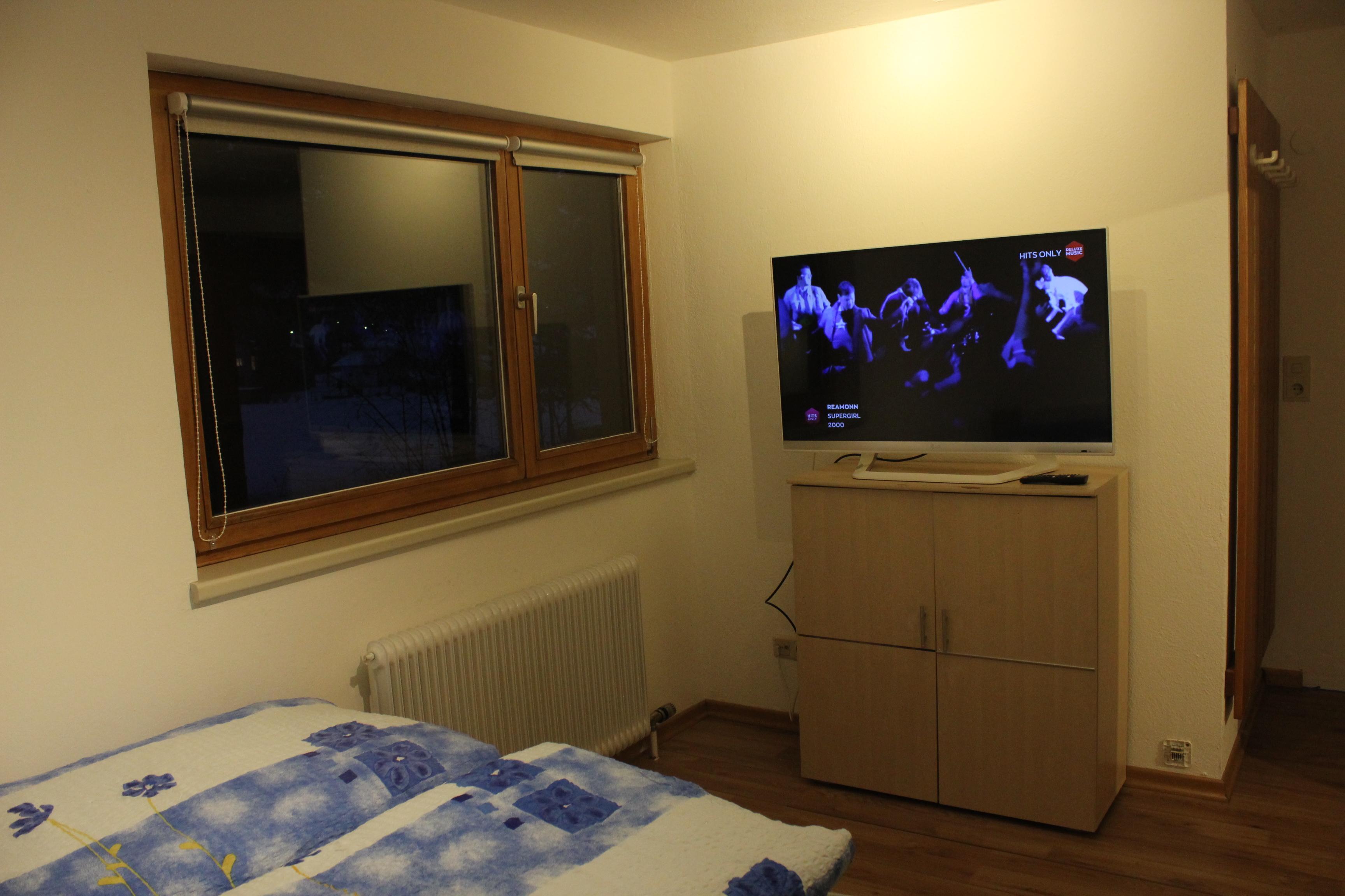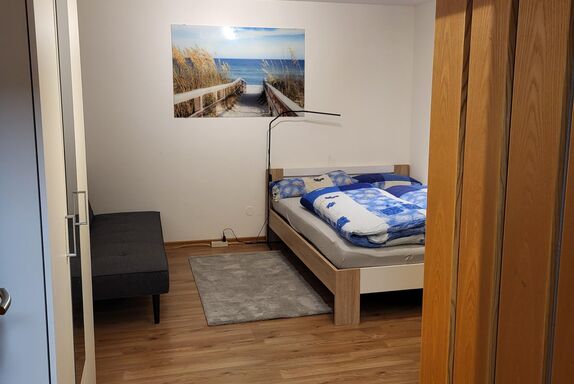 im Schlafzimmer befindet sich ein Französisches Bett, eine Couch zum Ausziehen für 1 weitere Person, kleiderkasten, fernsehkasten, Fernseher.