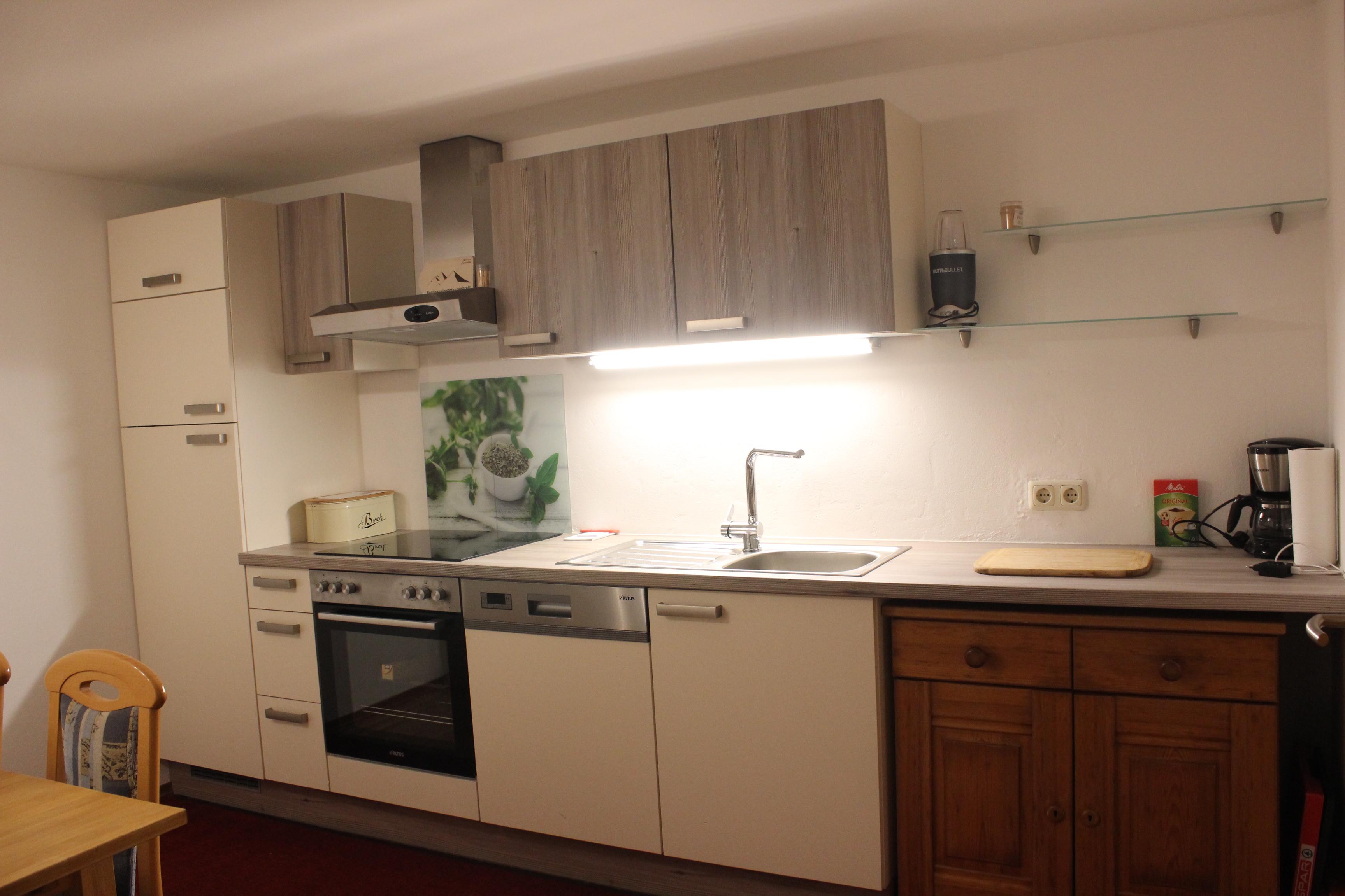 Die KÜche ist voll ausgestattet mit Herd, Backofen, Dunstabzug, kühlschrank, Tiefkühlfach, Küchengeräte, etc.