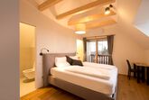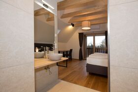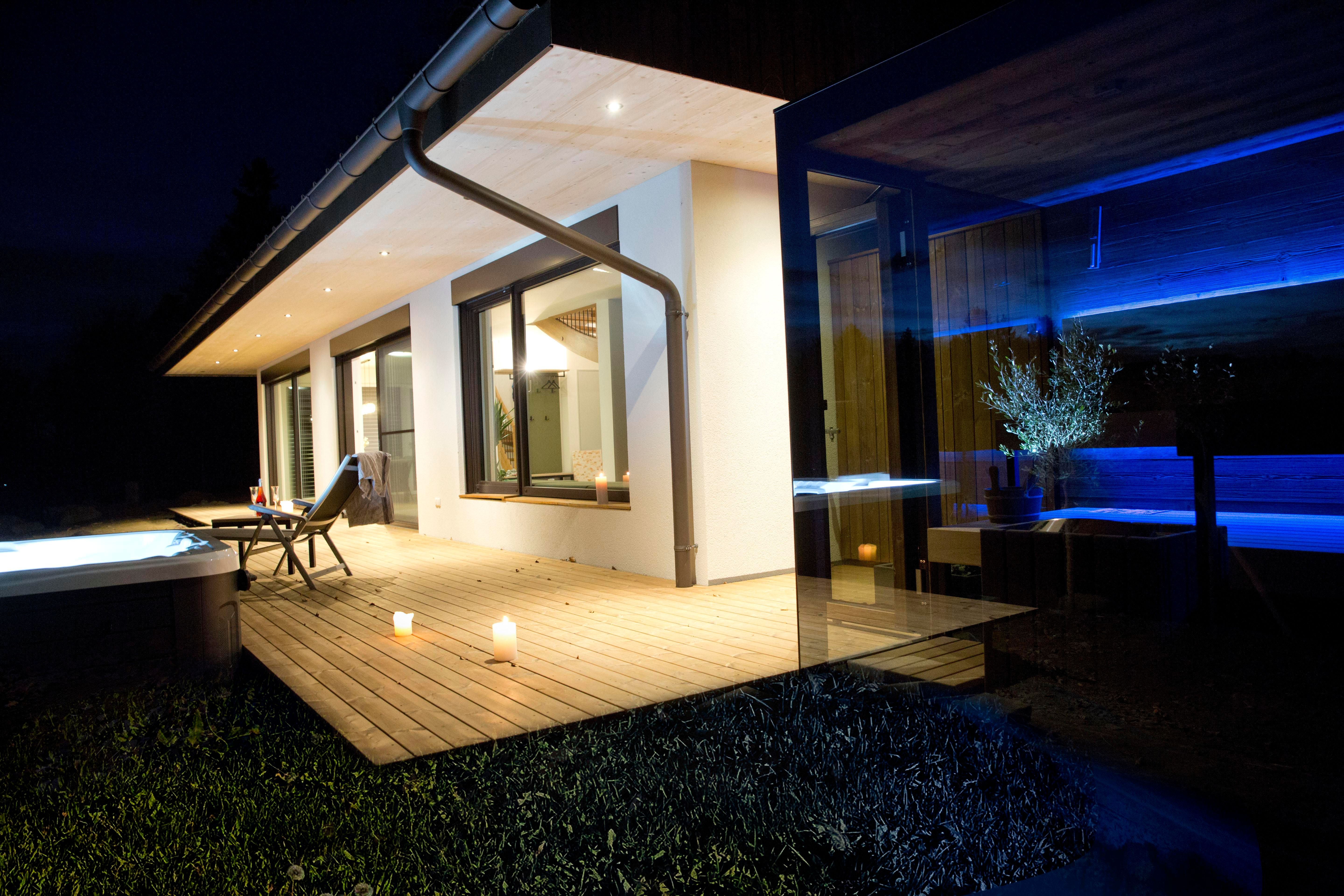 Auf der Holzterrasse können Sie die Sonne den ganzen Tag über genießen, sich im privaten Whirlpool entspannen oder in der stilvollen Spiegelsauna den Abend ausklingen lassen.