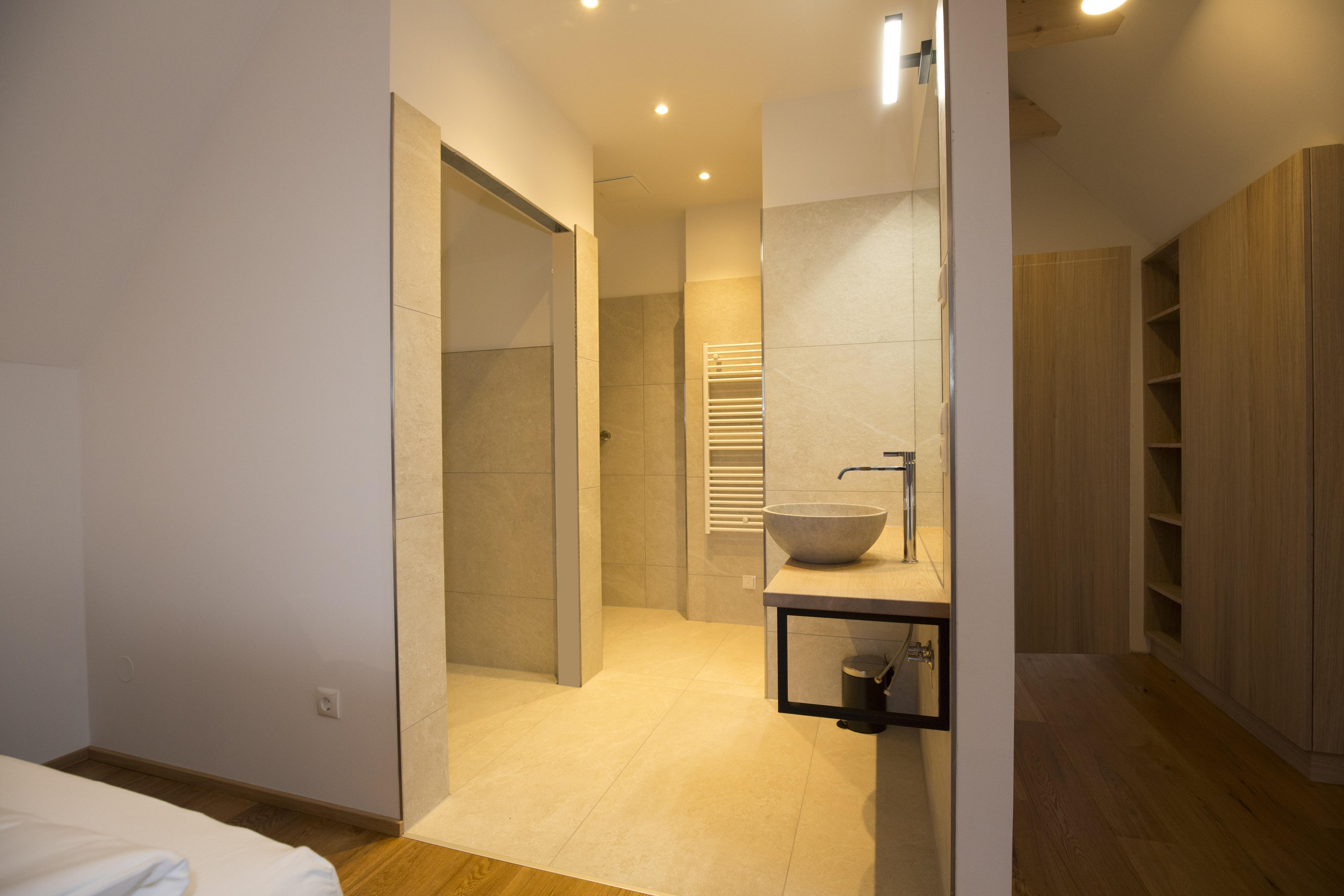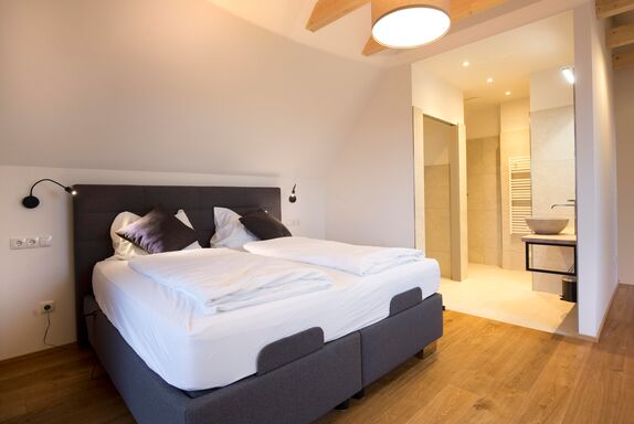 Im Obergeschoss erwarten Sie zwei separate Schlafsuiten mit komfortablen Boxspringbetten sowie jeweils einem eigenen Dusch- und WC-Bereich für höchsten Wohnkomfort.