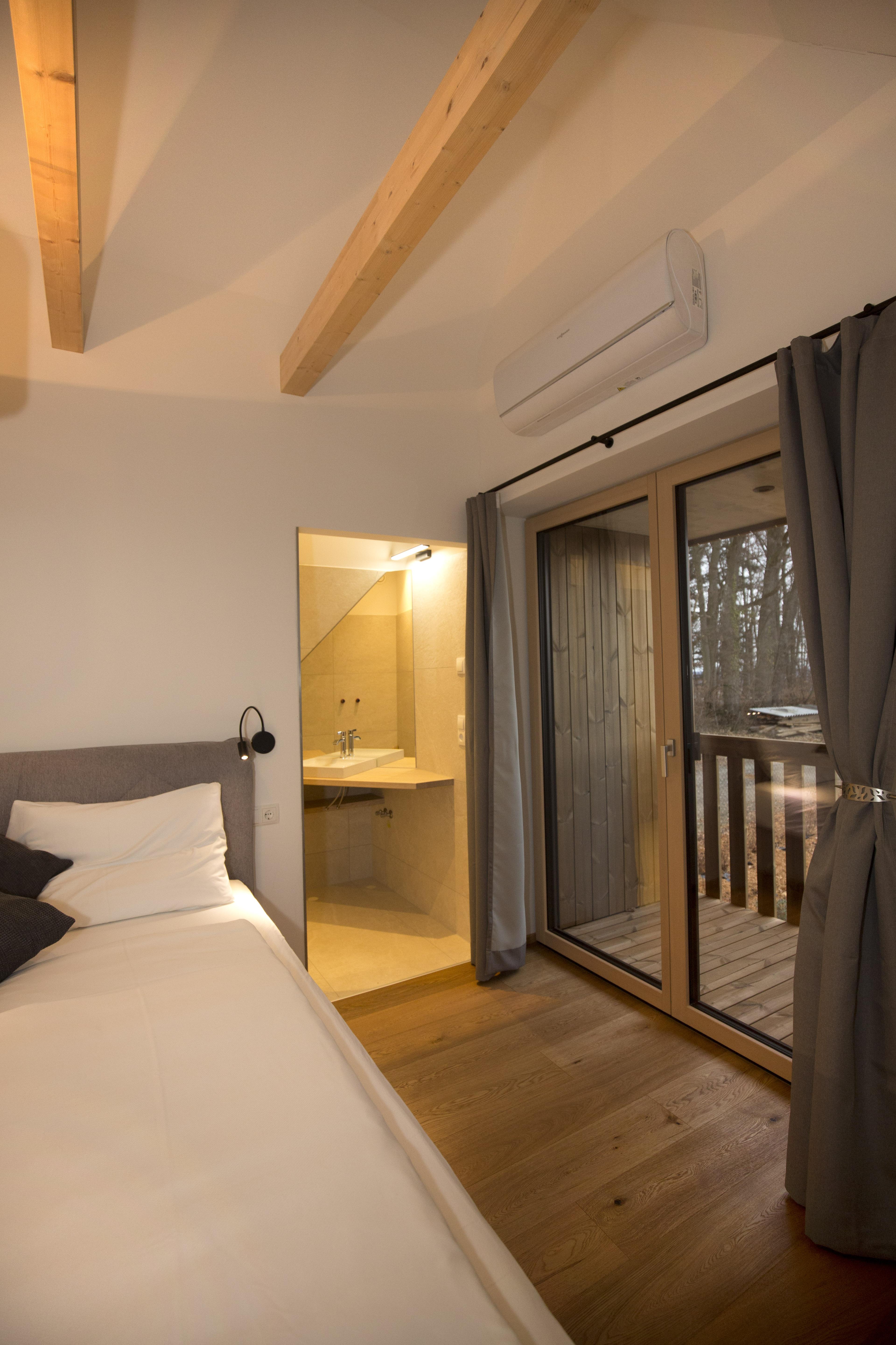 Das großzügige Erdgeschoss, das teilweise barrierefrei gestaltet ist, beeindruckt mit einer voll ausgestatteten Tischlerküche und einem gemütlichen Wohnbereich mit Schlafcouch. Großflächige Glasfronten ermöglichen einen ungehinderten Blick in die Natur und schaffen eine helle, offene Atmosphäre. Das Interieur aus heimischer Eiche, ergänzt durch elegante Schwarzstahl-Akzente, verleiht dem Raum eine warme und einladende Note.