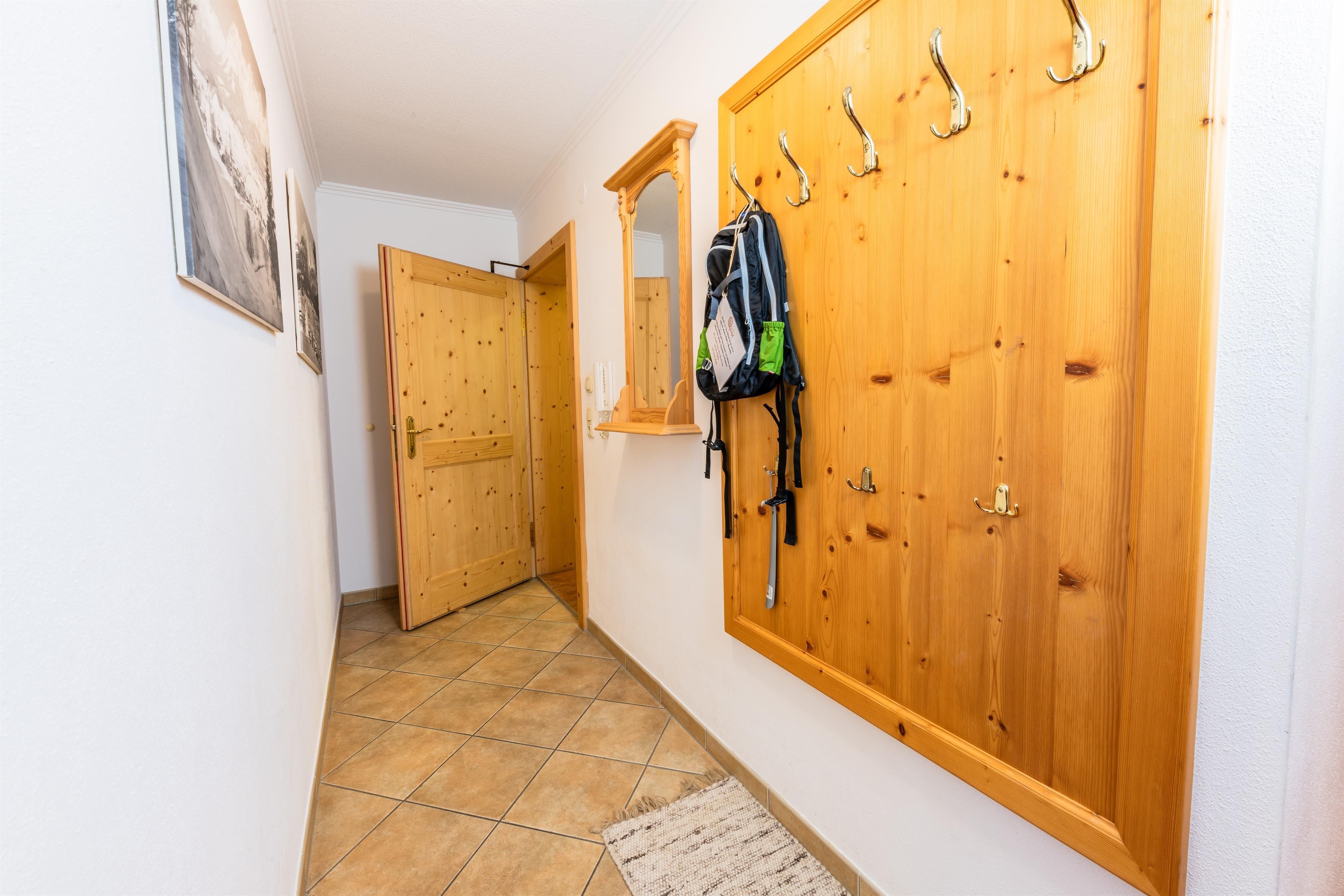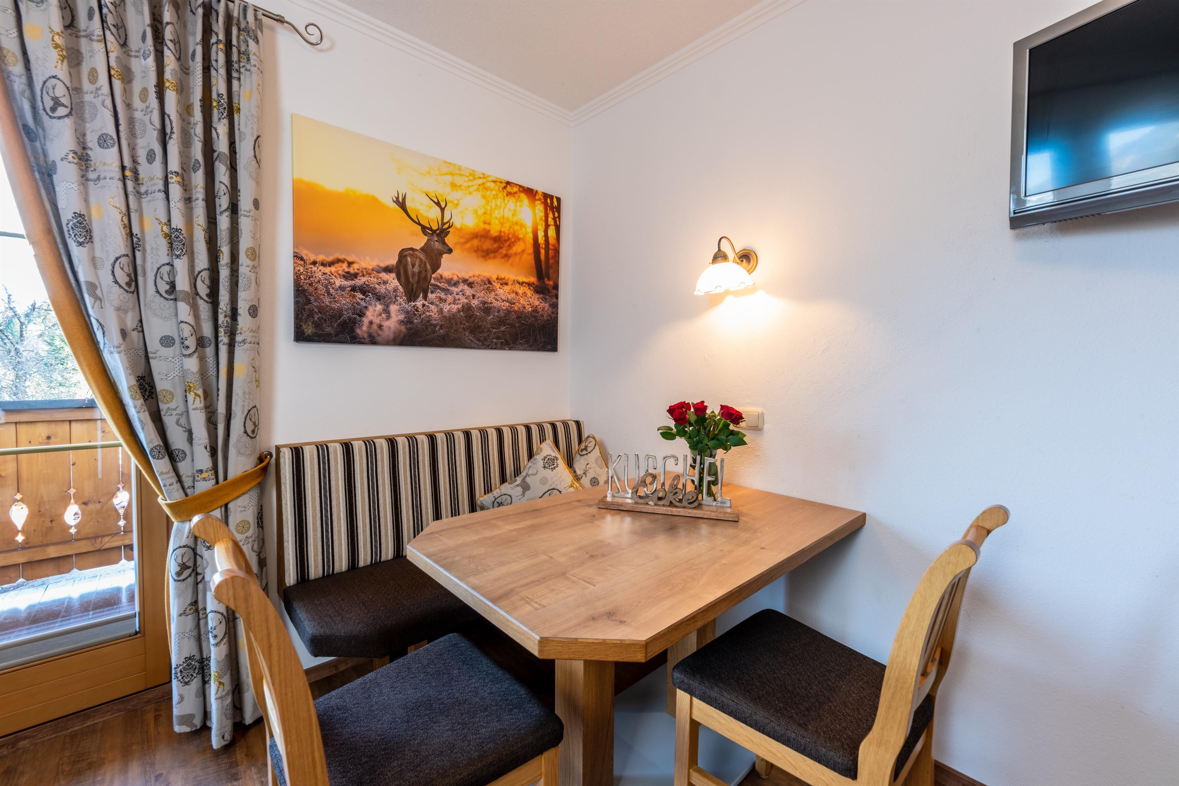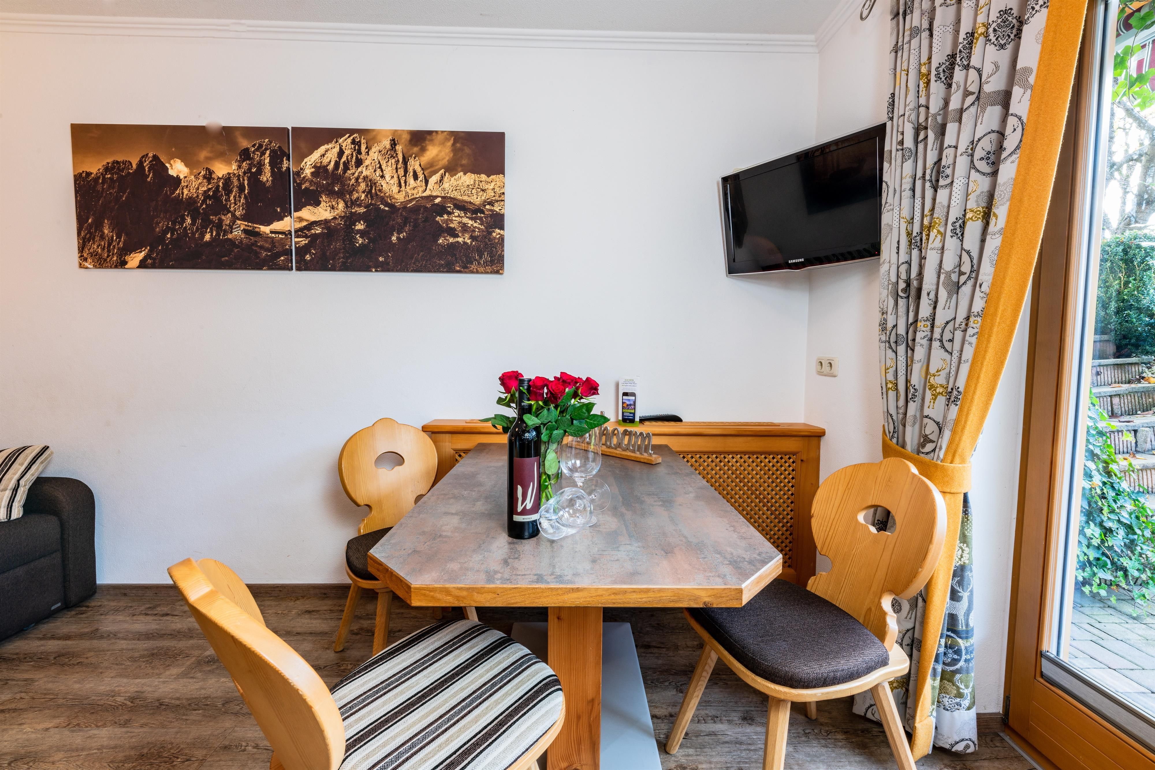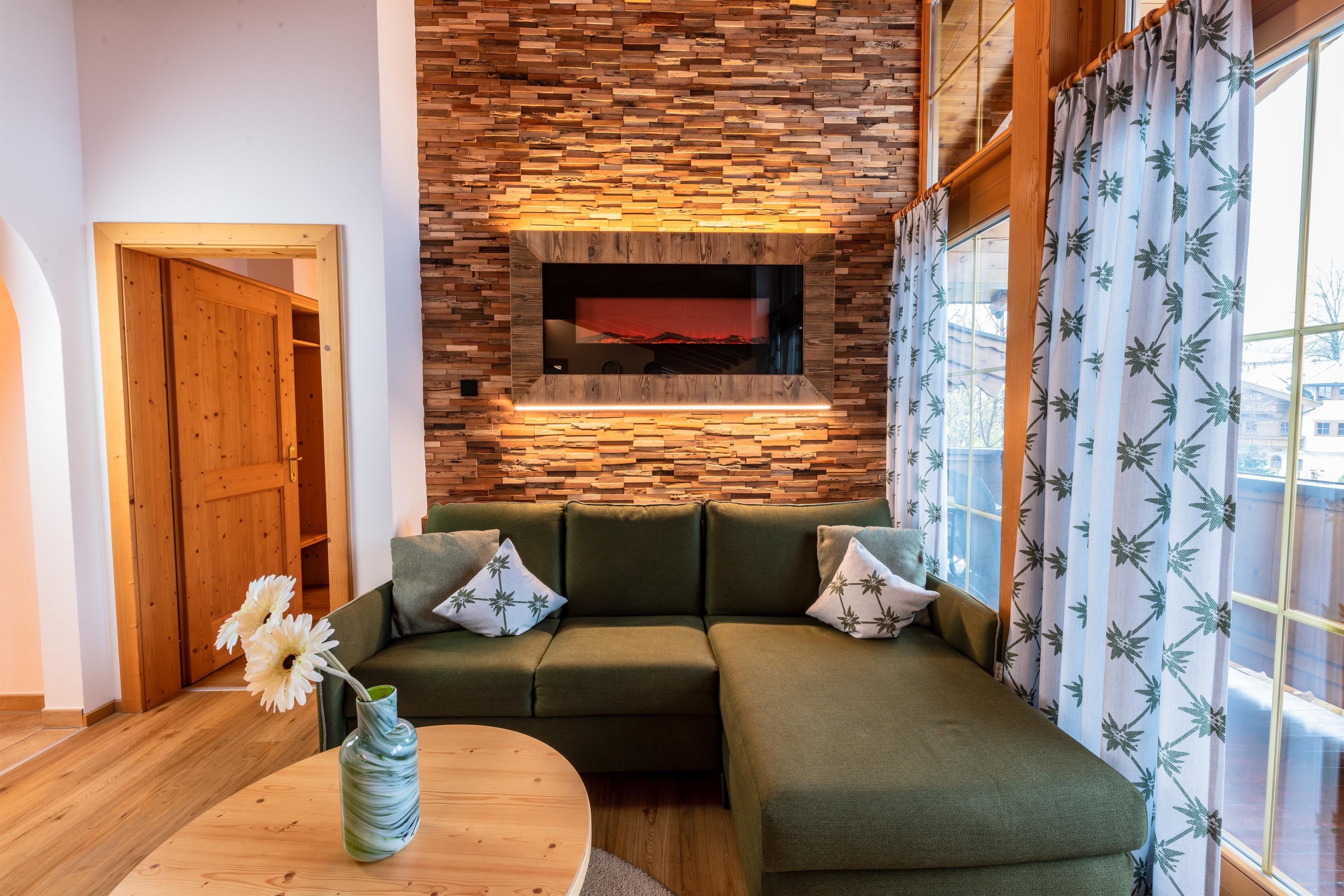 Das Apartment befindet sich im Dachgeschoss. Der Dachstuhl wurde aufwendig in Sichtbauweise gefertigt. Von den zwei möblierte Balkone aus, sieht man einmal auf den Dorfplatz und einmal Blickrichtung Wilder Kaiser. Das Apartment ist mit ein großen Wohn- Schlafraum mit Kachelofen, einer voll ausgestatteter Küche, einem Badezimmer und zwei Schlafzimmern ausgestattet. Im Schlafzimmer eins, befindet sich ein Doppelbett und im Schlafzimmer zwei, stehen zwei Einzelbetten zur Verfügung.