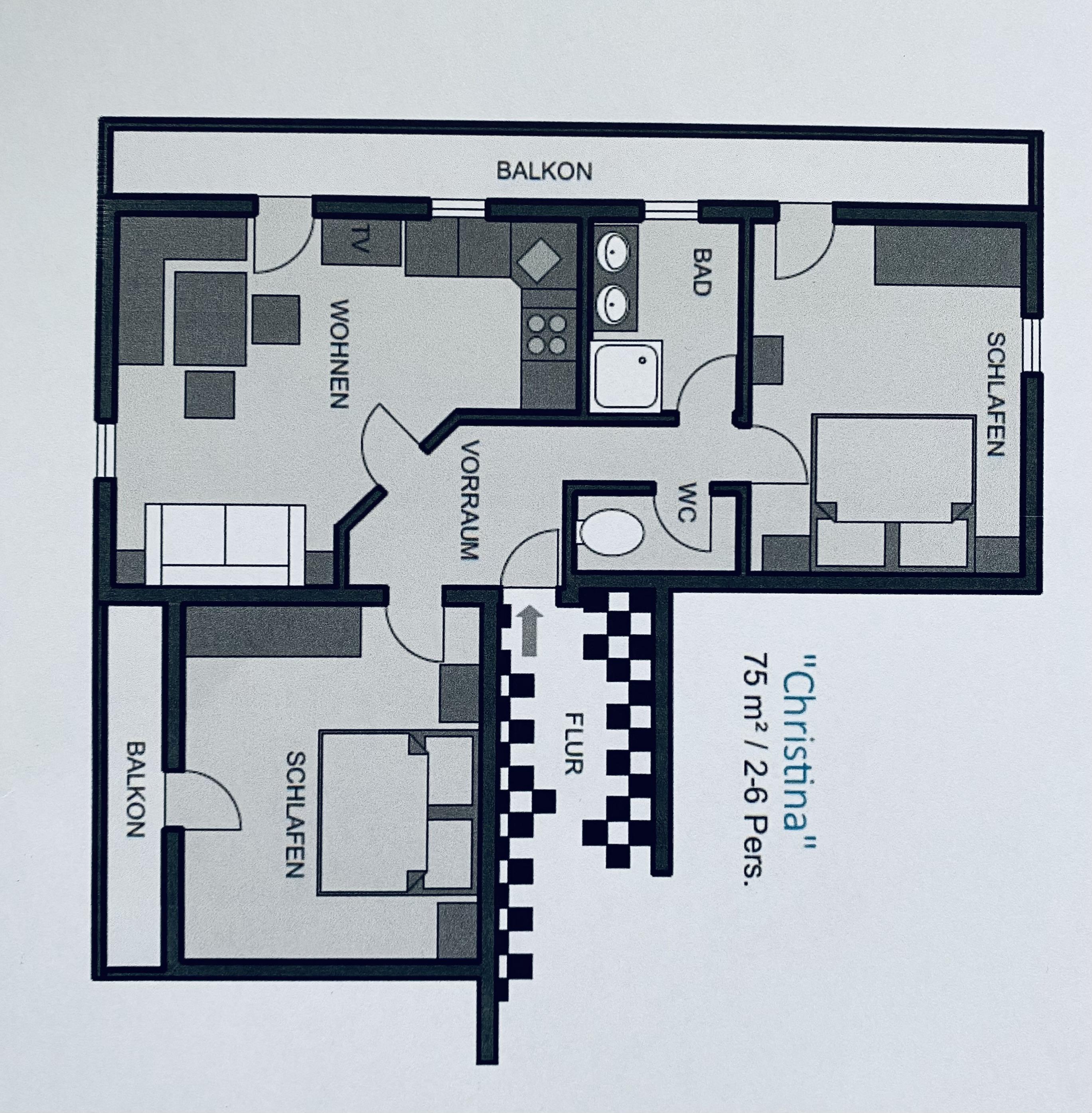 75m² große FeWo für 2-4 Pers. gr. Wohnküche, 2 Schlafzimmer mit Doppelbetten,