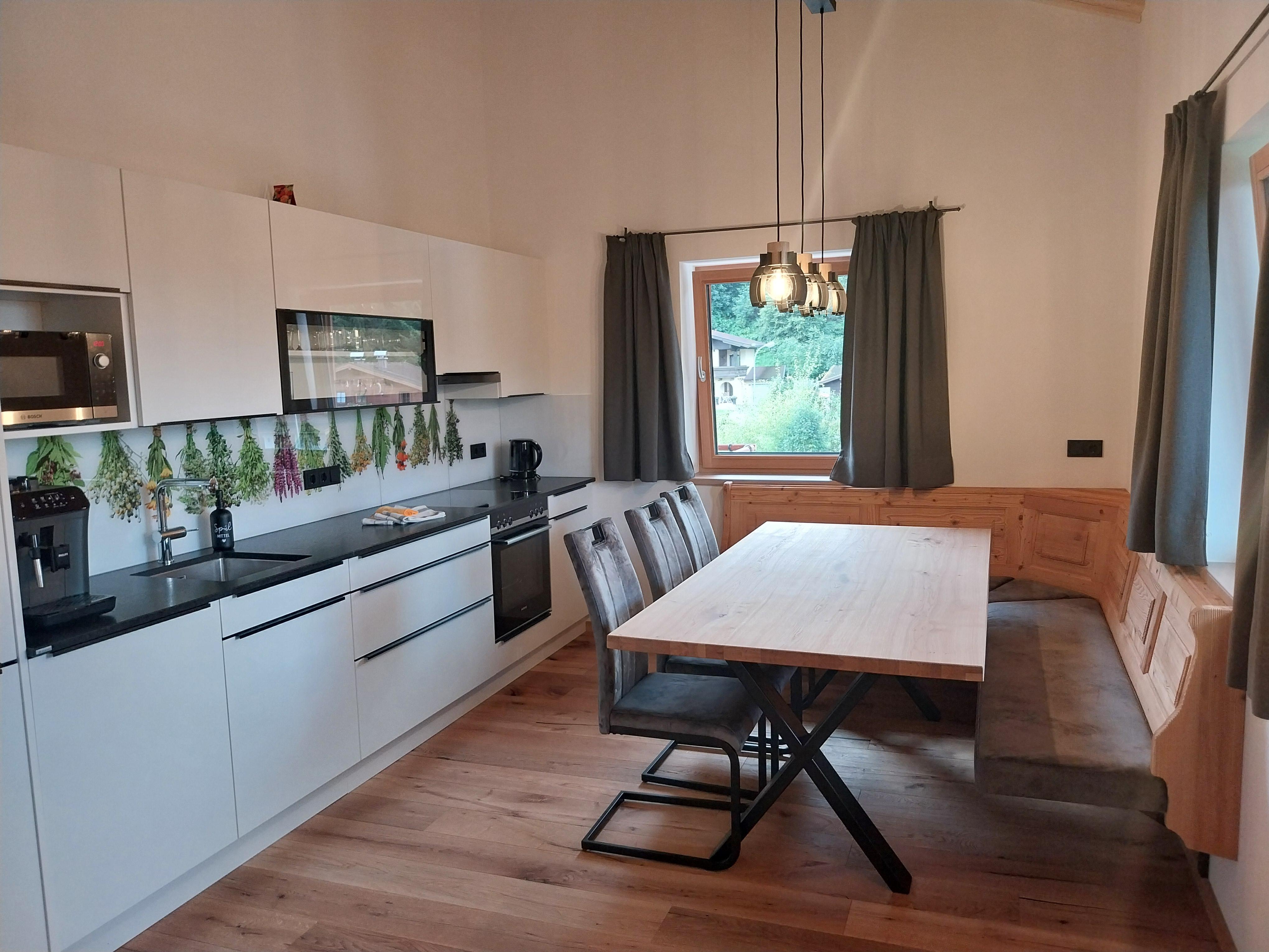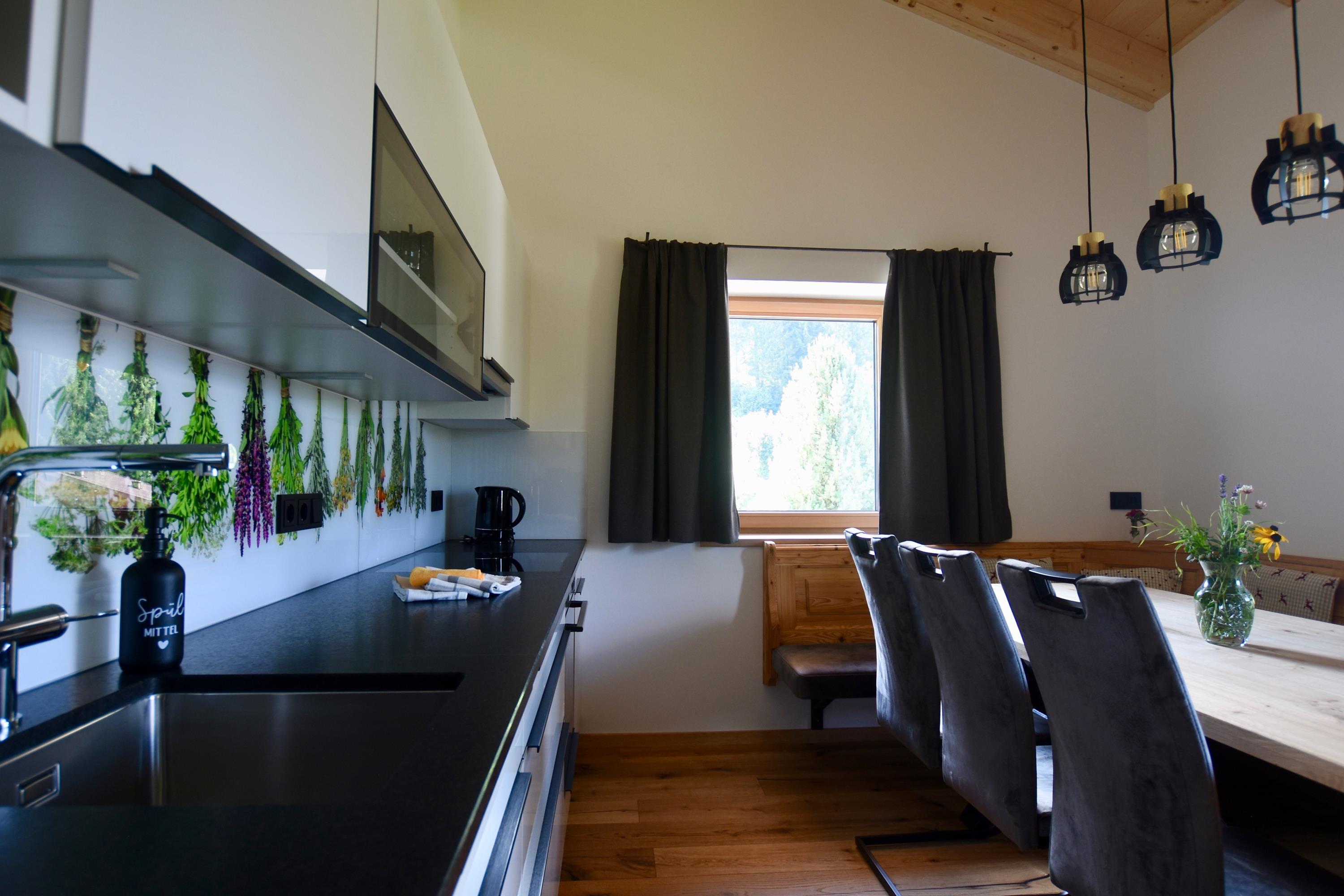 Flat-TV I WiFi | voll ausgestattete Hochglanzküche mit hochwertigen Elektrogeräten (Mikrowelle, Kaffeemaschine, Geschirrspüler) | Natursteinarbeitsplatte | Eichen-Parkett | Vollholz-Schränke und -Tische | frische BIO Heumilch | Zirbenbetten | Infrarot-Relaxliegen | abgetrennter Smart-Working-Bereich | 3 Balkone mit Sitzmöbeln und Bergblick
