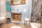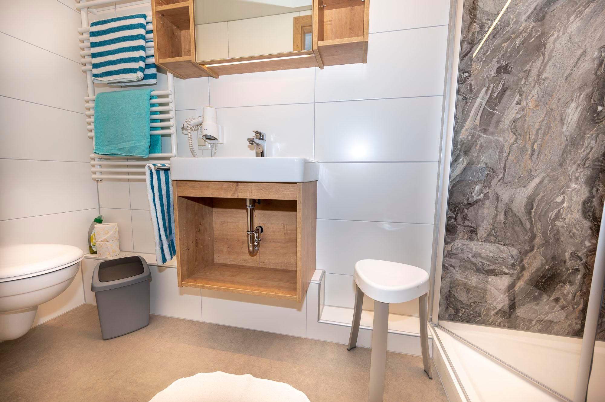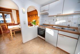 Ferienwohnung mit Schlafzimmer, Wohnzimmer mit Doppelbett, Küche, WC, Dusche/WC und Balkon