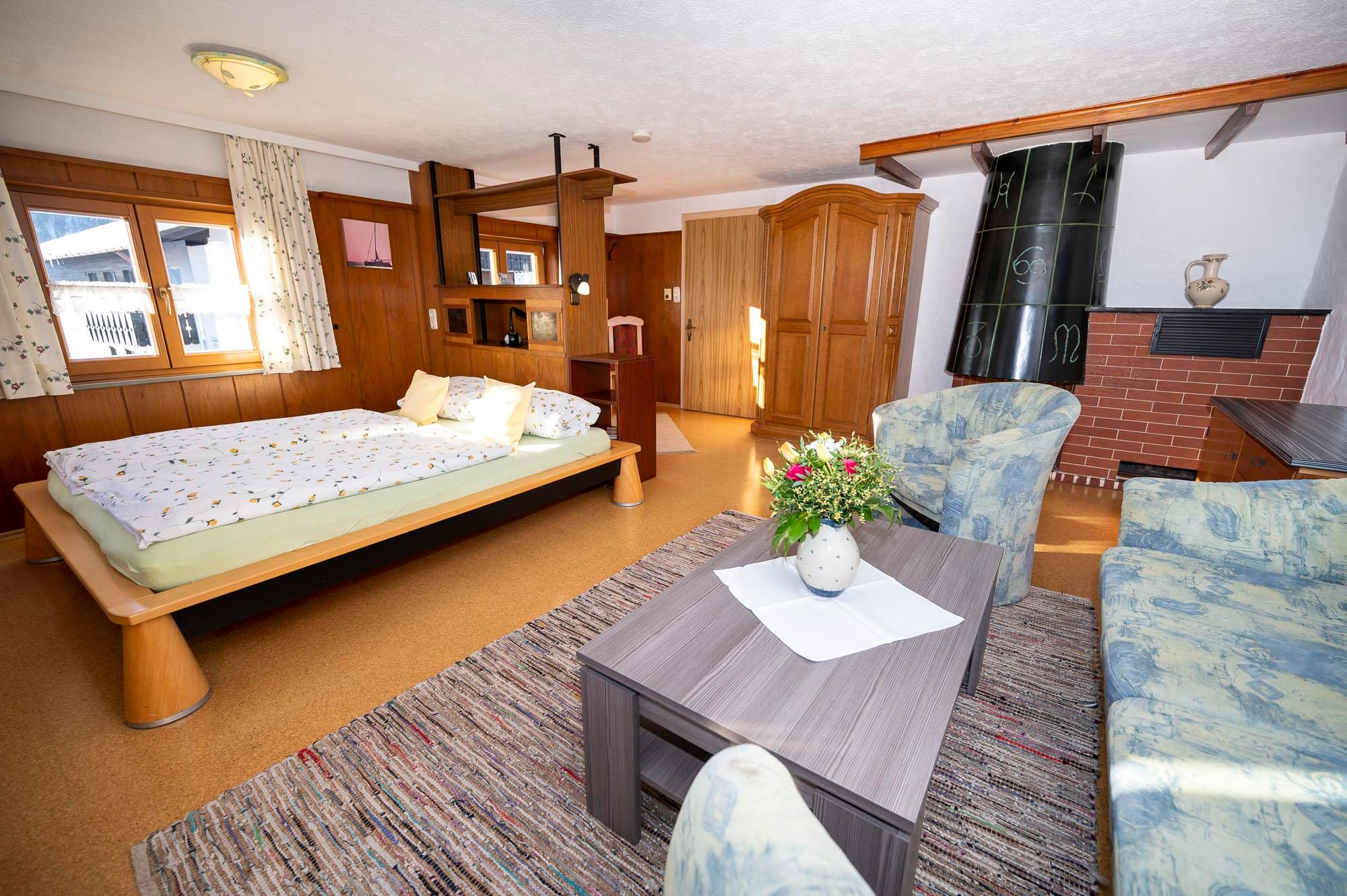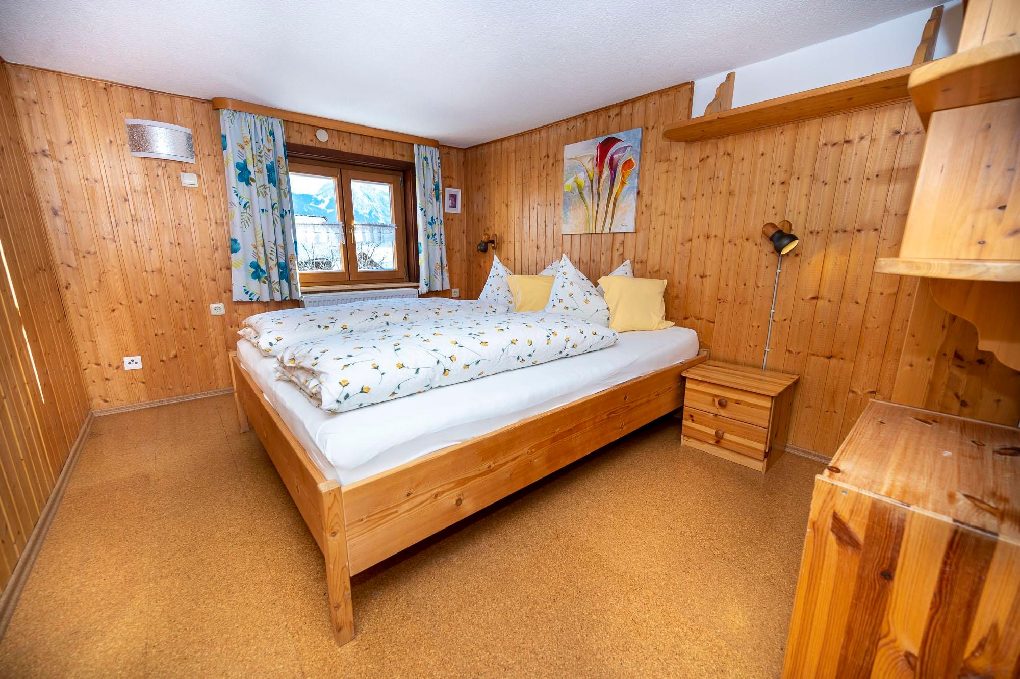 Ruhige, sonnige Lage mit Bergblick. Große Liegewiese mit Liegestühlen und Kinderspielecke. Gemütlicher Aufenthaltsraum mit Kachelofen. Parkplatz am Haus. Abstellraum für Fahrräder und Skier. WLAN kostenlos.