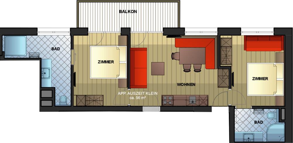 Das Appartement Auszeit verfügt über eine Größe von rund ca. 60 m2. Hier finden 4 bis 7 Personen ausreichend Platz. Mit den 2 Sanitäreinheiten ist das Appartement sehr komfortabel ausgestattet. Bei Bedarf kann das Appartement Auszeit um ein zusätzliches Doppel- bzw. Dreibettzimmer mit Dusche/WC und Balkkon erweitert werden. Dann bietet das Appartement Auszeit groß Platz für 10 Personen und hat eine Größe von rund 90 m2.