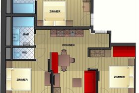 Das Appartement verfügt über 3 Schlafzimmer, 1 x Dusche und WC getrennt und 1 x Dusche/WC. Die Küche ist komplett ausgestattet mit Backrohr, E-Herd mit Cerankochfeld, Geschirrspüler, Wasserkocher, Kaffeemaschine und Kühlschrank mit Gefrierfach. In der Wohnküche befindet sich auch eine Doppelcouch mit Federkernqualität. Telefon, Fön, Flat-TVs, Safe und kostenloses highspeed W-Lan sind selbstverständlich.