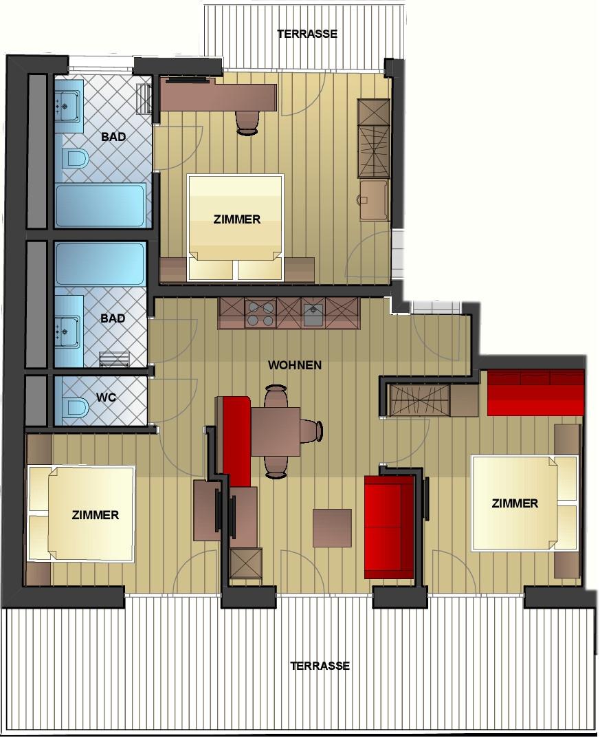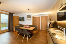 Das Appartement Dorfblick groß bietet genug Platz für bis zu 9 Personen und hat ein Ausmaß von rund 76 m2. Die große Terrasse zur Alleinnutzung lädt zum Verweilen ein. Die Einrichtung ist im alpinen Stil.
