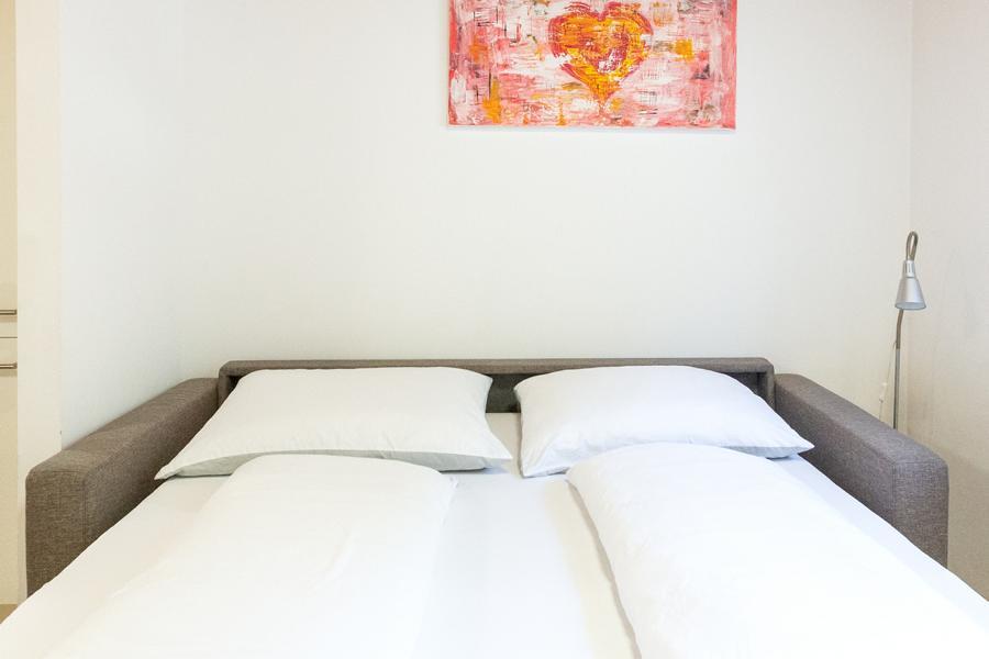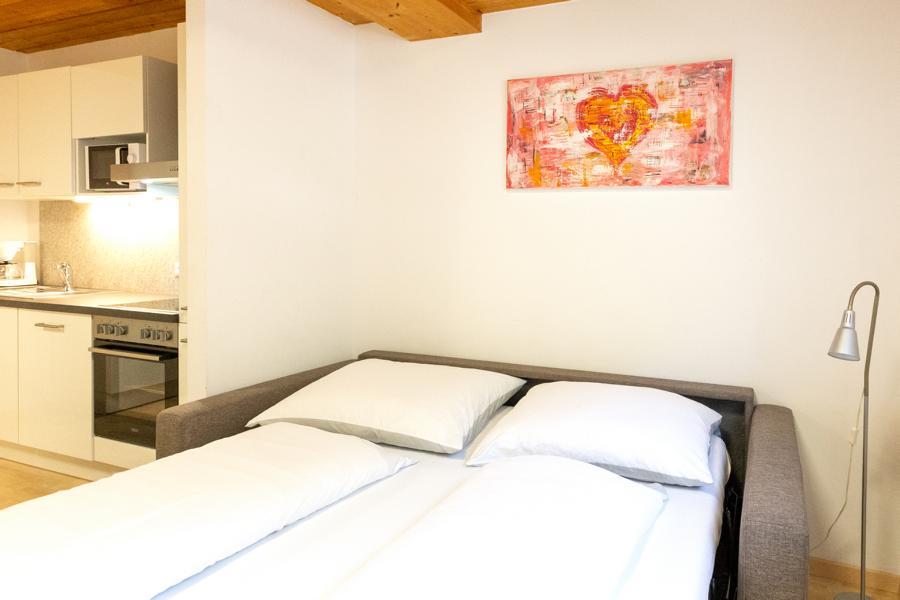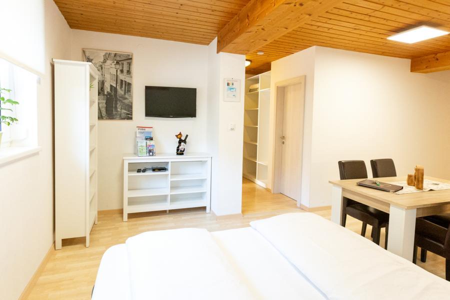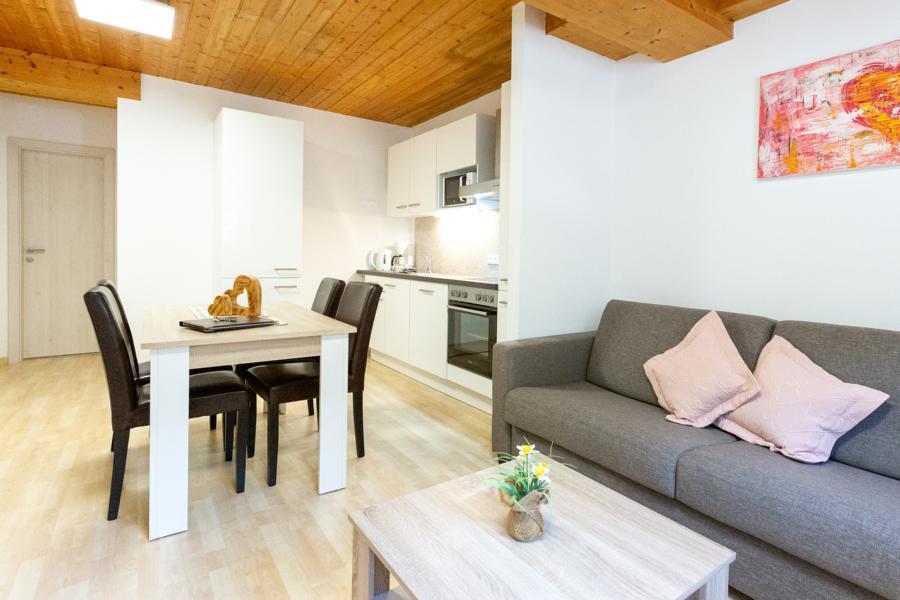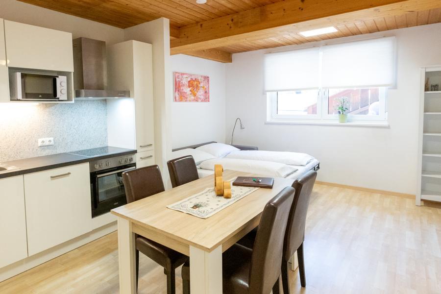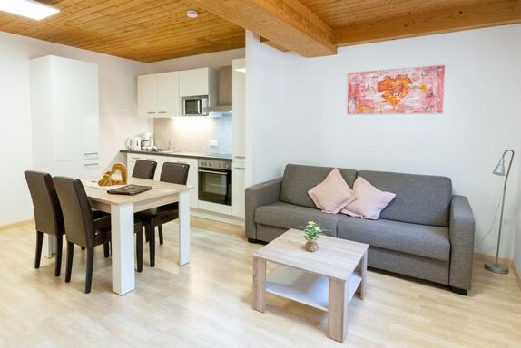 Unser komfortables Apartment im Parterre erstreckt sich über 42 m² und bietet eine ideale Unterkunft für Paare oder kleine Familien. Es verfügt über ein gemütliches Schlafzimmer und eine praktische Schlafcouch (max. 2 Personen) im Wohnbereich, die zusätzlichen Schlafplatz bietet. Zusätzlich bietet unser Apartment eine gemütliche und vollausgestattete Wohnküche. Die Küche beinhaltet Backrohr, Mikrowelle, Kaffeemaschine, Geschirrspüler, Wasserkocher, Gefrierfach, Kühlschrank,...) Das Apartment bietet außerdem ein Badezimmer mit Dusche und WC sowie einen Fön. Außerdem bietet die Ferienwohnung Sitzmöglichkeiten vor der Wohnung an der frischen Luft.