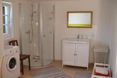 Das geräumige Badezimmer enthält Dusche, Waschbecken, Waschmaschine und eine kleine Bank mit Truhe als Sitz- und Ablagemöglichkeit.