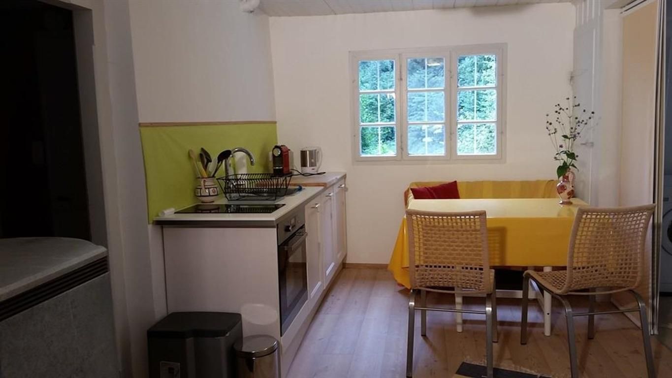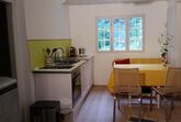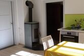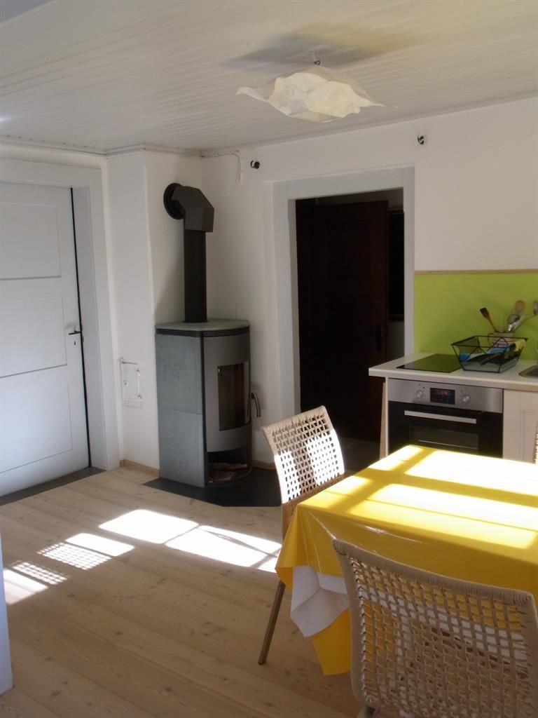 Die Wohnküche ist ausgestattet mit 2-Platten Induktionsherd mit Backröhre, Spülbecken mit Untertischboiler, Kühlschrank mit Gefrierfach, Spülmaschine, Wasserkocher. Wärme spendet ein gemütlicher Holzofen mit Feuersichtfenster. In der Wohnküche steht ein kleines Sitzsofa sowie ein Tisch mit Stühlen.