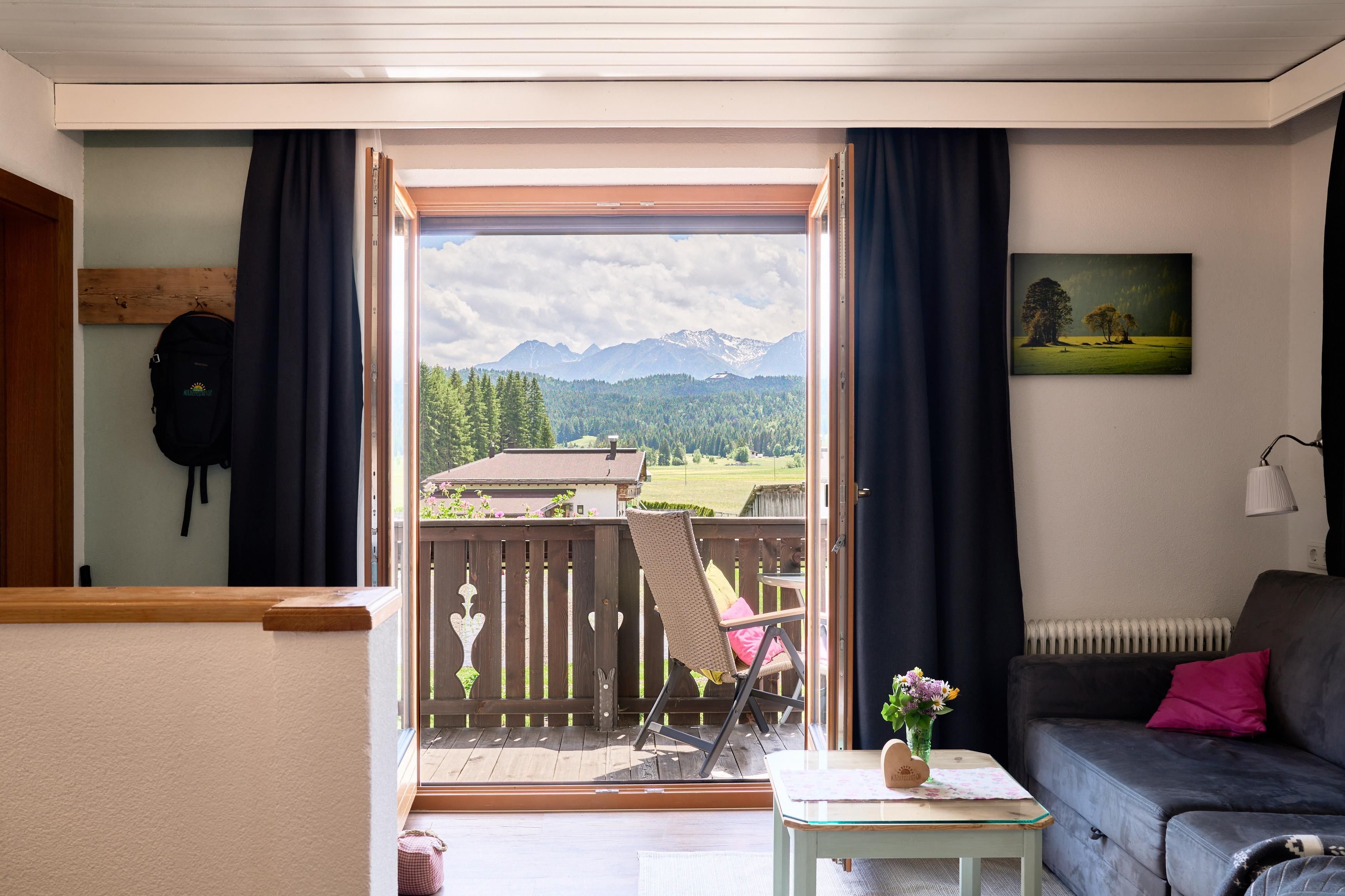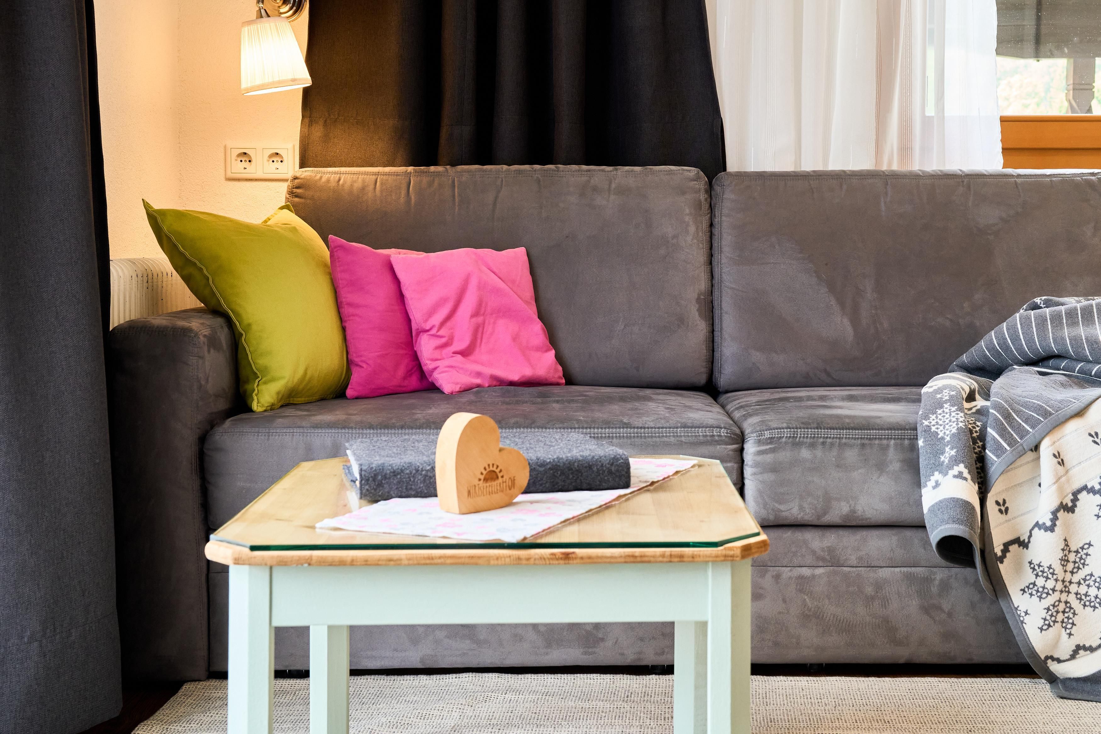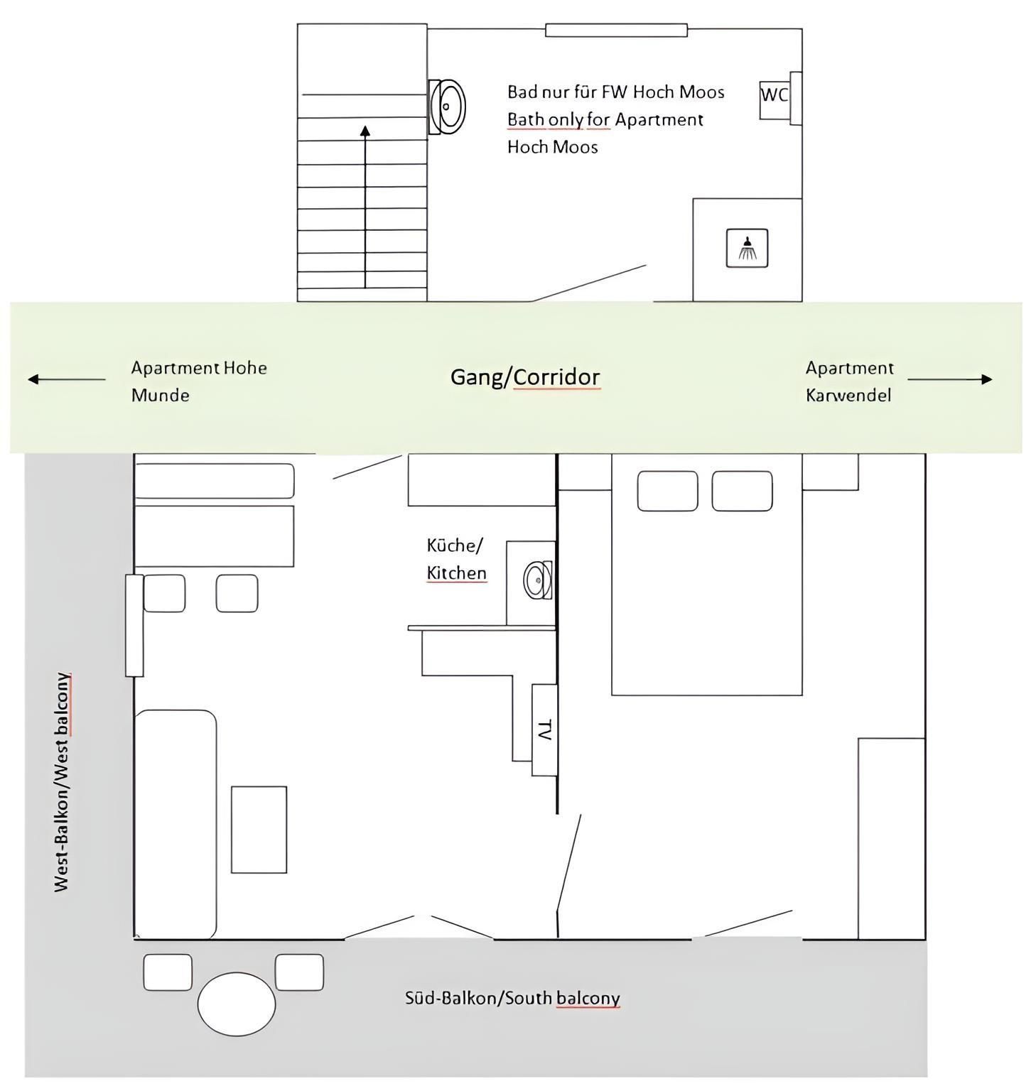 Die Ferienwohnung Hoch Moos verfügt über ein Schlafzimmer, ein gemütliches Wohnzimmer mit Schlafcouch und Kochnische sowie ein Bad mit Dusche und WC. Ein weiteres Highlight ist der wunderschöne Balkon mit Ausrichtung nach Süden und Westen – perfekt, um die Sonne und die herrliche Aussicht zu genießen. Das große Bad ist über einen separaten, ausschließlich von unseren Gästen genutzten Gang erreichbar. Mit ca. 40 m² bietet die Wohnung Platz für bis zu 4 Personen.