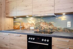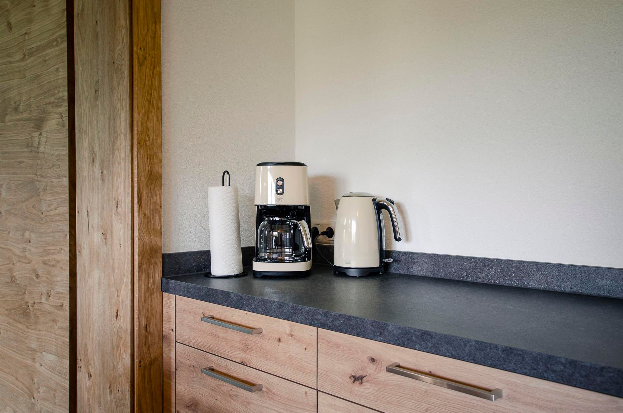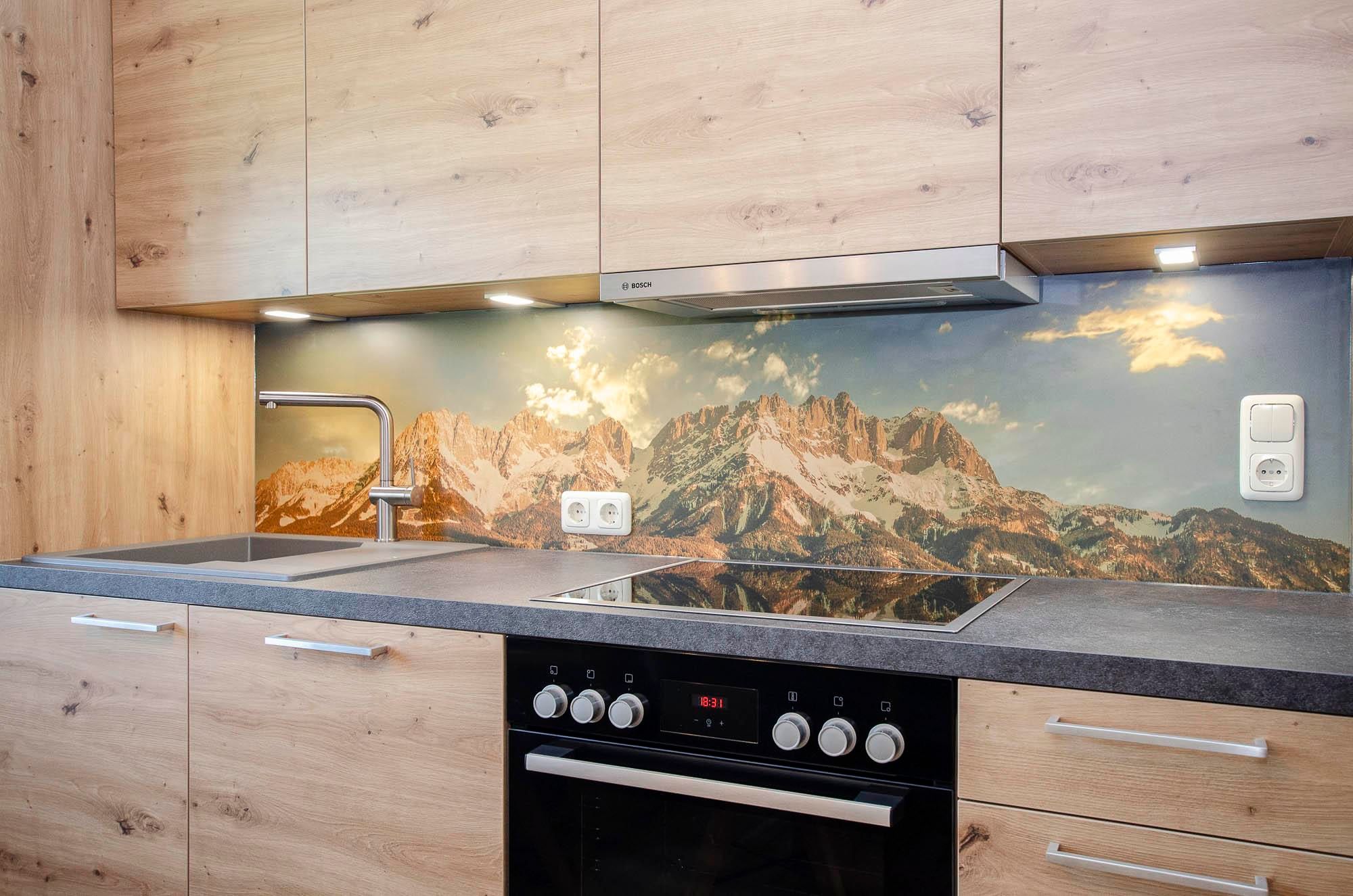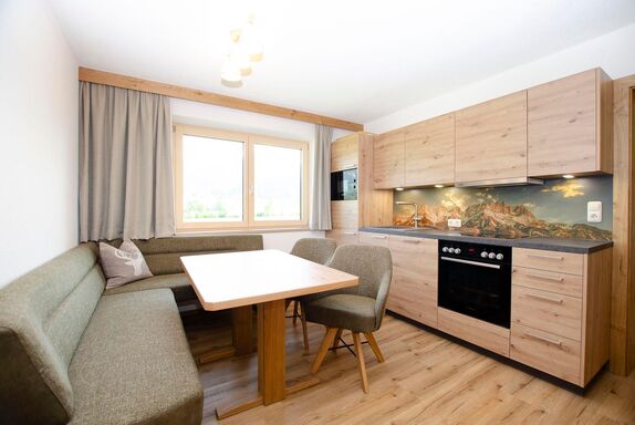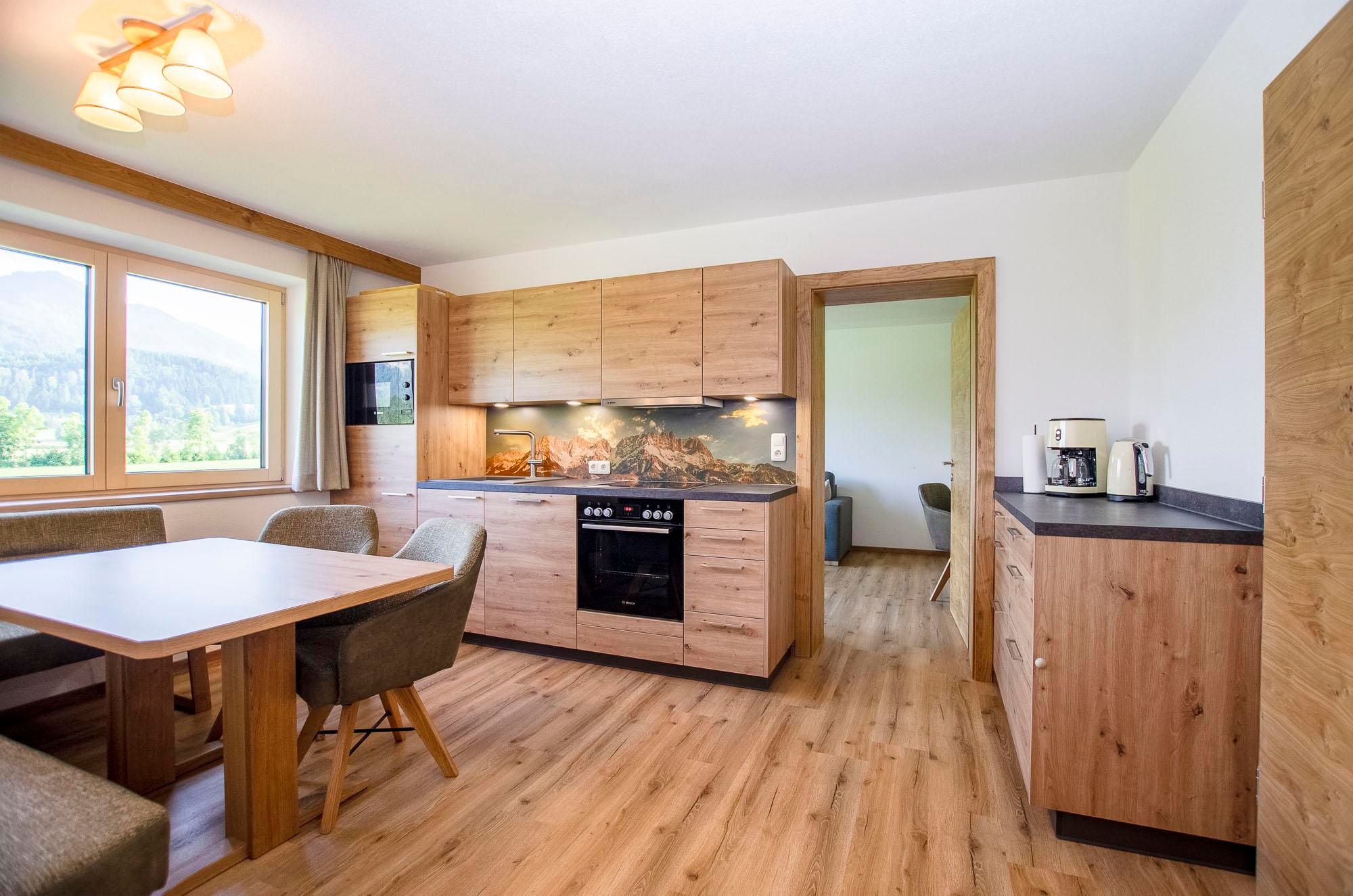 Komplett neu renovierte Ferienwohnung, Küche mit Backofen, Mikrowelle, Geschirrspüler, Kühlschrank incl. Gefrierfach und gemütlicher Eckbank ausgestattet, separates Wohnzimmer mit TV, Schrank, Schreibtisch und großer Couch, die zu einem hochwertigen Bett ausgeklappt werden kann, eigenes Schlafzimmer mit TV und Bad (Fön und Seife vorhanden), privater Balkon mit freiem Blick auf das Kaisergebirge, Brötchenservice
